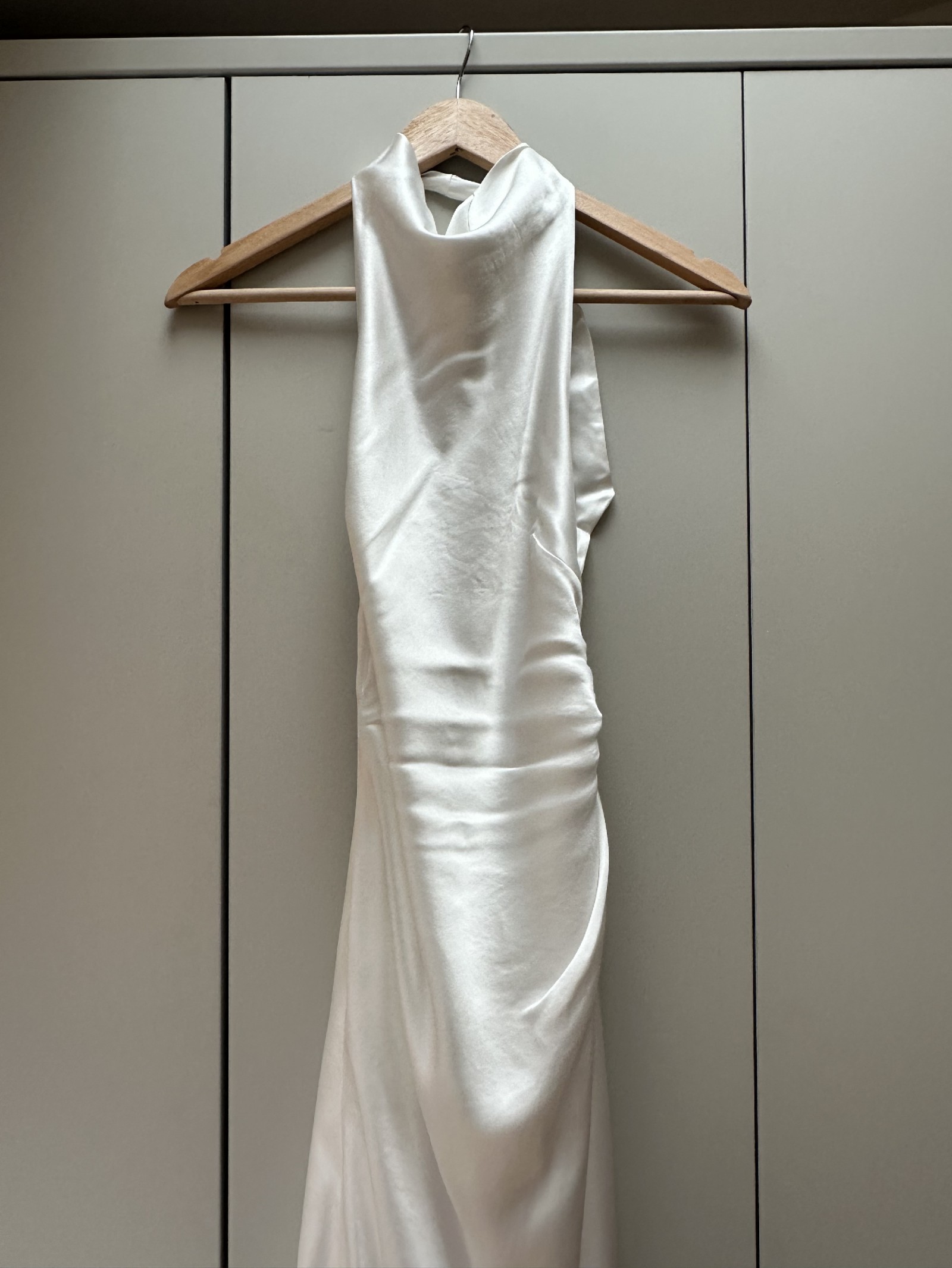 I absolutely loved wearing this Goldie dress — it’s such a timeless, elegant gown that works beautifully in any setting. The pearlescent ivory satin has the most gorgeous soft sheen, and the silhouette is incredibly flattering.