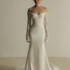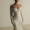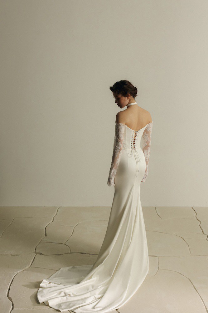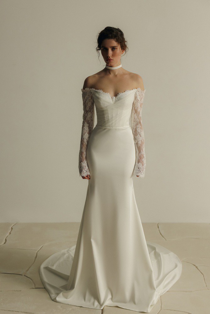 Leif by Eva Lendel, is an off-the-shoulder mermaid wedding dress with a minimalist satin base and a structured, modern silhouette.