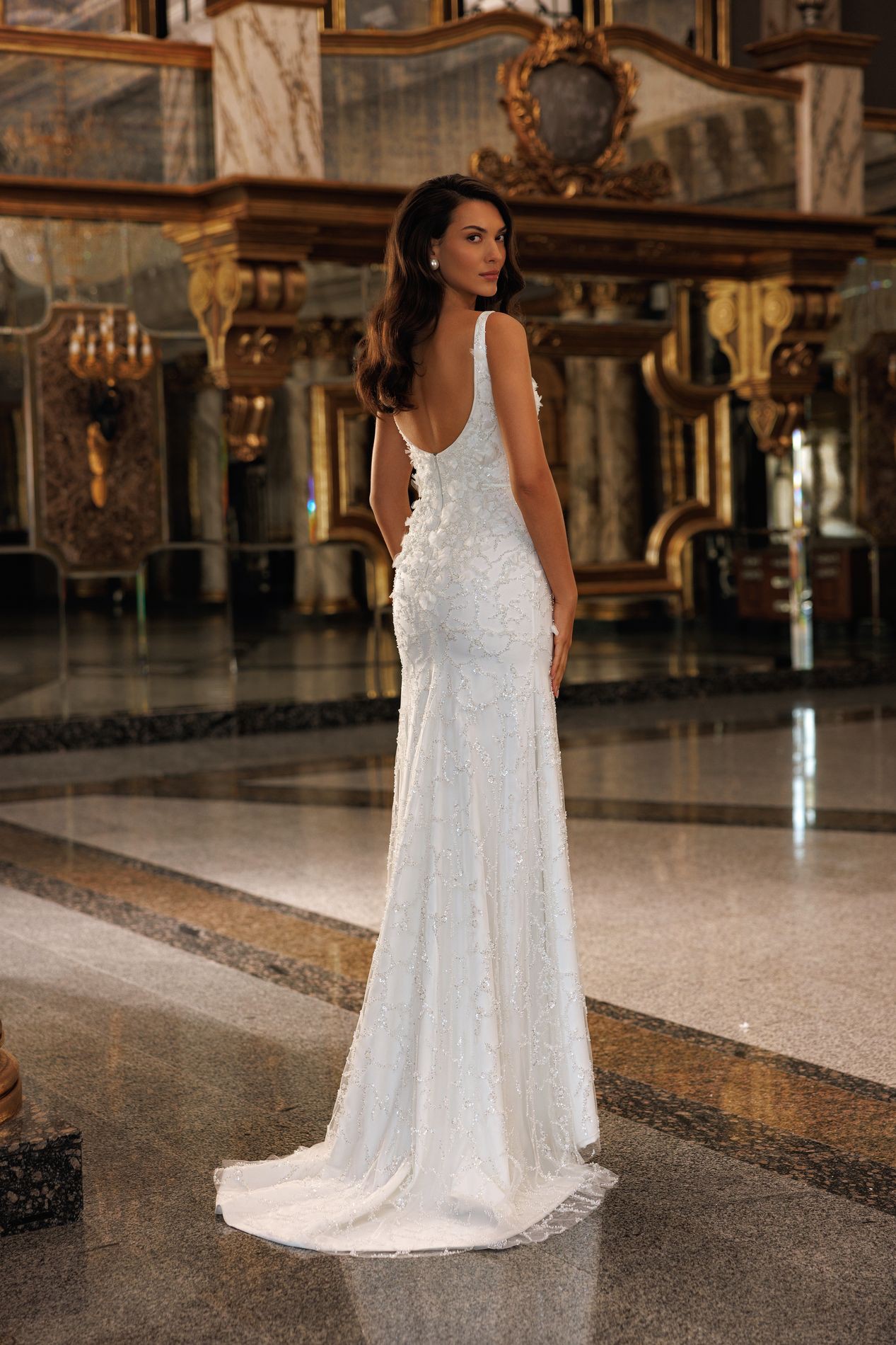 This fitted gown features a deep V-neckline with delicate straps, beautifully sculpting the décolleté while enhancing the silhouette. The entire dress is adorned with intricate beadwork and three-dimensional floral appliqués, creating a luminous, textured effect that catches the light with every movement.