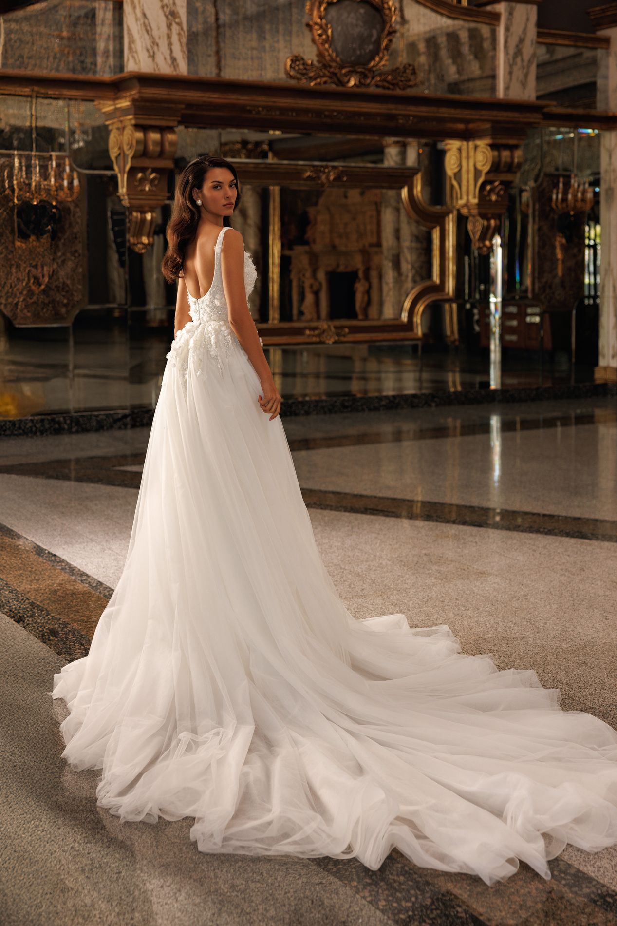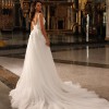 For added drama, the gown is paired with a soft, detachable tulle overskirt that transforms the look into a romantic statement piece. The overskirt flows into a graceful train, offering two distinct bridal styles in one dress — fitted and sultry, or ethereal and voluminous.