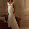This refined gown features a soft V-neckline with delicate draping across the bodice, enhancing the décolleté while creating a flattering, sculpted silhouette. The structured waistline subtly defines the figure, while the asymmetrical draped detailing at the hips adds dimension and modern sophistication.