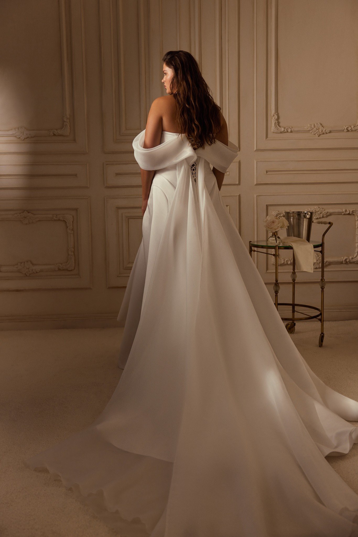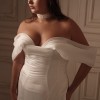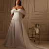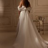 This breathtaking gown features a structured corset bodice with a soft sweetheart neckline, beautifully shaping and supporting the silhouette. The off-the-shoulder draped sleeves add a romantic touch, framing the shoulders with effortless elegance.