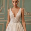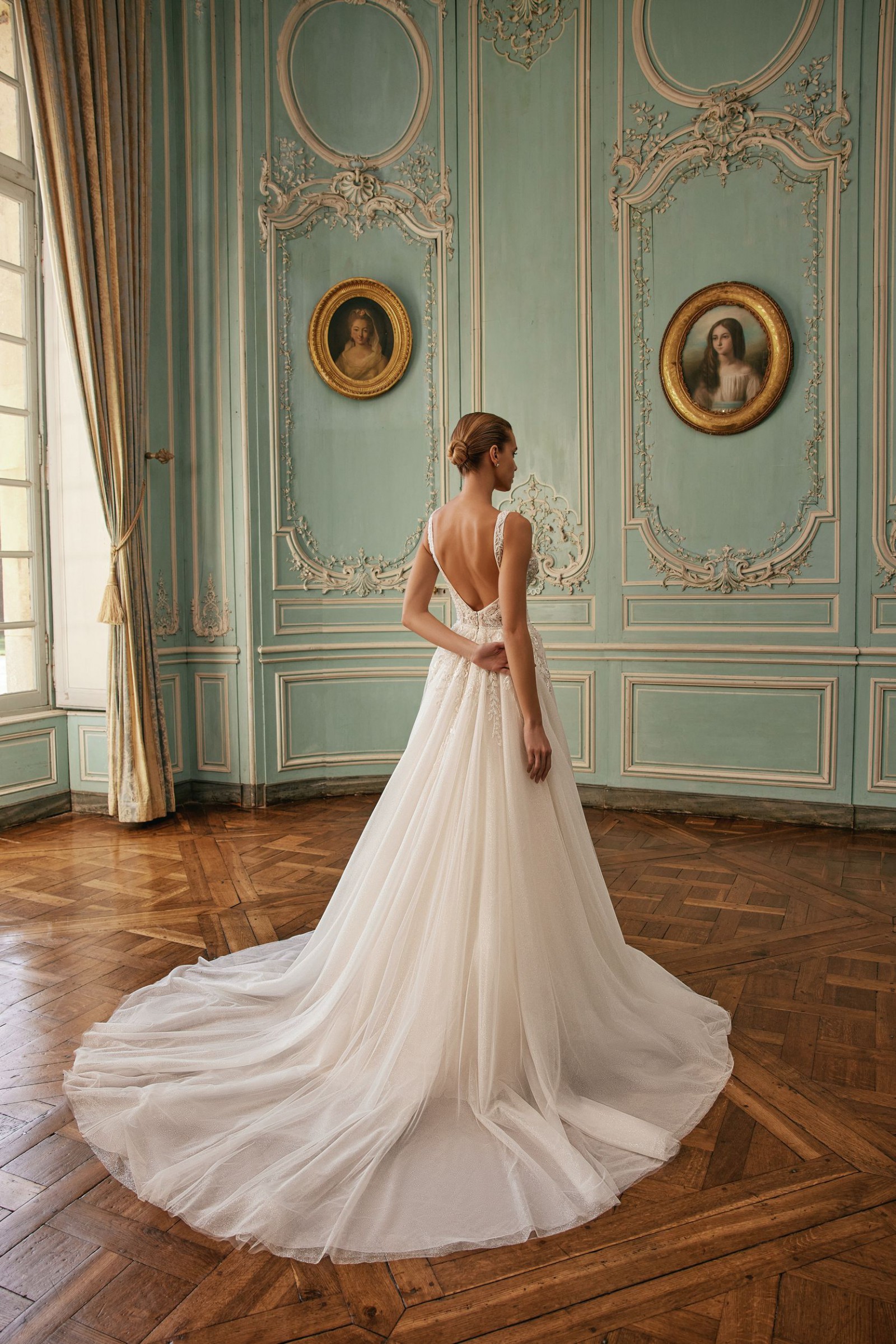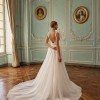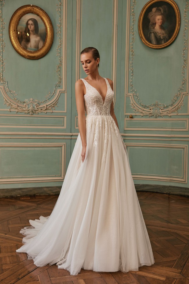 The magic continues with the skirt — crafted in luminous glitter tulle that softly sparkles with every movement. The subtle yet captivating shimmer catches the light beautifully, creating a glowing bridal aura from every angle. The A-line silhouette allows the glittered fabric to flow effortlessly, combining lightness with striking visual impact.