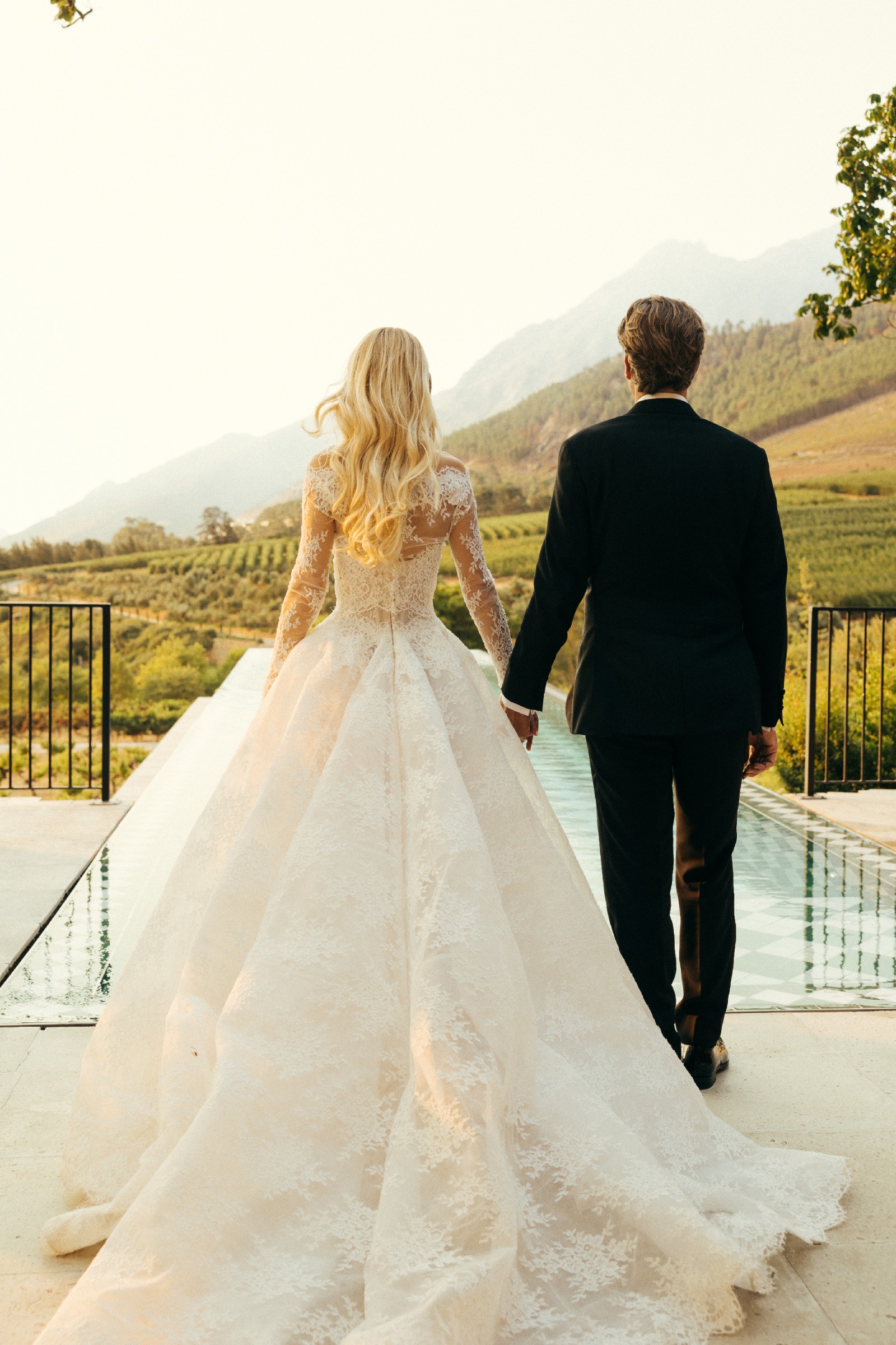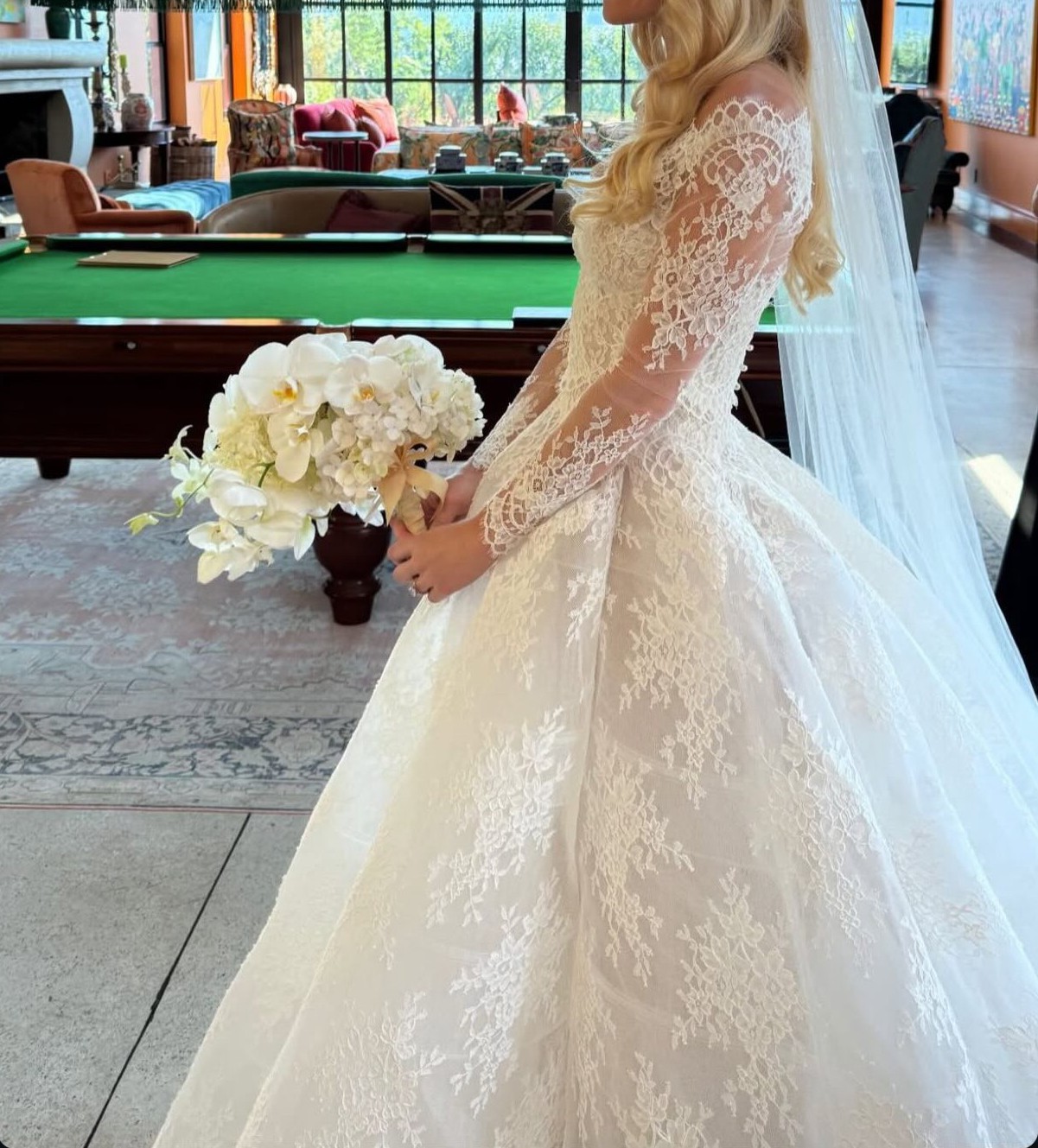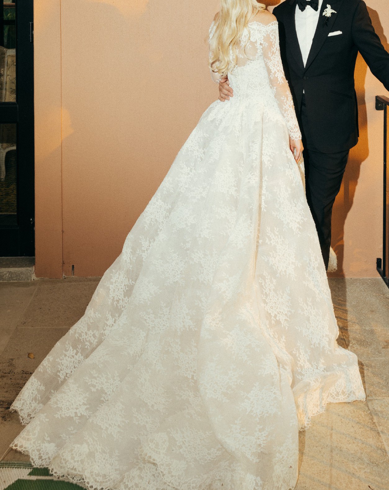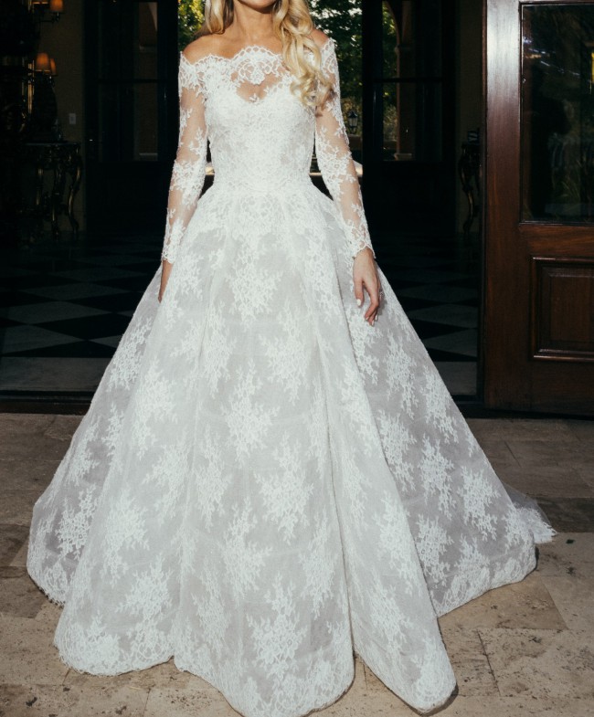 The Bustle: A professional bustle was added by the Monique Lhuillier team, allowing the train to be elegantly pinned up for dancing while maintaining the gown’s beautiful shape.