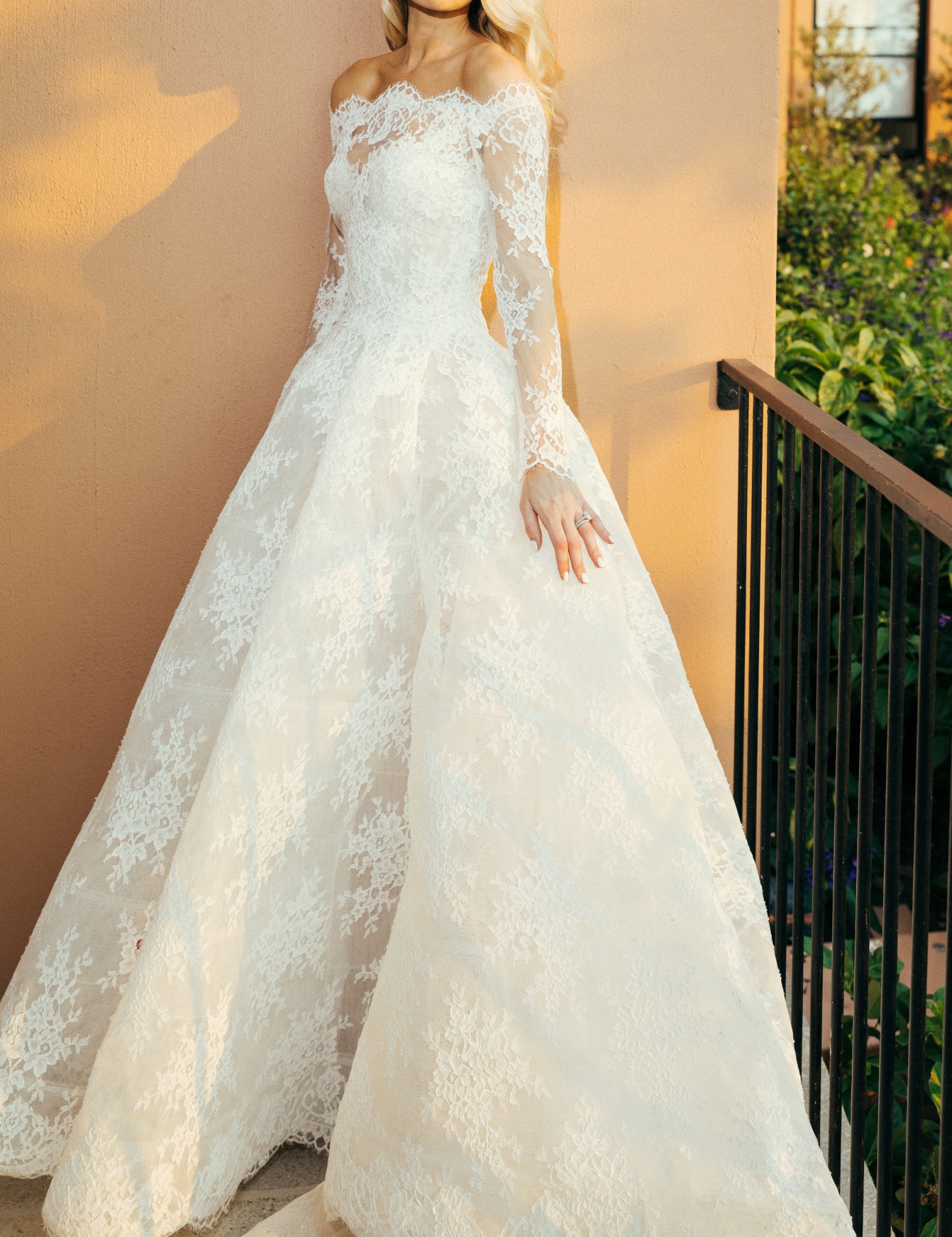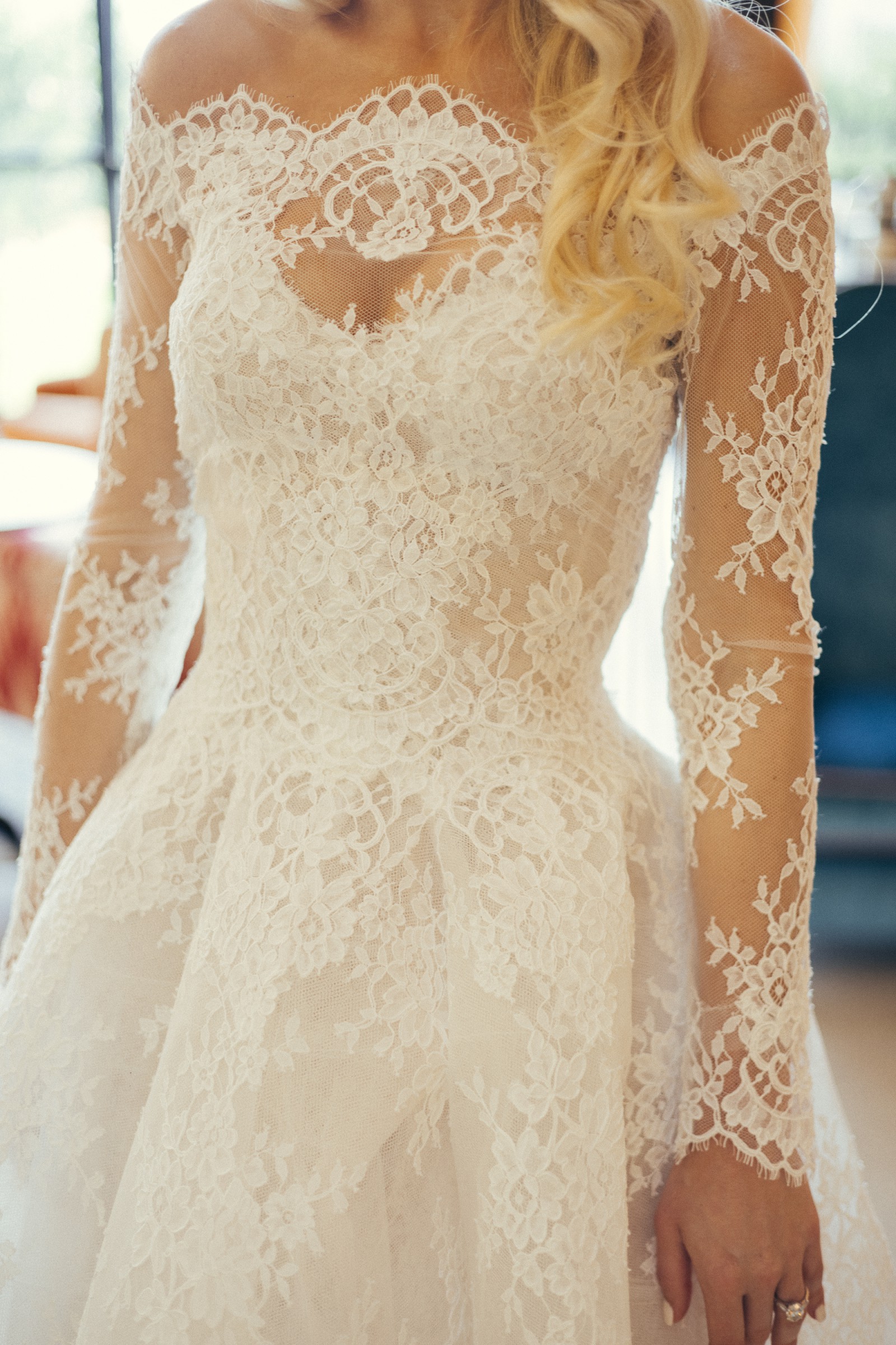 2) Lace Jacket: An off-the-shoulder, long-sleeved lace jacket with pearl buttons down the back that provides two distinct looks for your ceremony and reception.