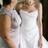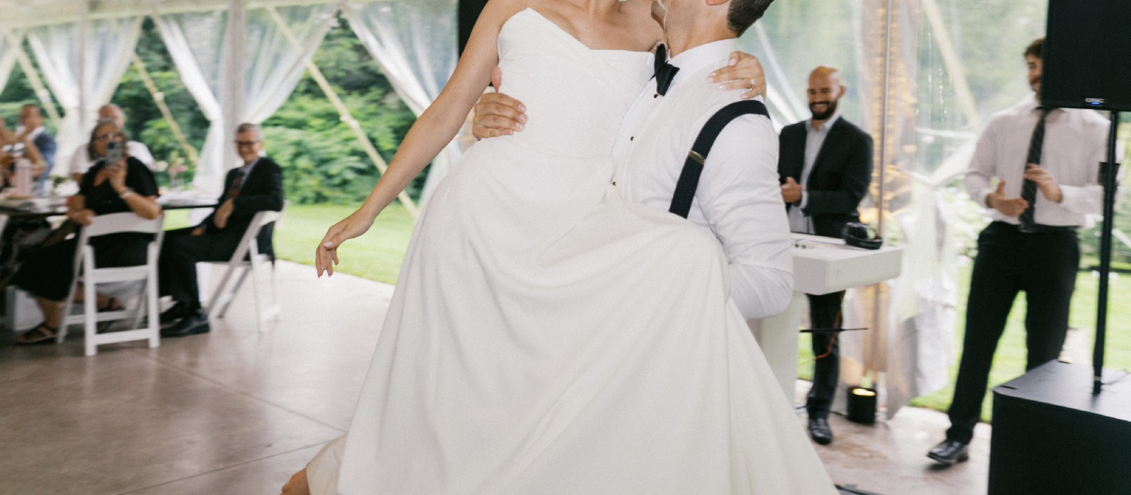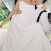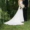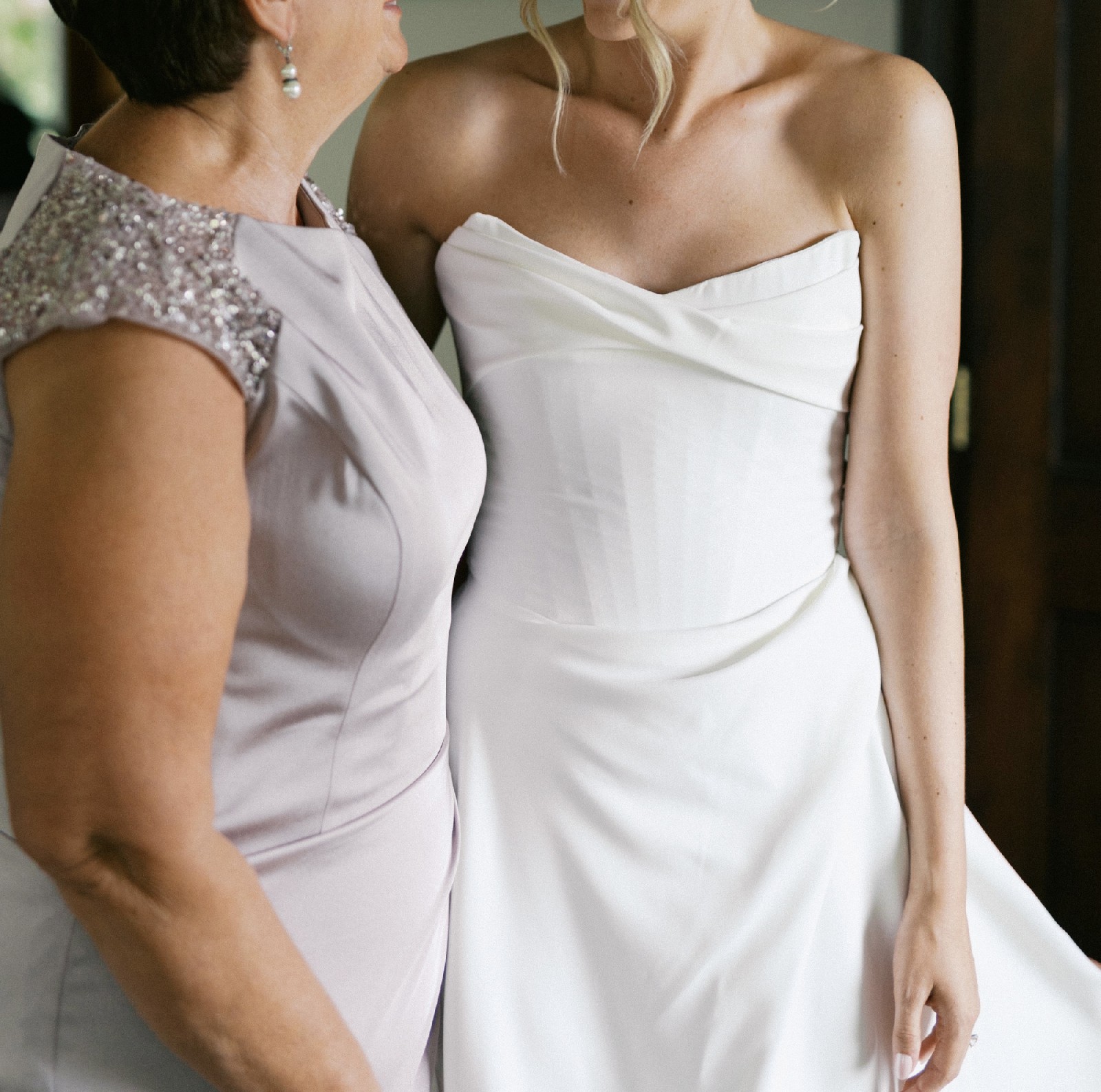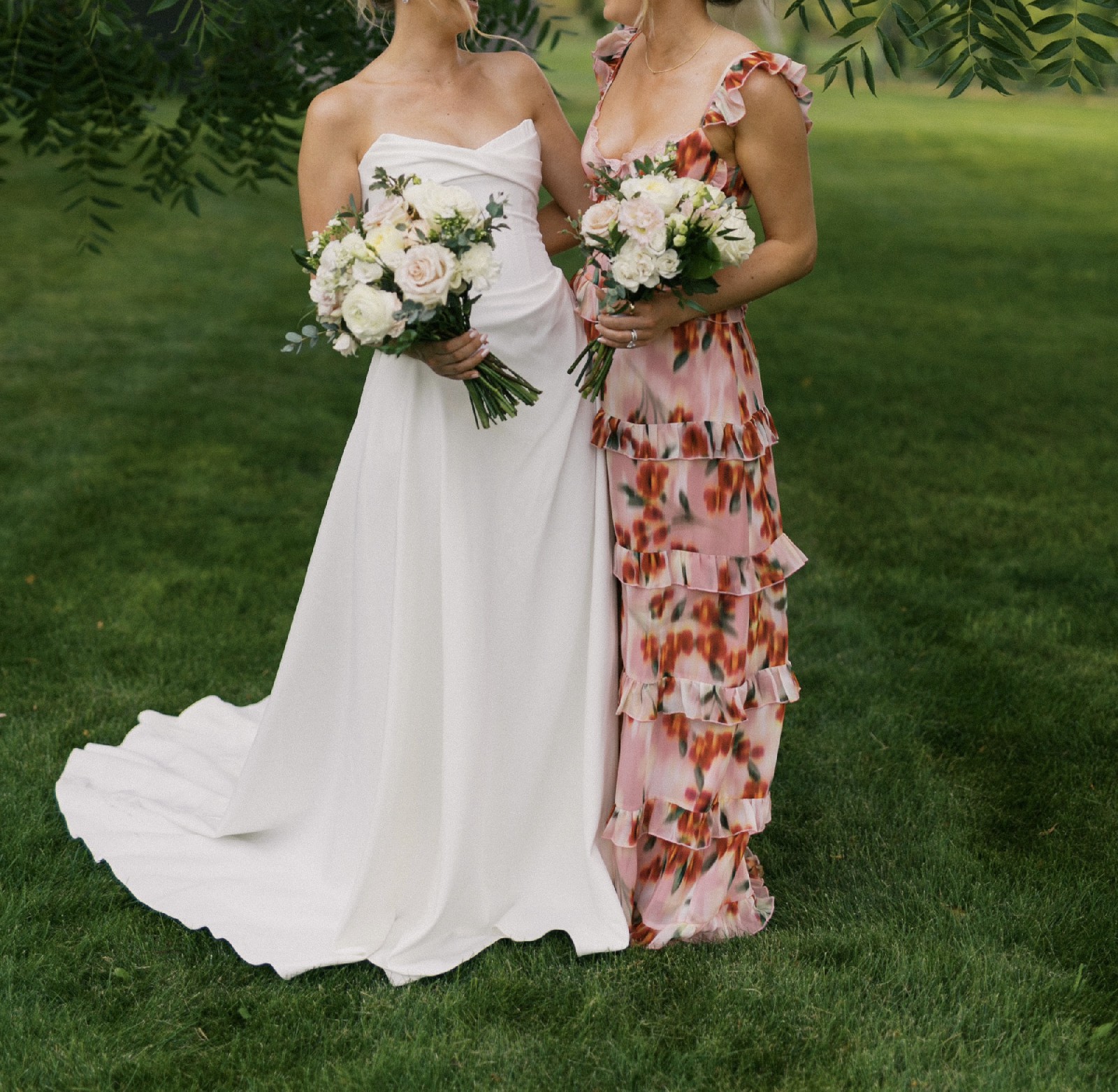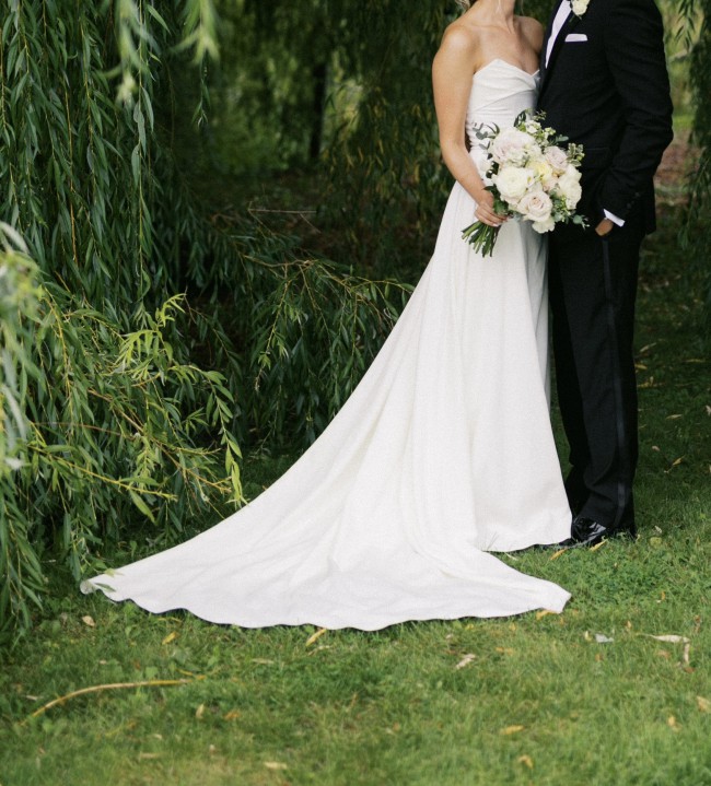 A modern, minimalist strapless wedding dress featuring a structured corset bodice with delicate ruching and a dramatic drop waist. It is designed with a flow-through, A-line skirt, creating a sleek yet romantic silhouette made from a proprietary, slightly stretchy fabric.