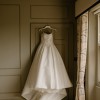 This is a stunning white wedding dress with a classic ball gown silhouette. The strapless bodice has a flattering shape that leads into a voluminous skirt. The dress features a slight sweetheart neckline and delicate seams along the back, accentuating the figure. The fabric is smooth and luxurious, creating an elegant flow throughout. The back of the dress has a traditional lace-up detail, adding a touch of romance and adjustment flexibility. This dress is ideal for a formal, timeless wedding or special event.