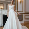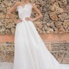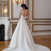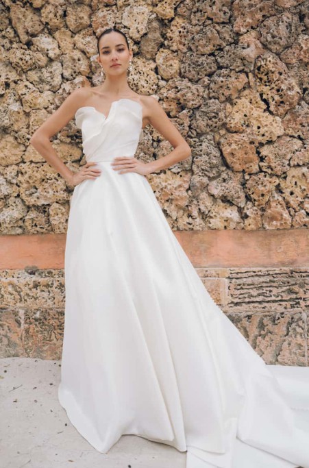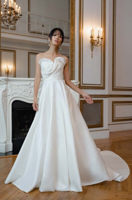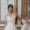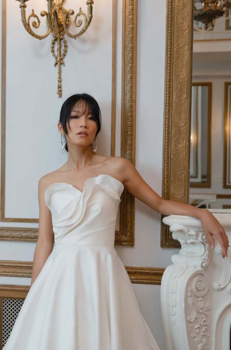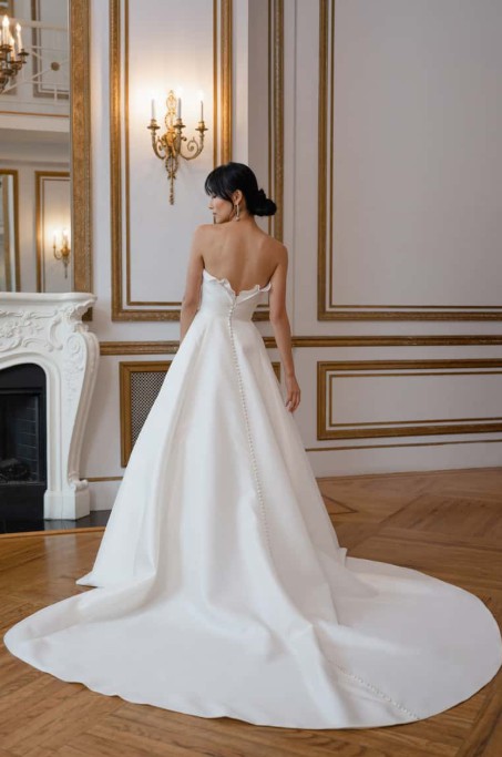 The Celine gown, cut in our luxuriously light new Italian taffeta fabric, is as intricate as she is strikingly simple. The sculpted bodice echoes the delicate petals of a rose, and is balanced by a beautifully full circle cut ball skirt. Covered buttons to the hem add a classic bridal detail to this timeless gown.