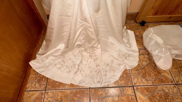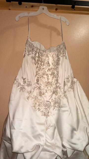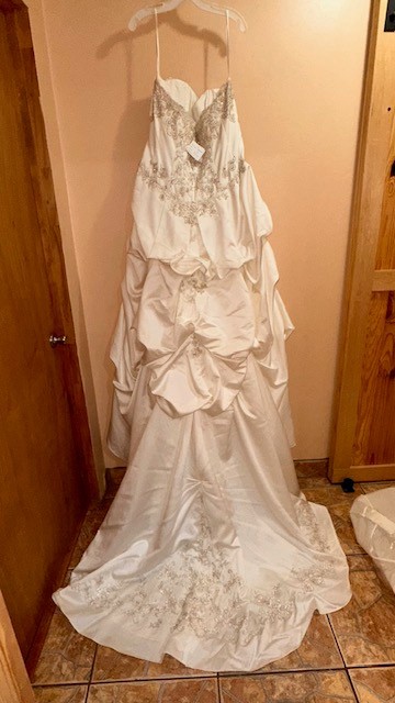 With a mid-back design and strapless silhouette, this gown offers a sophisticated yet comfortable fit, allowing you to move with grace throughout your special day. The voluminous skirt cascades effortlessly, providing an enchanting and dramatic effect as you embrace your fairy-tale moment. Size 18 ensures that this gown accommodates curves while celebrating your unique beauty.