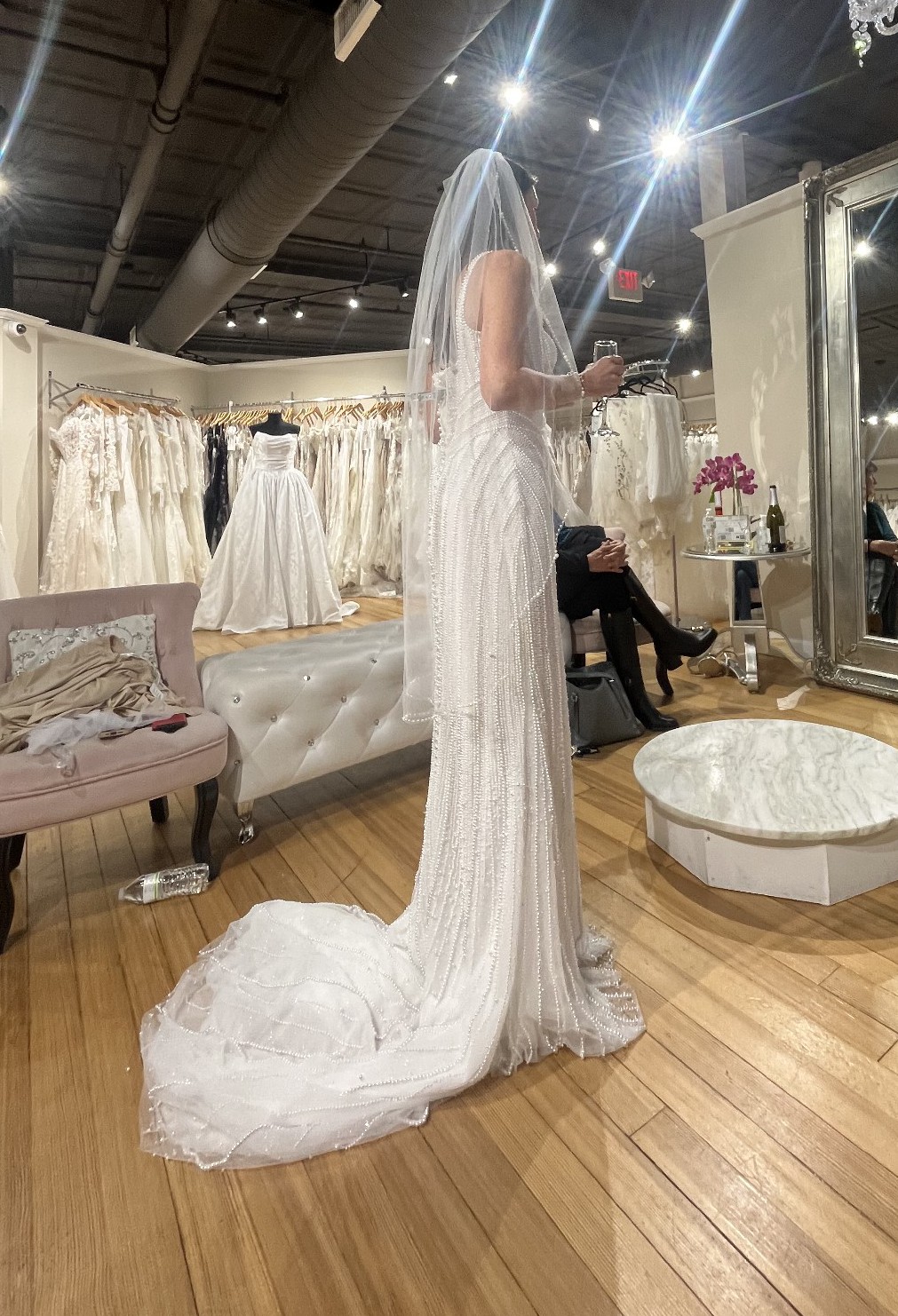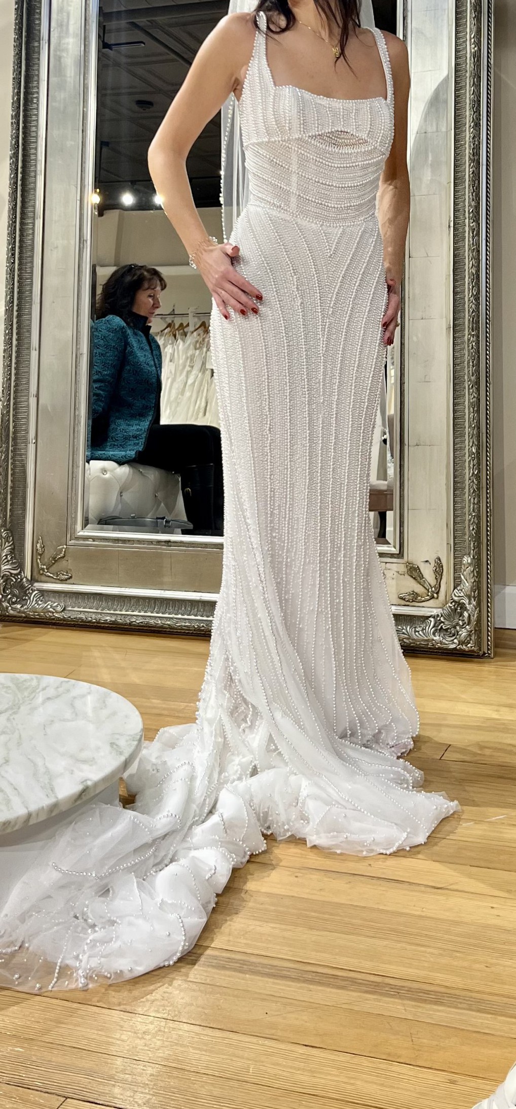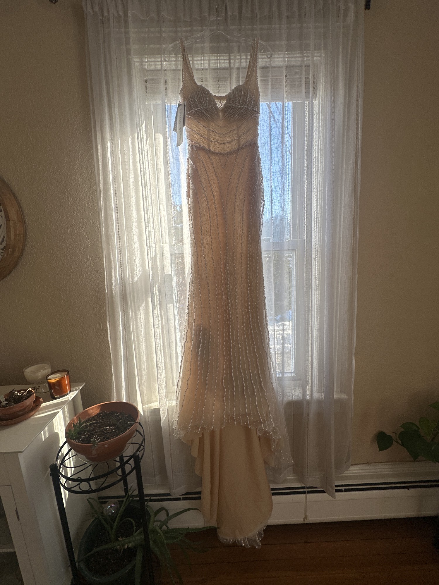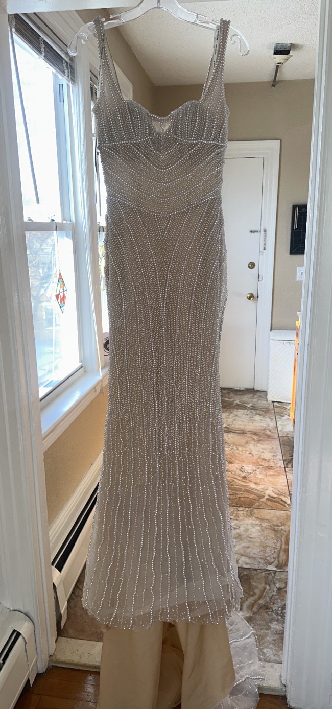 This is the Maggie Sottero Danica dress with a custom nude lining for a more vintage look. I was inspired by a much more expensive dress with pearls. This was for a destination wedding in Spain.