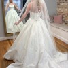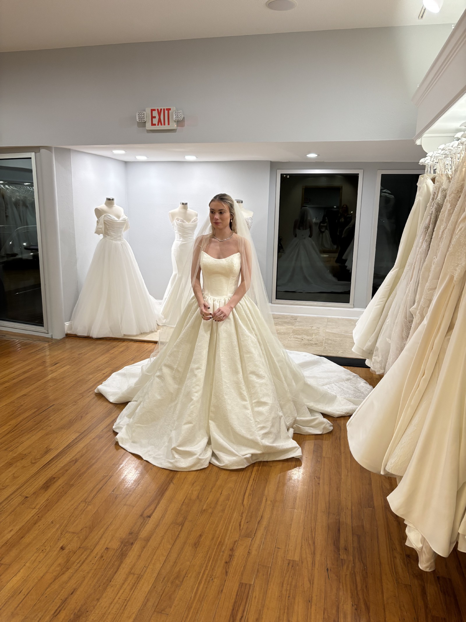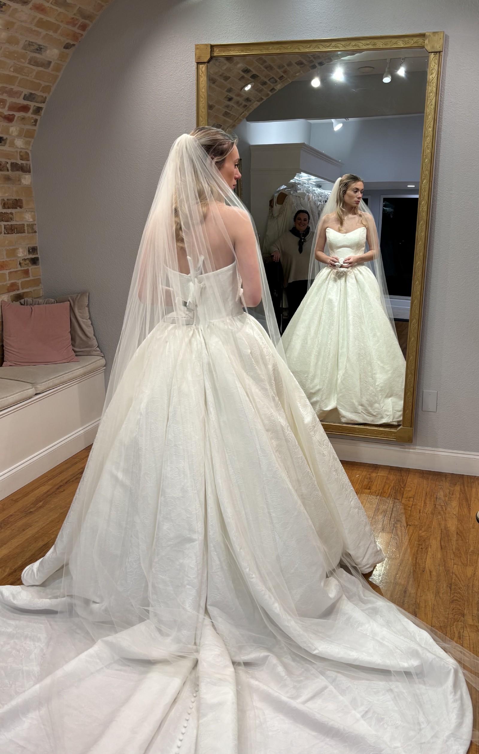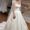 Crafted from elegant jacquard fabric, the dress has a subtle woven texture that adds depth and sophistication while keeping the look timeless and refined. The full skirt flows into a dramatic train and includes hidden pockets, combining classic bridal style with modern practicality.