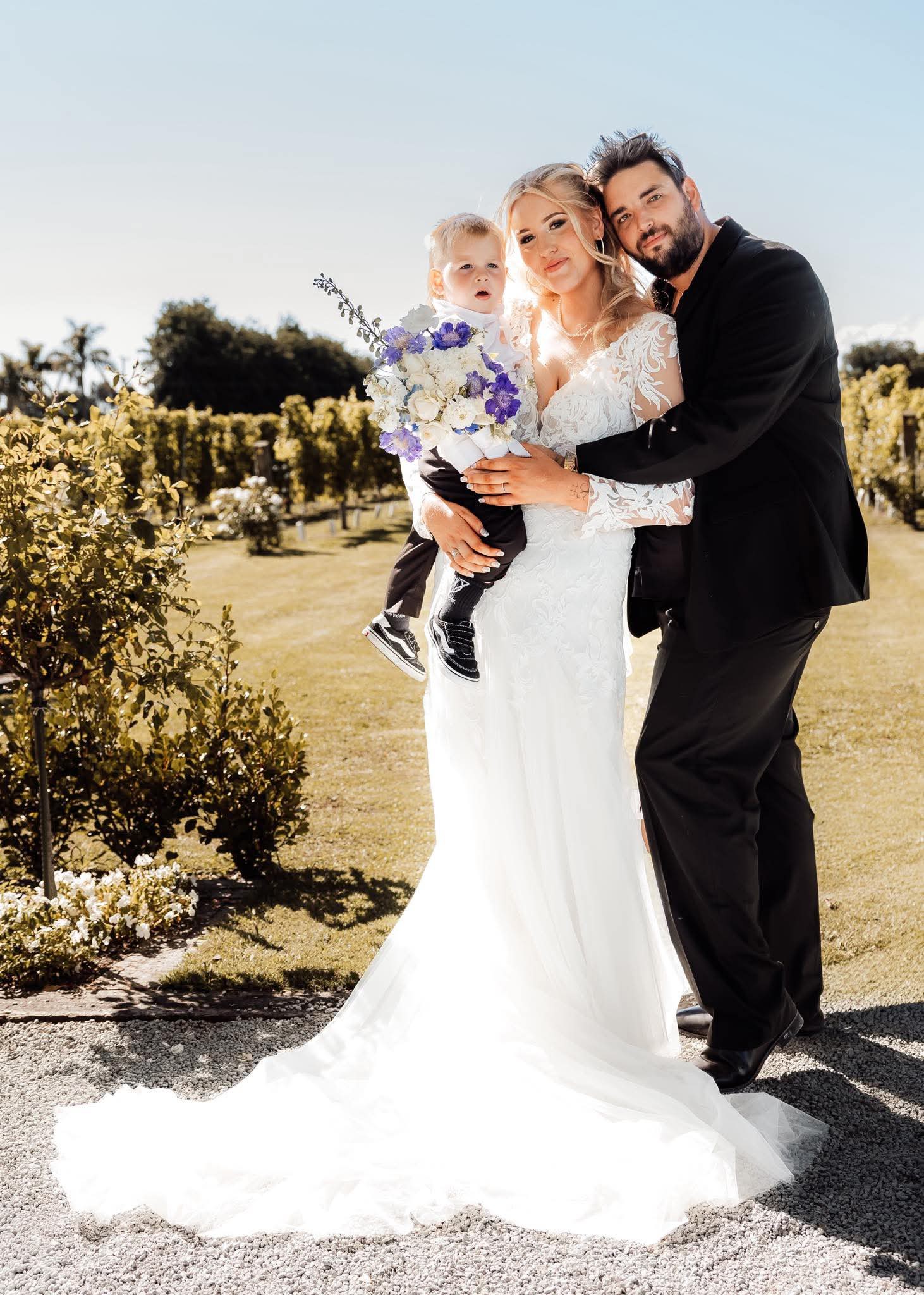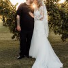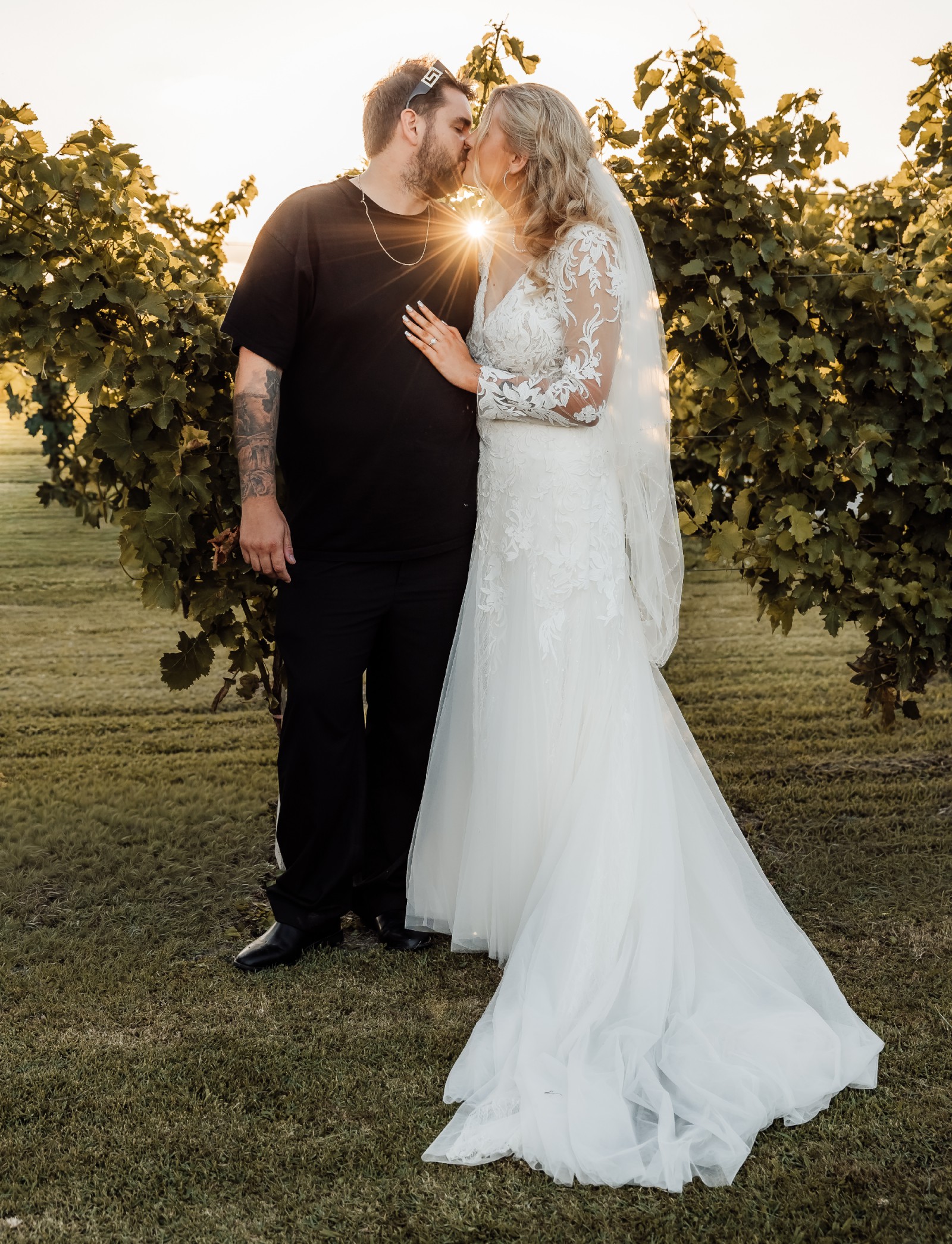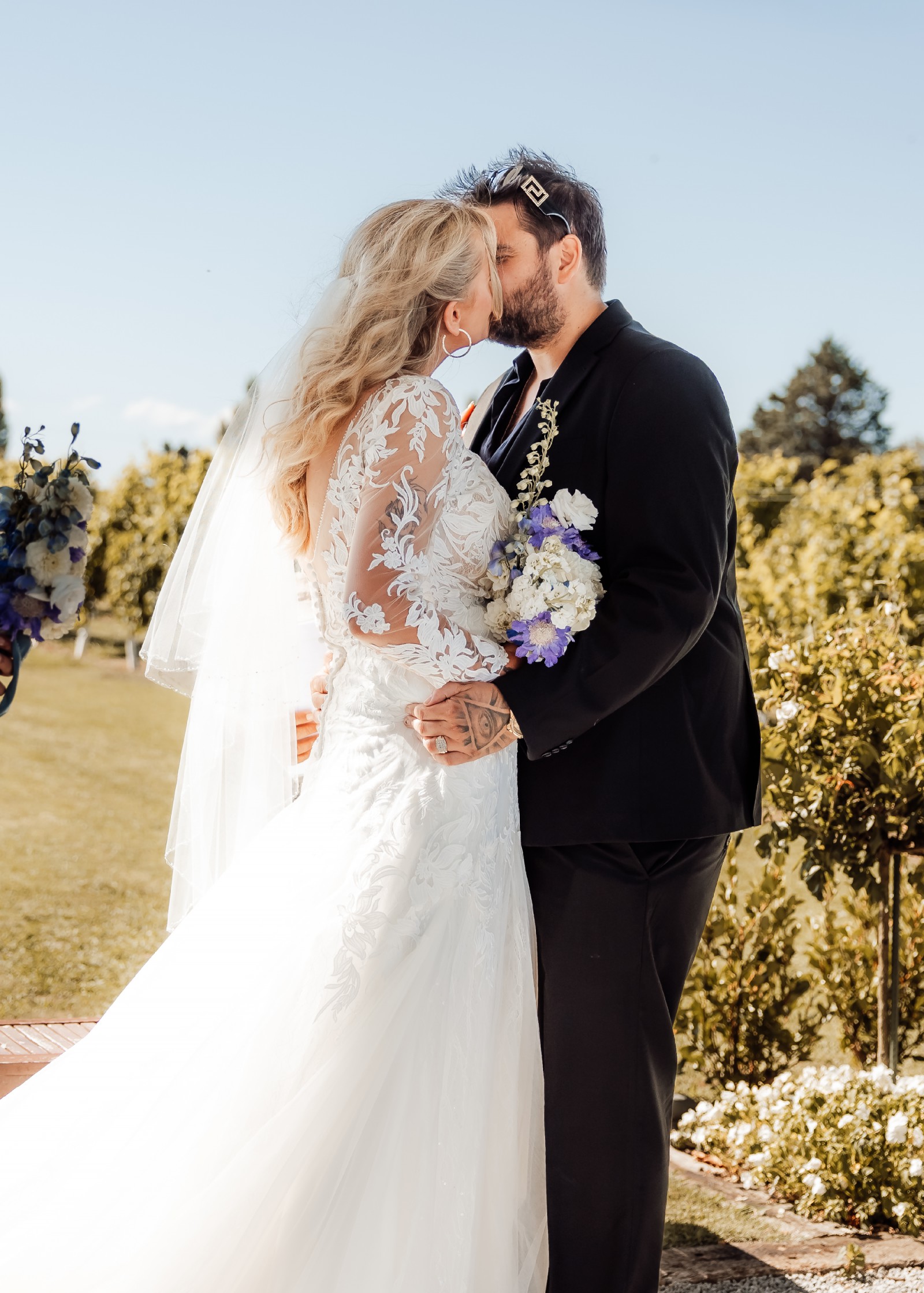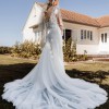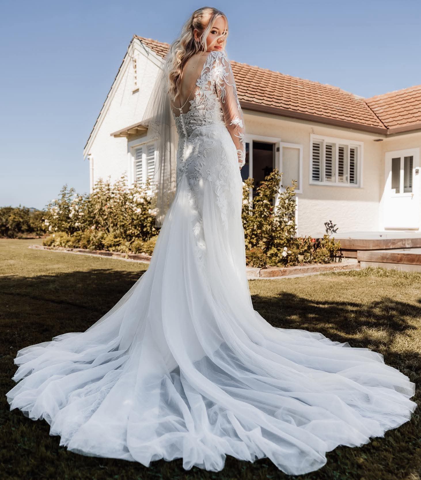A classic mermaid with unexpected details, our Dakota designer wedding dress is statuesque with bold Venice lace appliqués artfully placed on the gown. The sculptured v-neckline and illusion long sleeves add a touch of romance, and with sheer back detailing and a gorgeous godet skirt, this dress is sure to stun.
