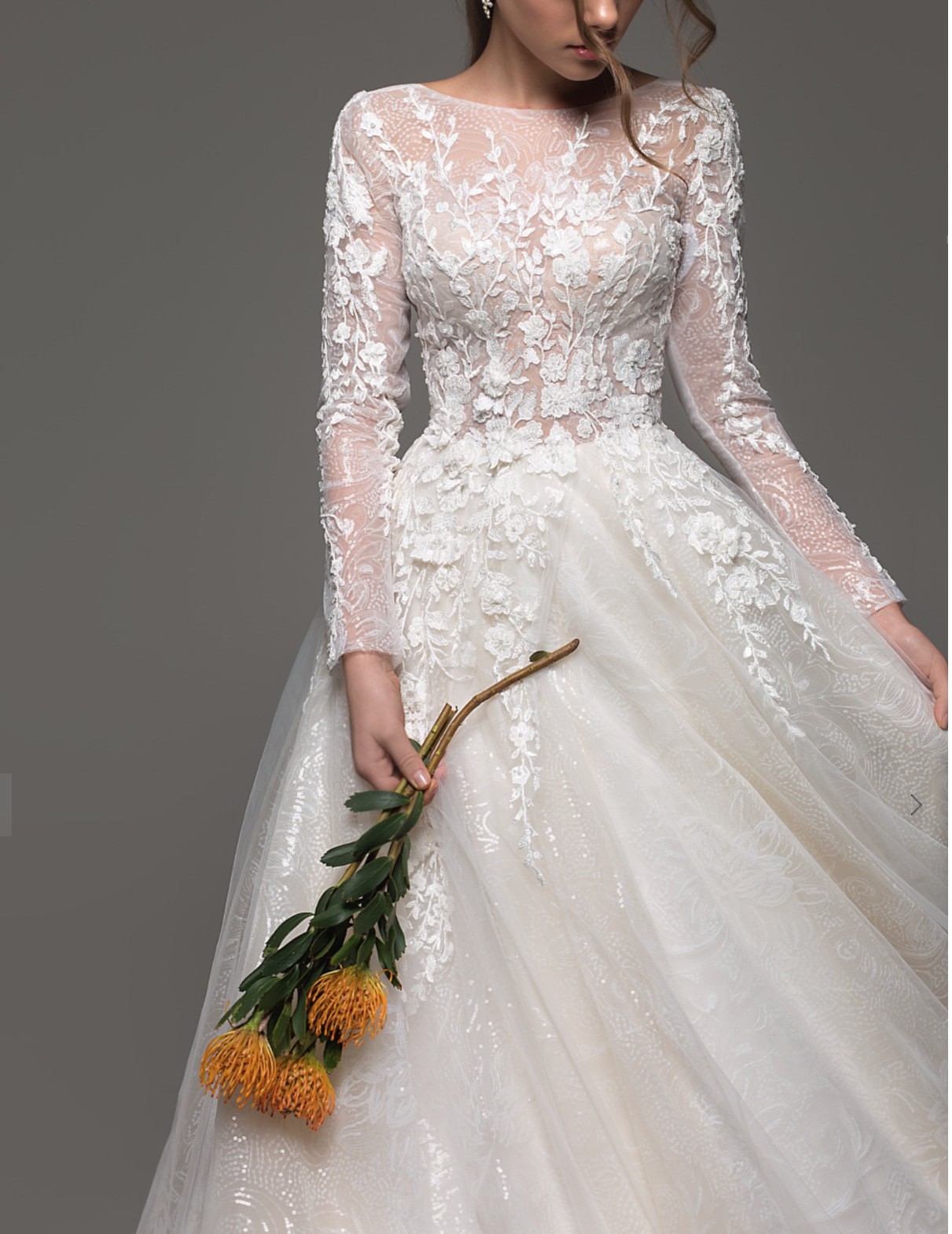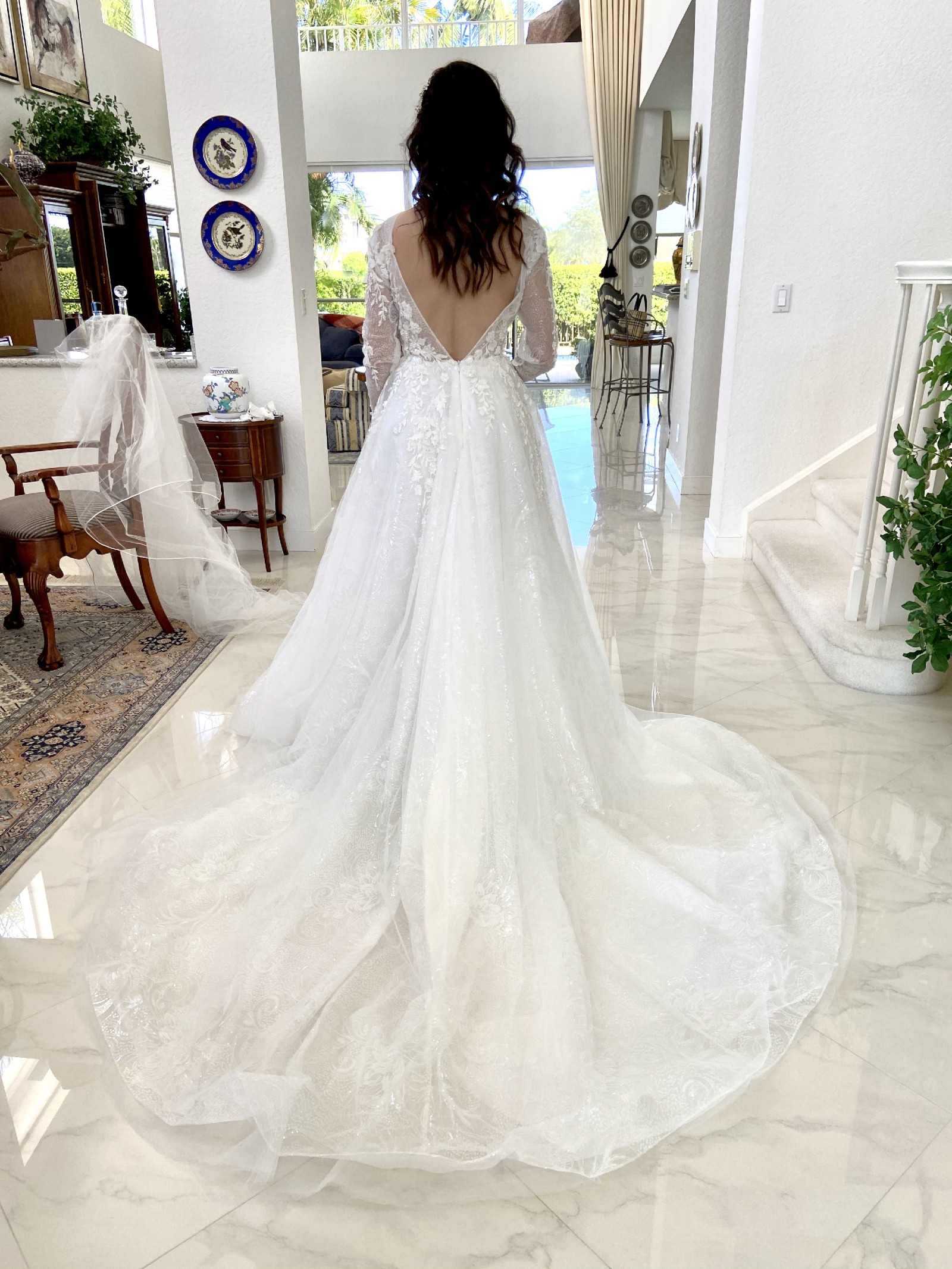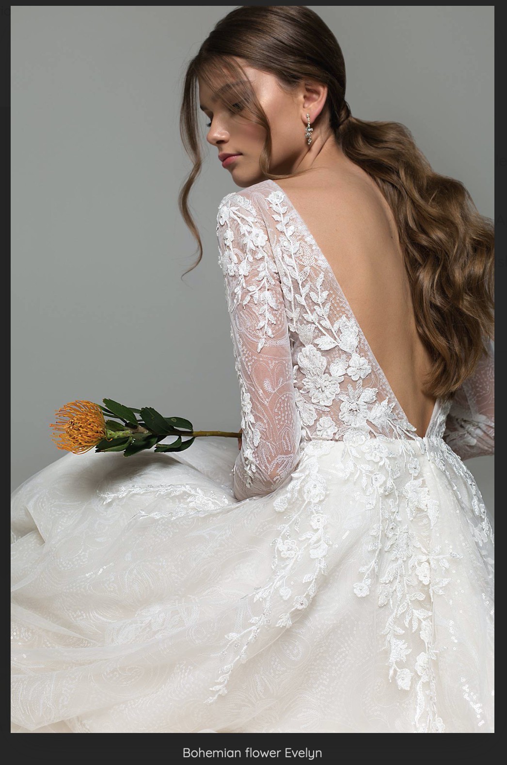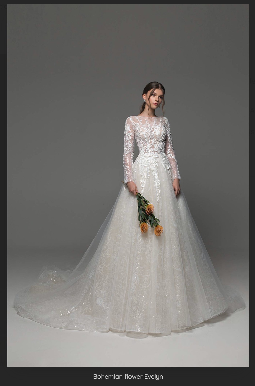 This never worn or altered wedding dress by Ukrainian designer Eva Mendel, the Evelyn from the Bohemian flower collection features an A-line silhouette, boat neck front and low back with long sleeves. Lace is delicate with embellishments and flowers. The bottom with layers of tulle that sparkle and the long train is truly dramatic. I felt like a princess. Never got to wear it and would love for this beautiful gown to go to a lovely bride instead of hanging in my closet, I hope you love it as much as I do. It fit me perfectly, so no alterations were needed for me. I am 125 lbs, pear shaped and 5'4" for reference. Would have work it with 3 inch heals.