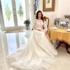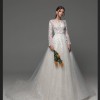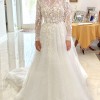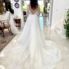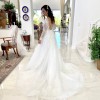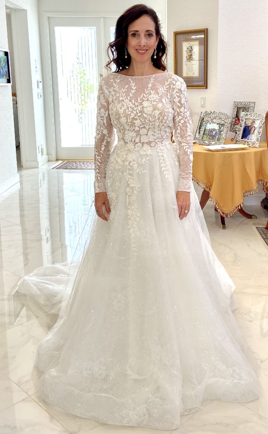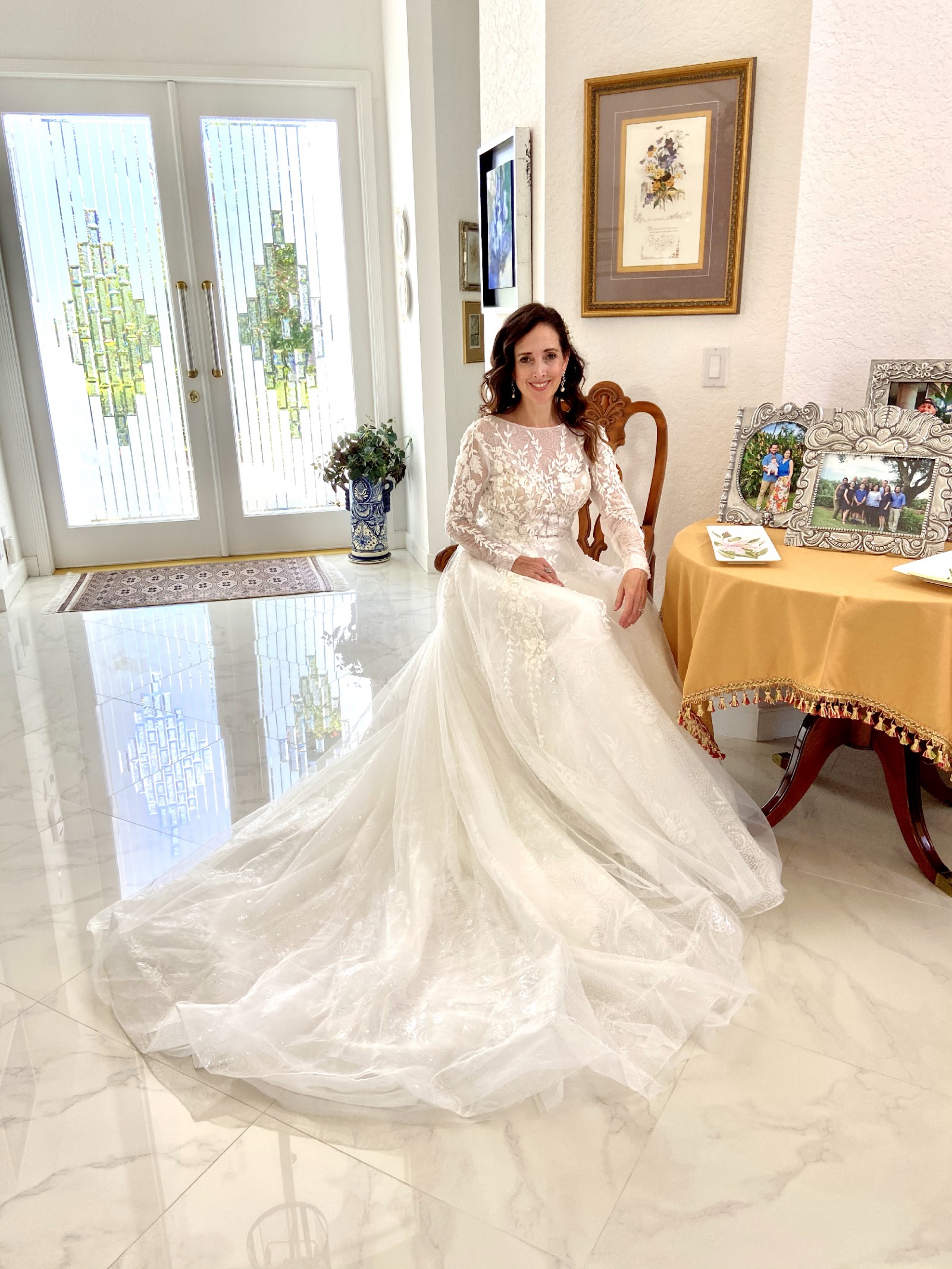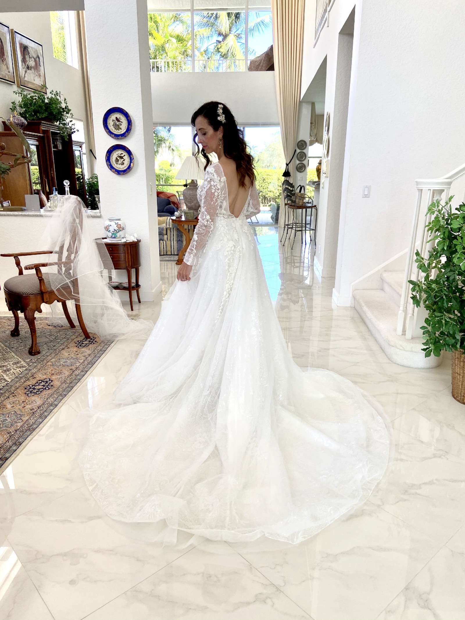 This never worn or altered wedding dress by Ukrainian designer Eva Mendel, the Evelyn from the Bohemian flower collection features an A-line silhouette, boat neck front and low back with long sleeves. Lace is delicate with embellishments and flowers. The bottom with layers of tulle that sparkle and the long train is truly dramatic. I felt like a princess. Never got to wear it and would love for this beautiful gown to go to a lovely bride instead of hanging in my closet, I hope you love it as much as I do. It fit me perfectly, so no alterations were needed for me. I am 125 lbs, pear shaped and 5'4" for reference. Would have work it with 3 inch heals.
