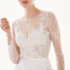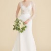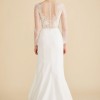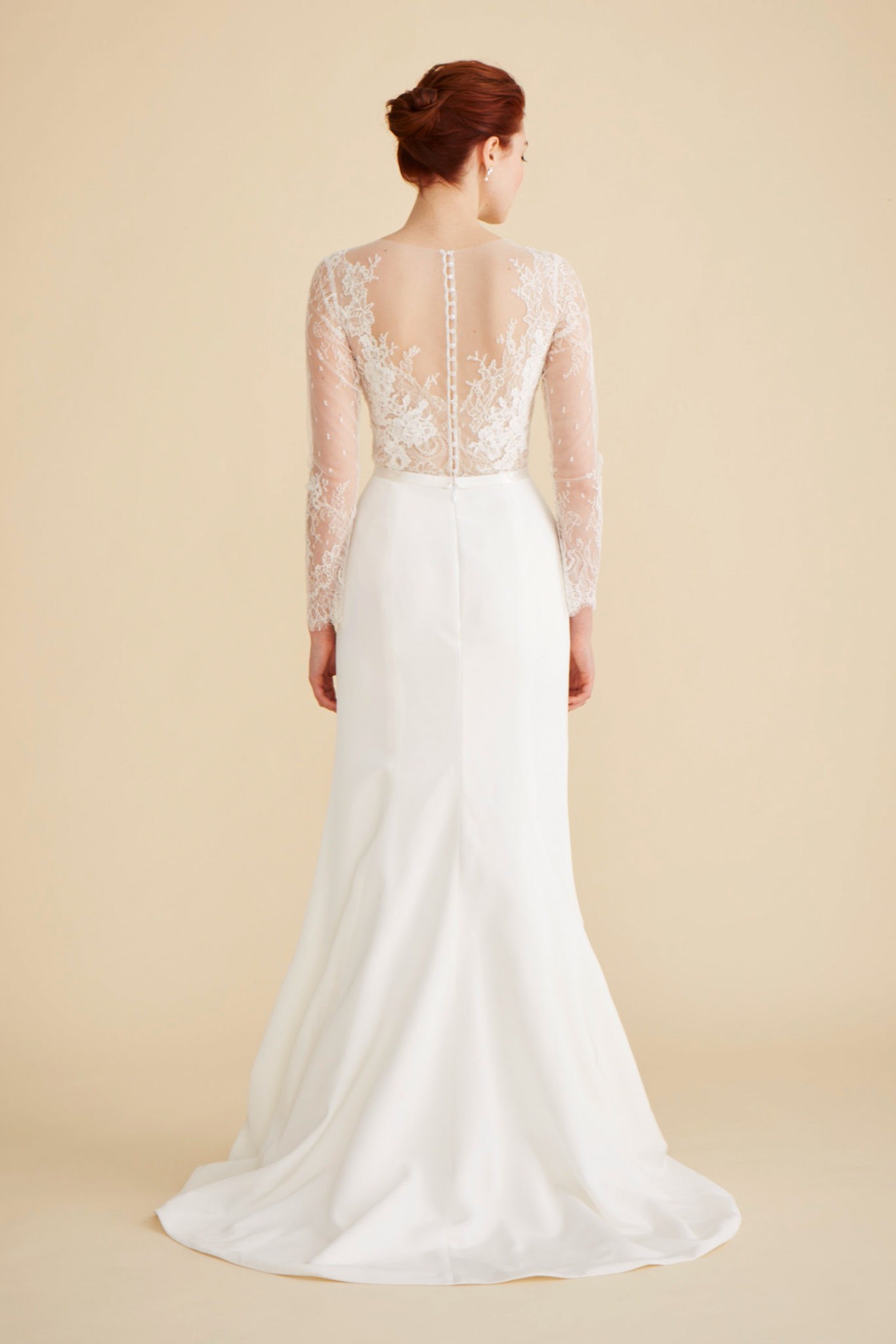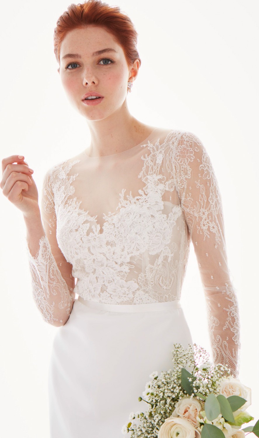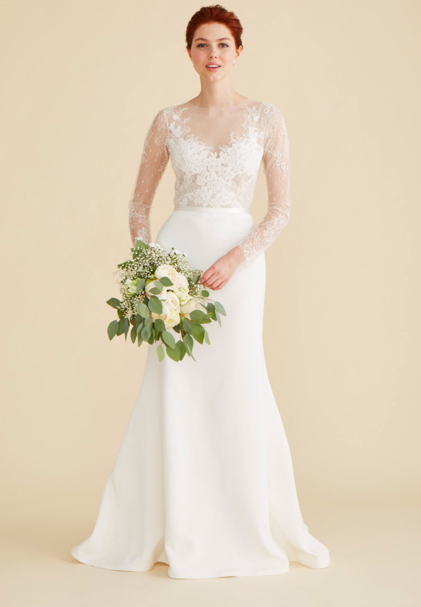 Eloquently rendered in hand-cut lace appliqué and sheer net, Miranda’s wrist-length sleeves and illusion sweetheart neckline bloom into a translucent lace back. Topped with a fine ribbon of silk duchess satin, this timeless wedding dress’s fluted skirt of silk crepe skims the shape and sweeps into a petite train. Shown in off-white.