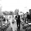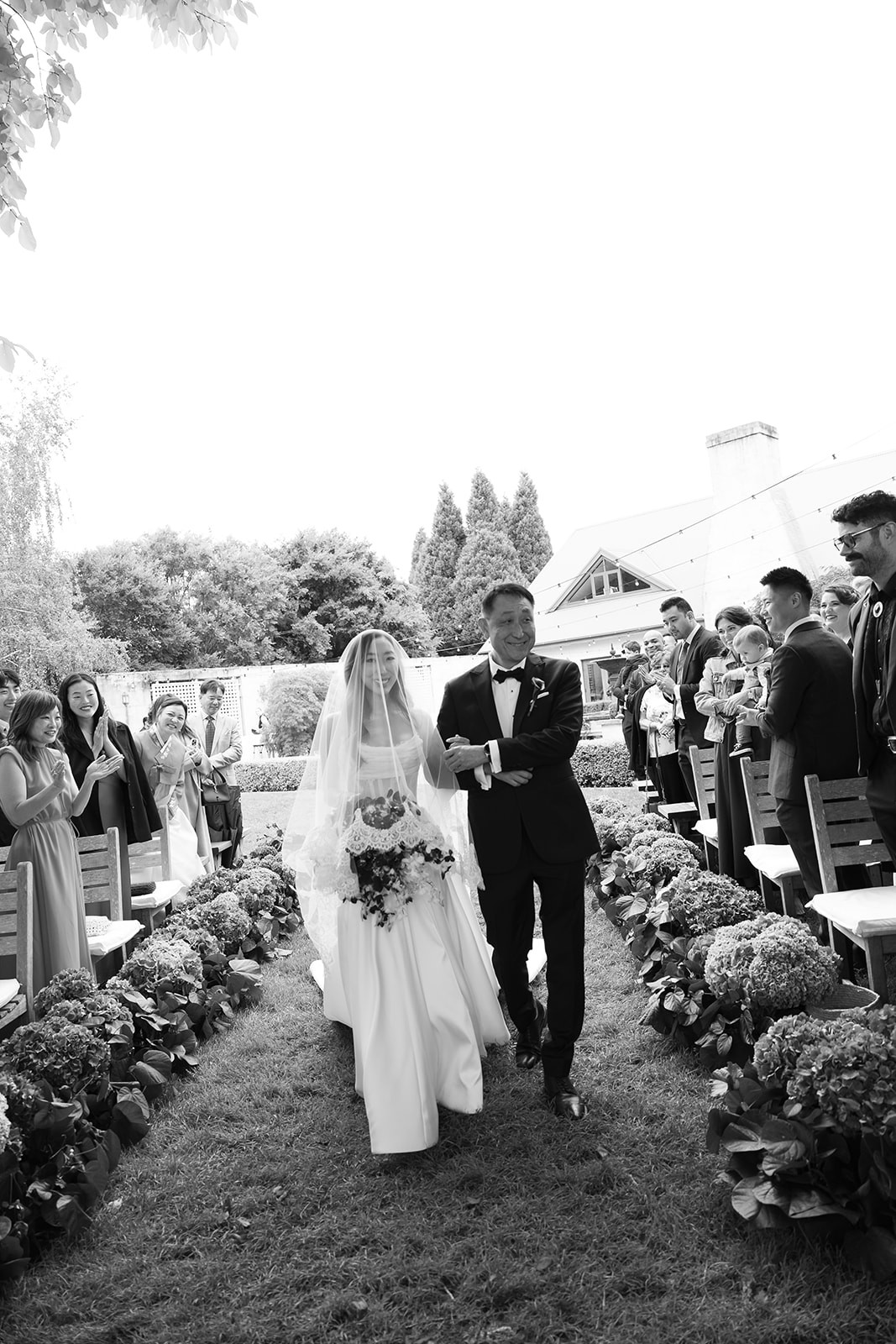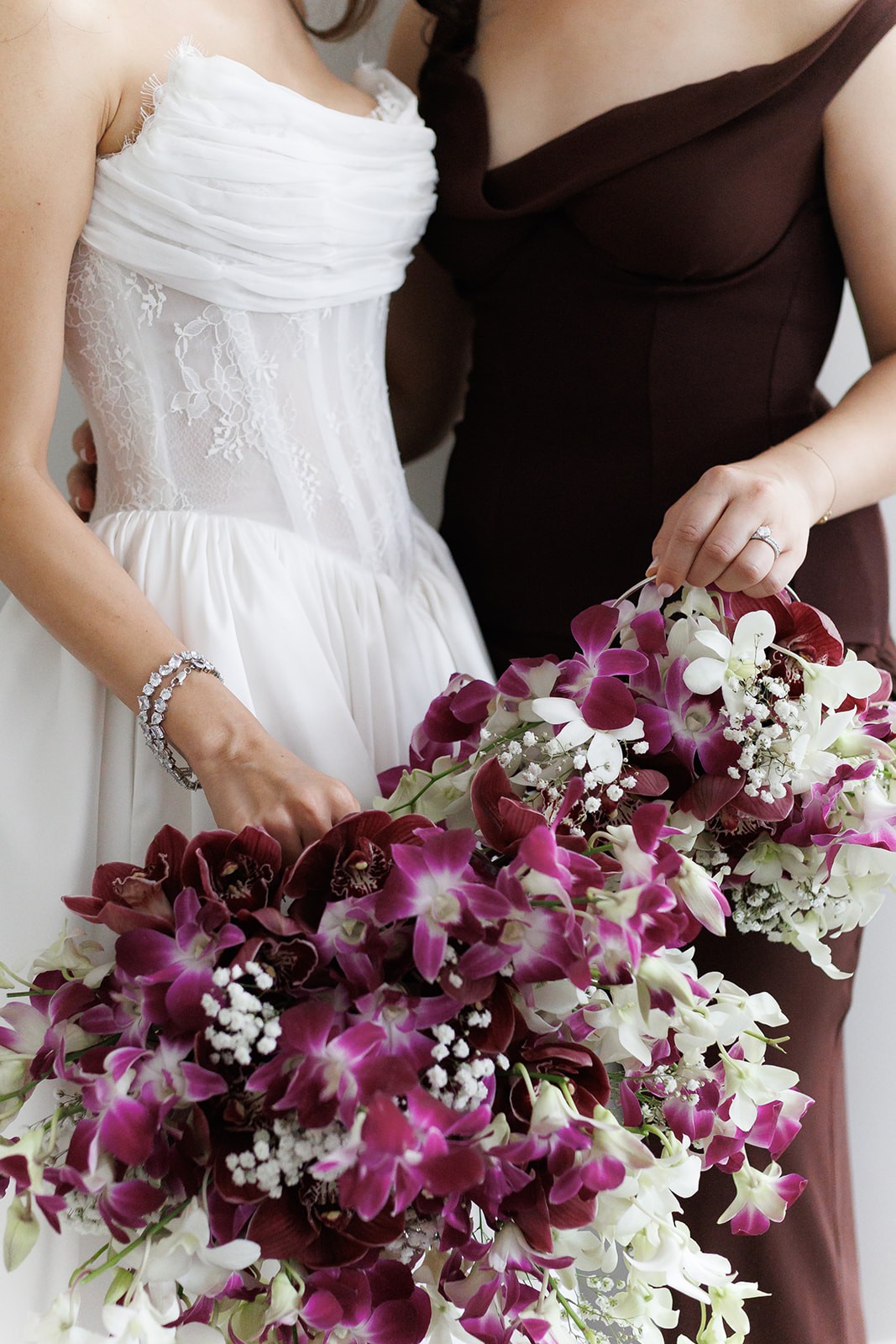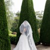 Chantilly corseted gown with crinkle pleated chiffon details over bust. A structured V shaped-waist paired with 2 pockets and a dramatic full circle Mikado skirt draped to 2 meters centre back train.