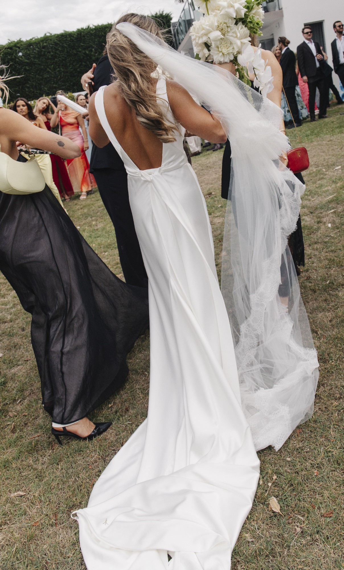 The dress includes internal hook-and-eye fastenings in three places to allow the train to be bustled, as well as ribbons inside to secure the bustle.
