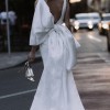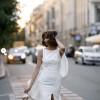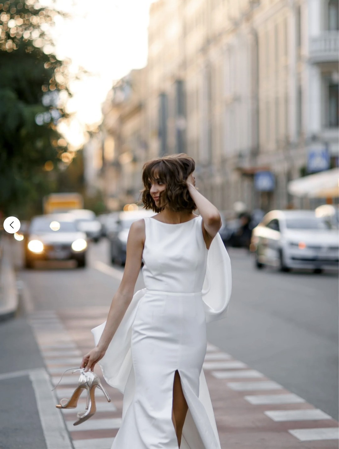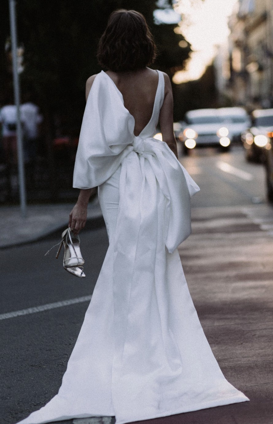 A fitted dress with a big bow and a high front slit. The bow turns into a train.