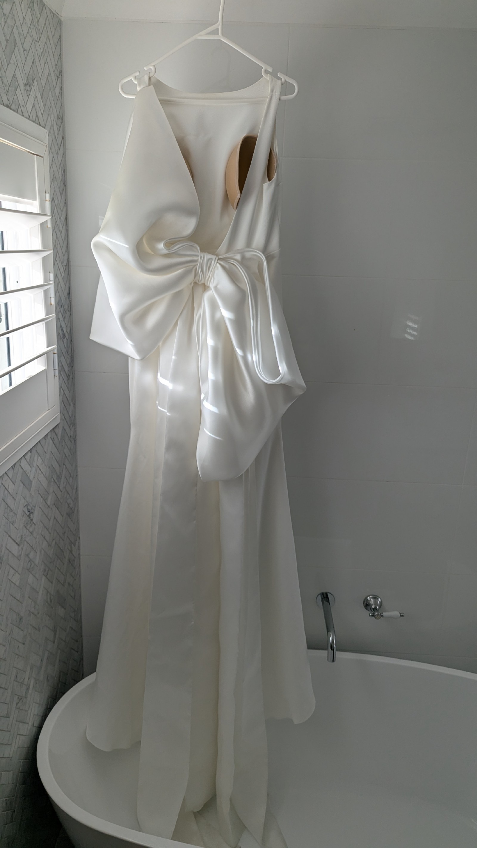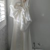 The gown is made of gorgeous, high quality matte fabric but the bow is made of silky organza to to make a feature of it.