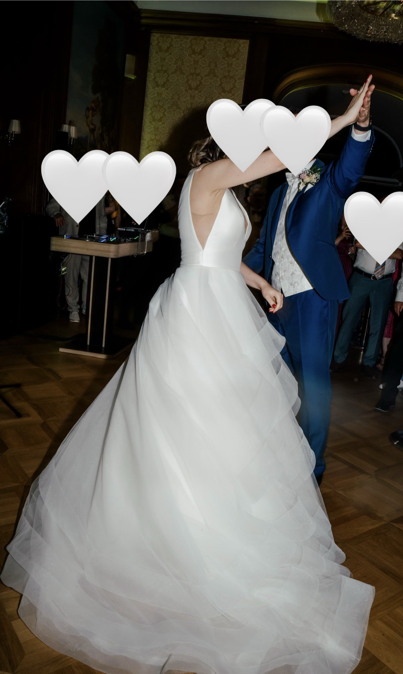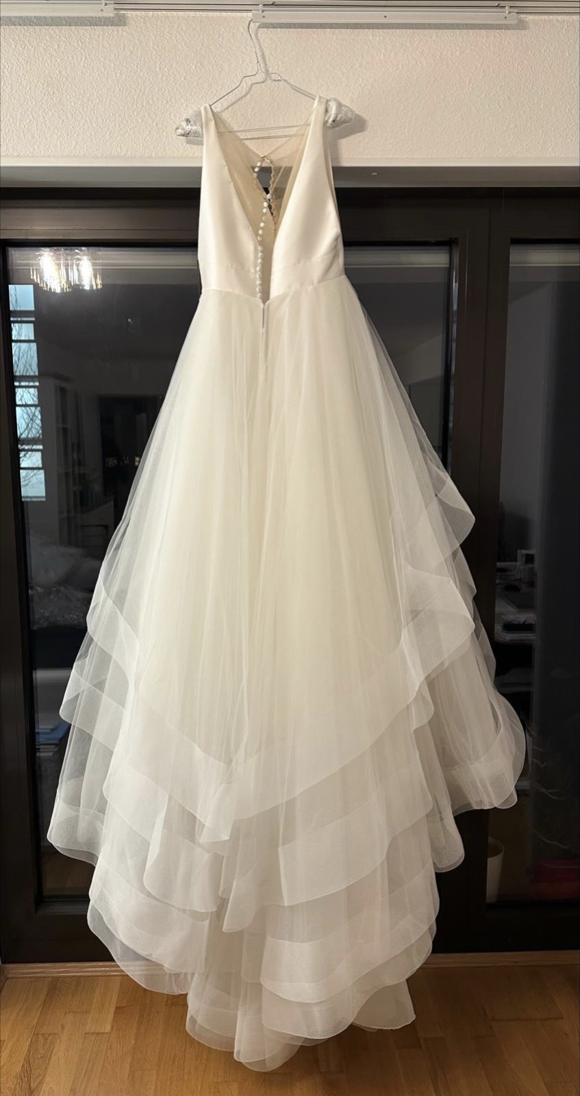The dress was worn for only one day and professionally dry-cleaned in a specialized bridal cleaning process for 230 € (the physical receipt is available and can gladly be viewed). It is radiant and ready to wear.