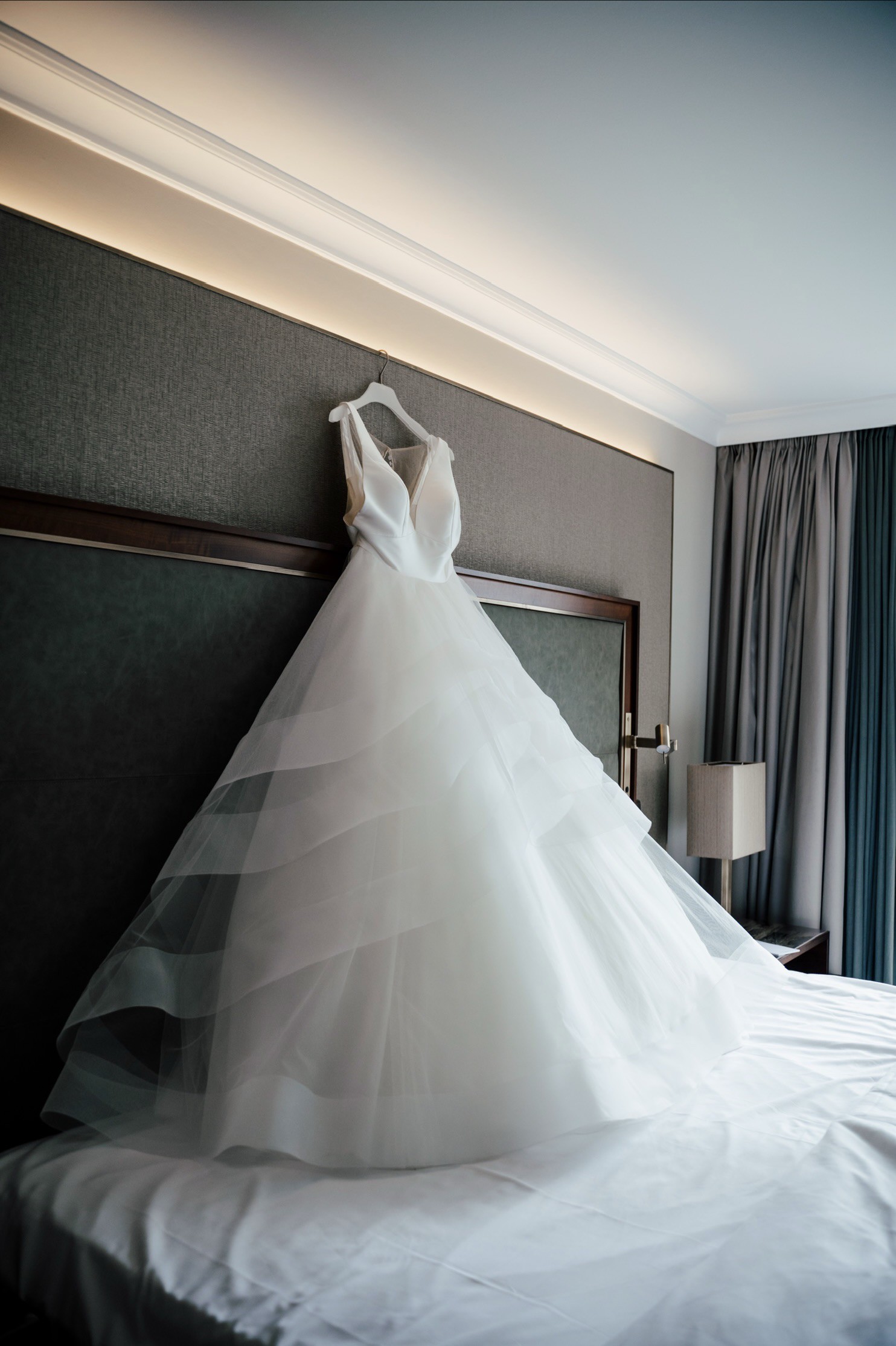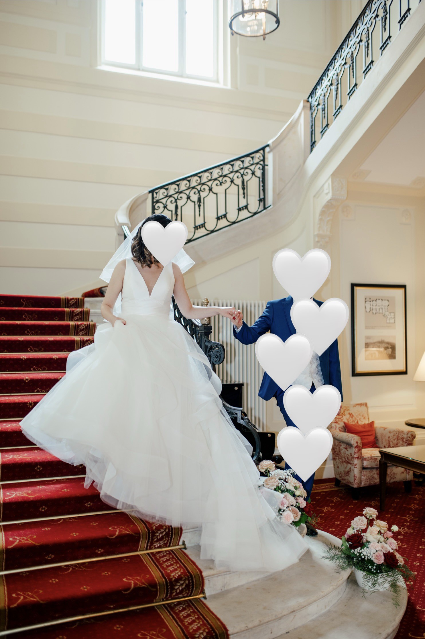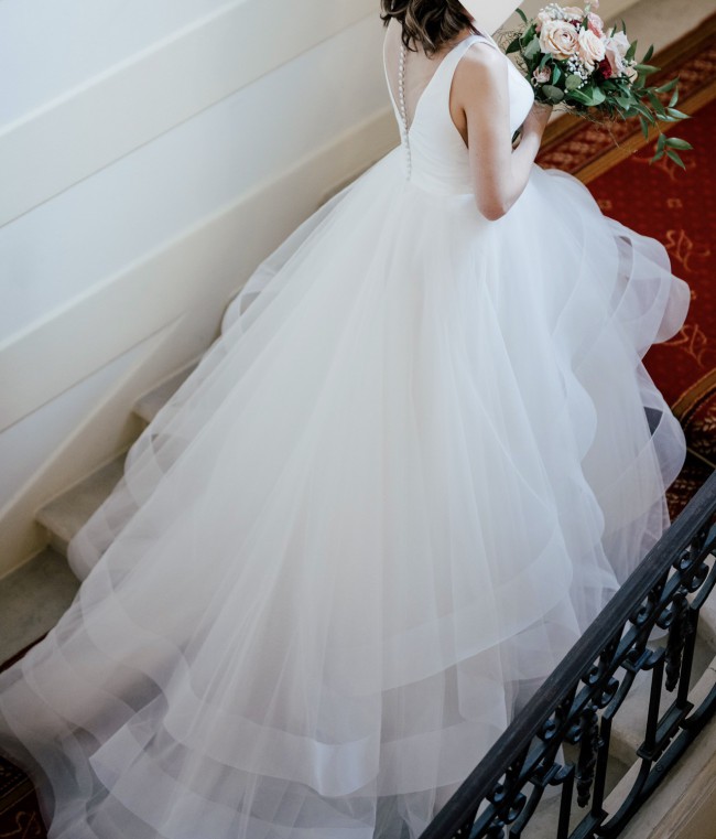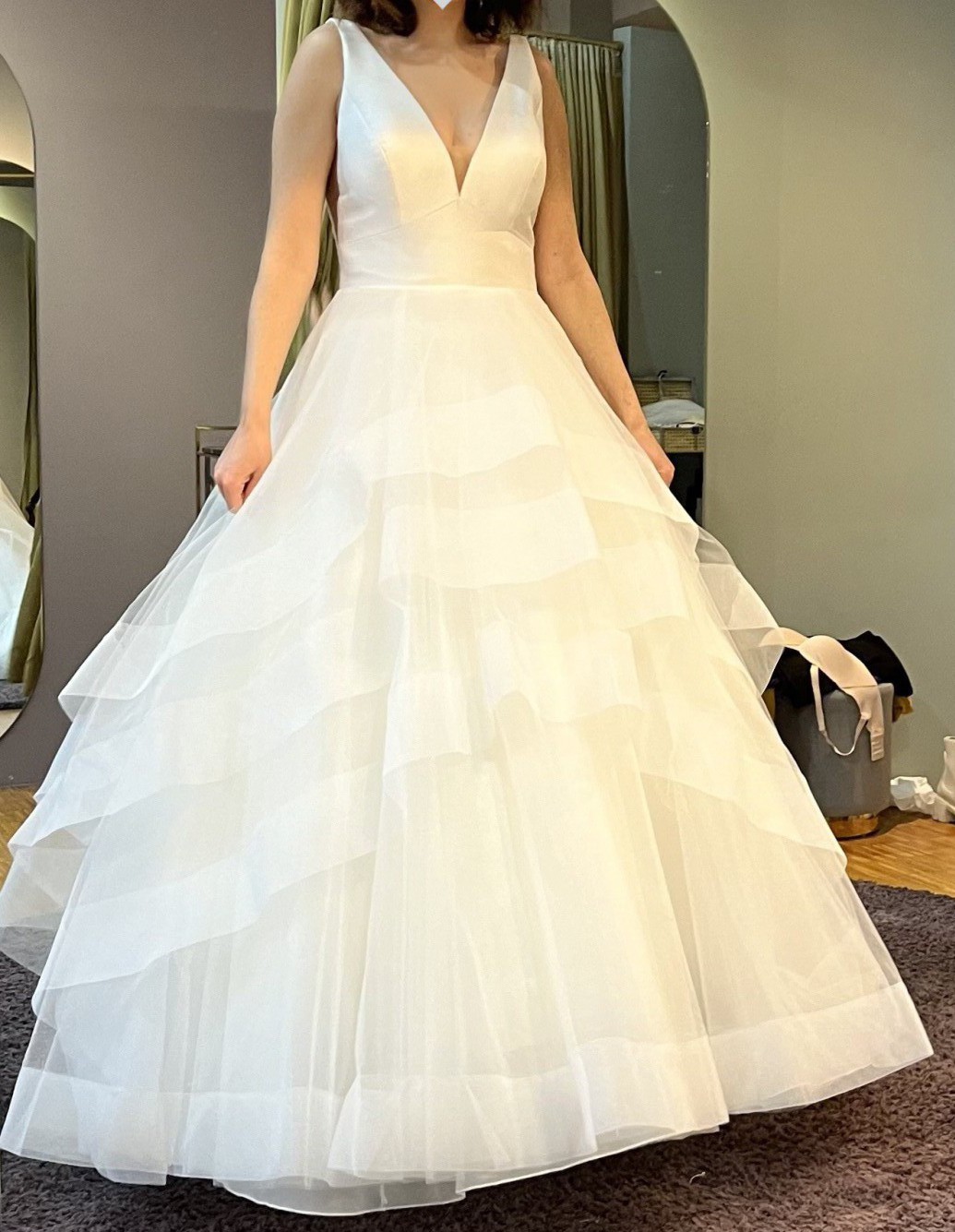 A quick note on transparency: Like any beautiful wedding dress with a train, the hem naturally gently brushed the floor on my wedding day. While the professional cleaning did a fantastic job, there are still some faint shadows remaining on the innermost layers of the underskirt. The great news is that these are 100% invisible from the outside when you wear the dress! Additionally, if you are slightly shorter and plan to have the dress hemmed, this inner edge will be tailored off anyway.