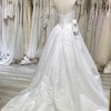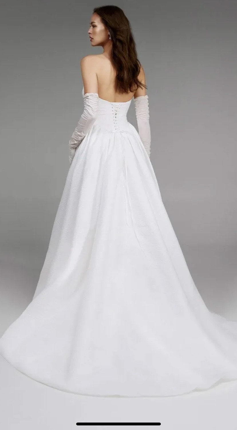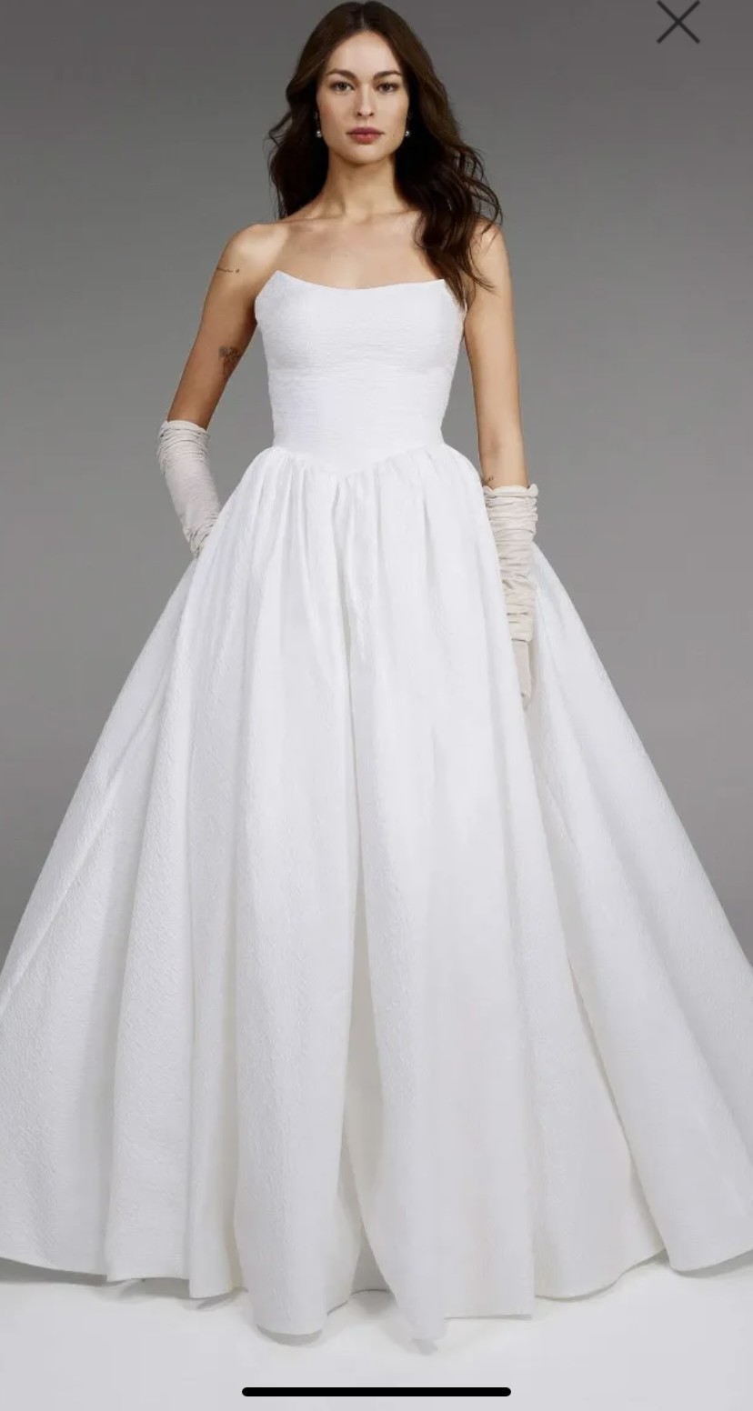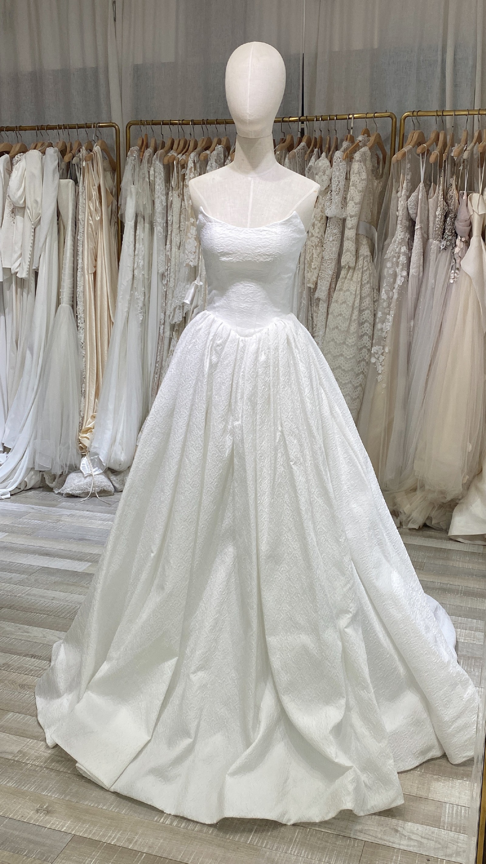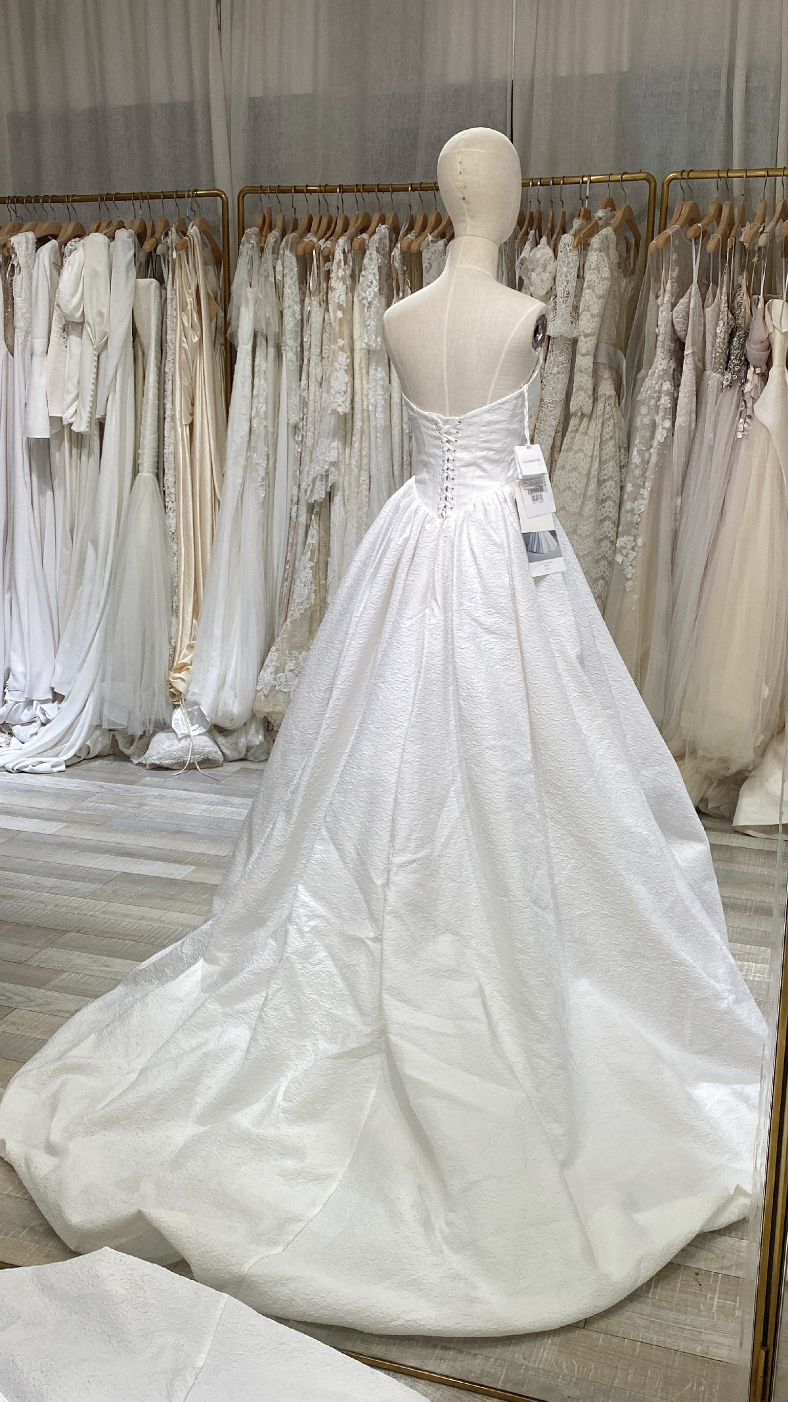Make a grand entrance on your big day with ALBY's stunning design. This dress, made entirely of jacquard, features a structured finish composed of a strapless corset-style bodice with lace-up closure at the back and a V-detail at the waist, from which an unforgettable voluminous puffed skirt emerges.