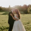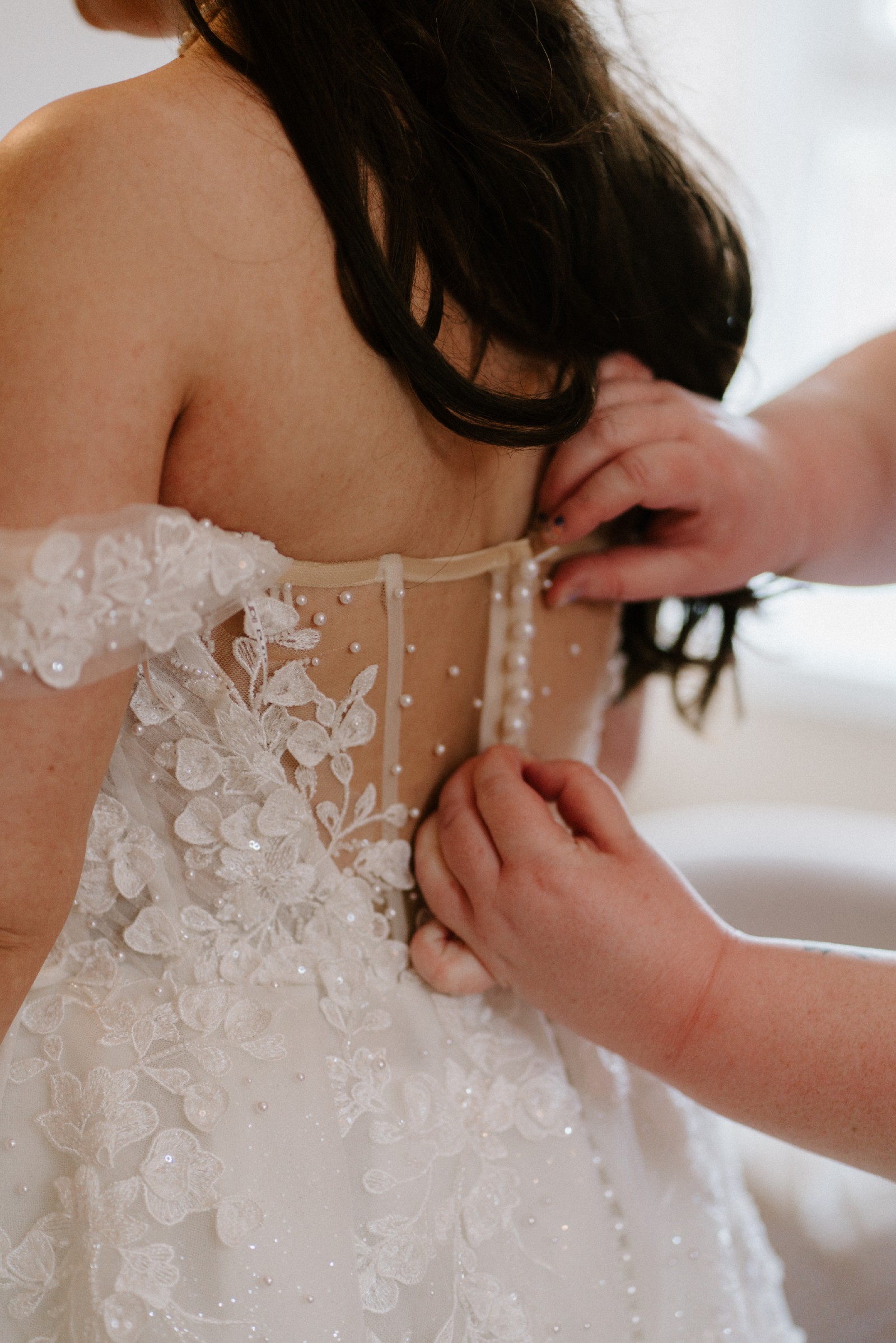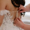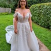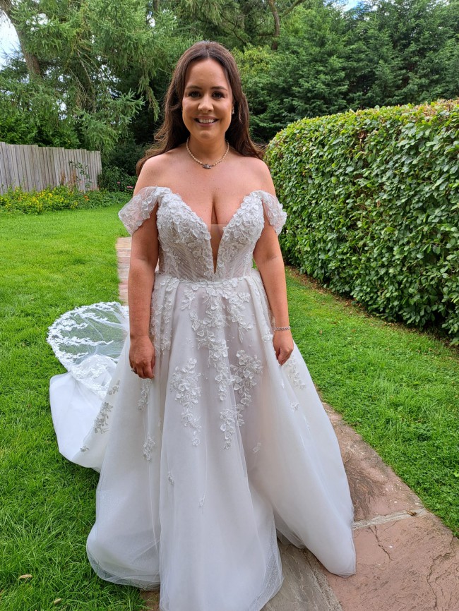 Off-shoulder and adorned with pearls and delicate floral appliqués that effortlessly cascade into an ethereal tulle skirt. The aisle worthy train glistens and comes with full length pearl buttons.