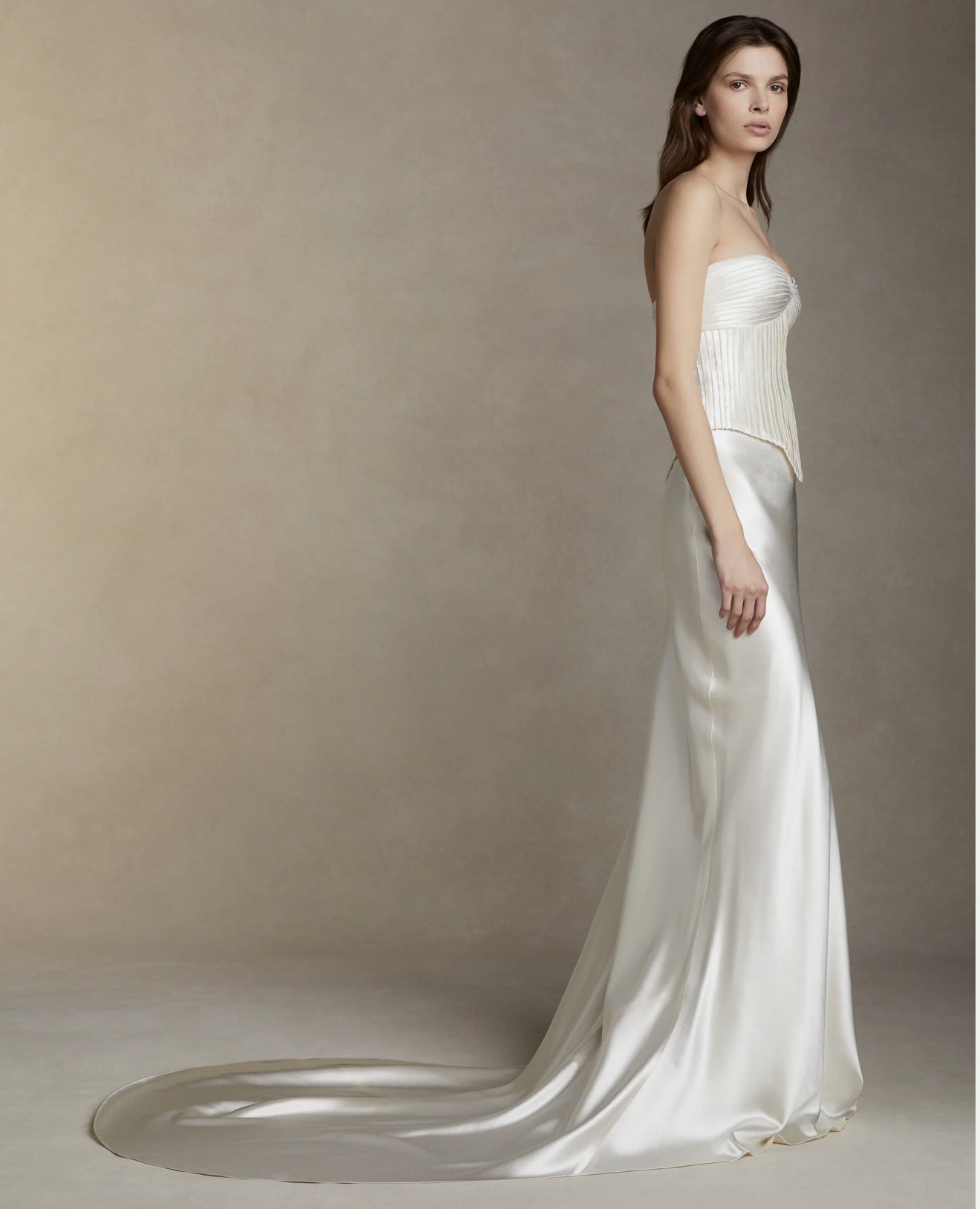 Bias cut silk wool skirt with train. Invisible side zip closure.