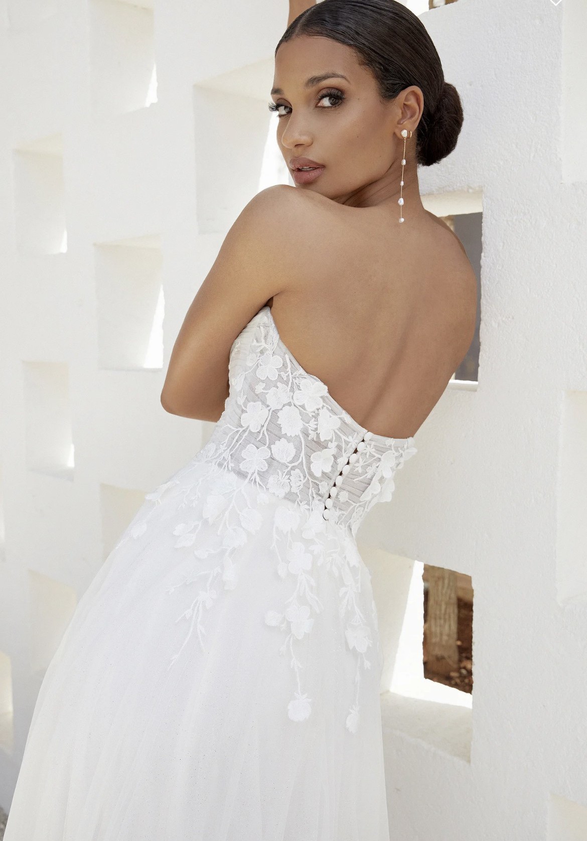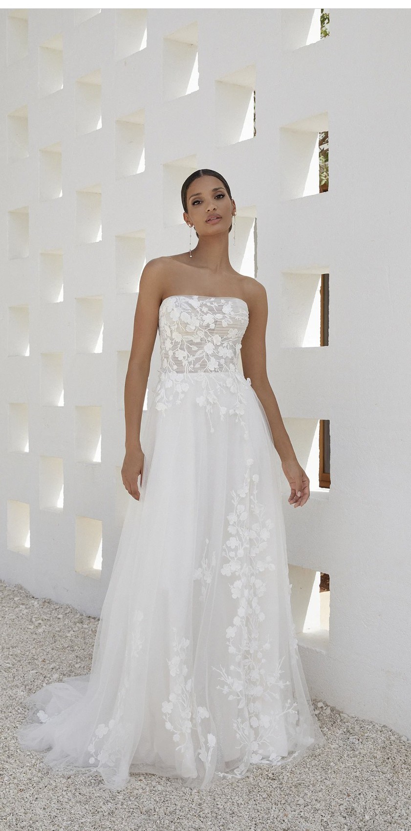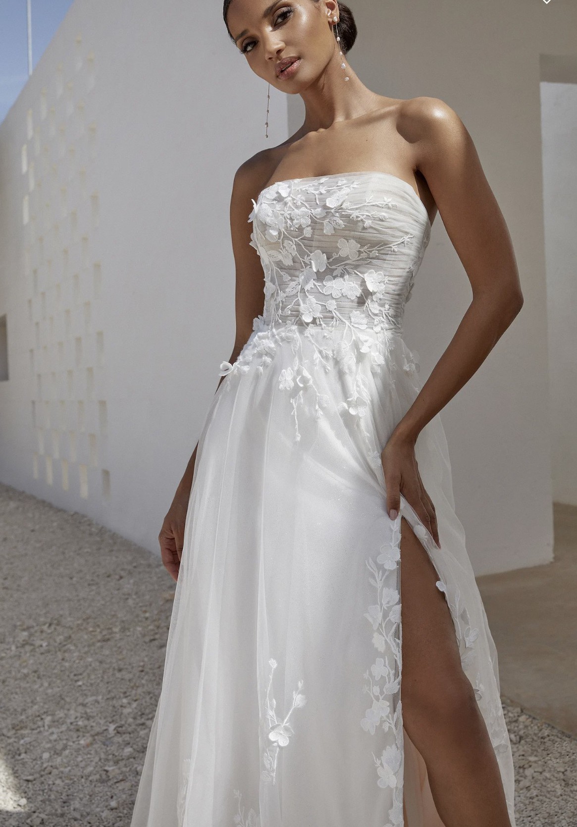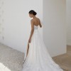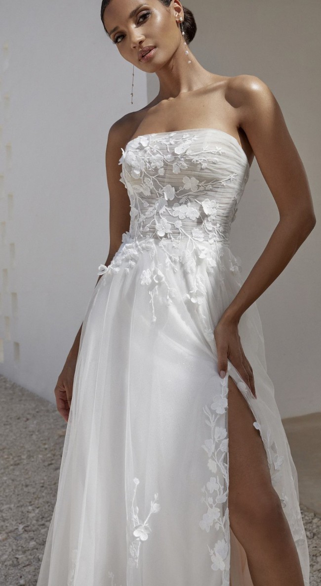 Sparkle tulle ALine with sheer pleated bodice featuring straight neckline. Gown adorned with matte cotton lace appliqués detailed with 3D appliqués overtop.detailed with a slit in skirt and sweep length train. Finished with jersey lining and jersey covered buttons on back bodice