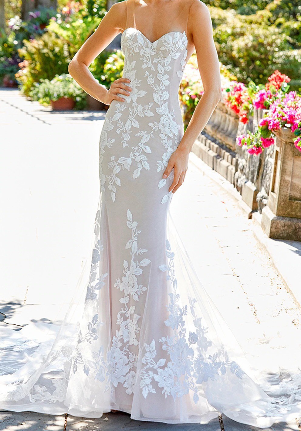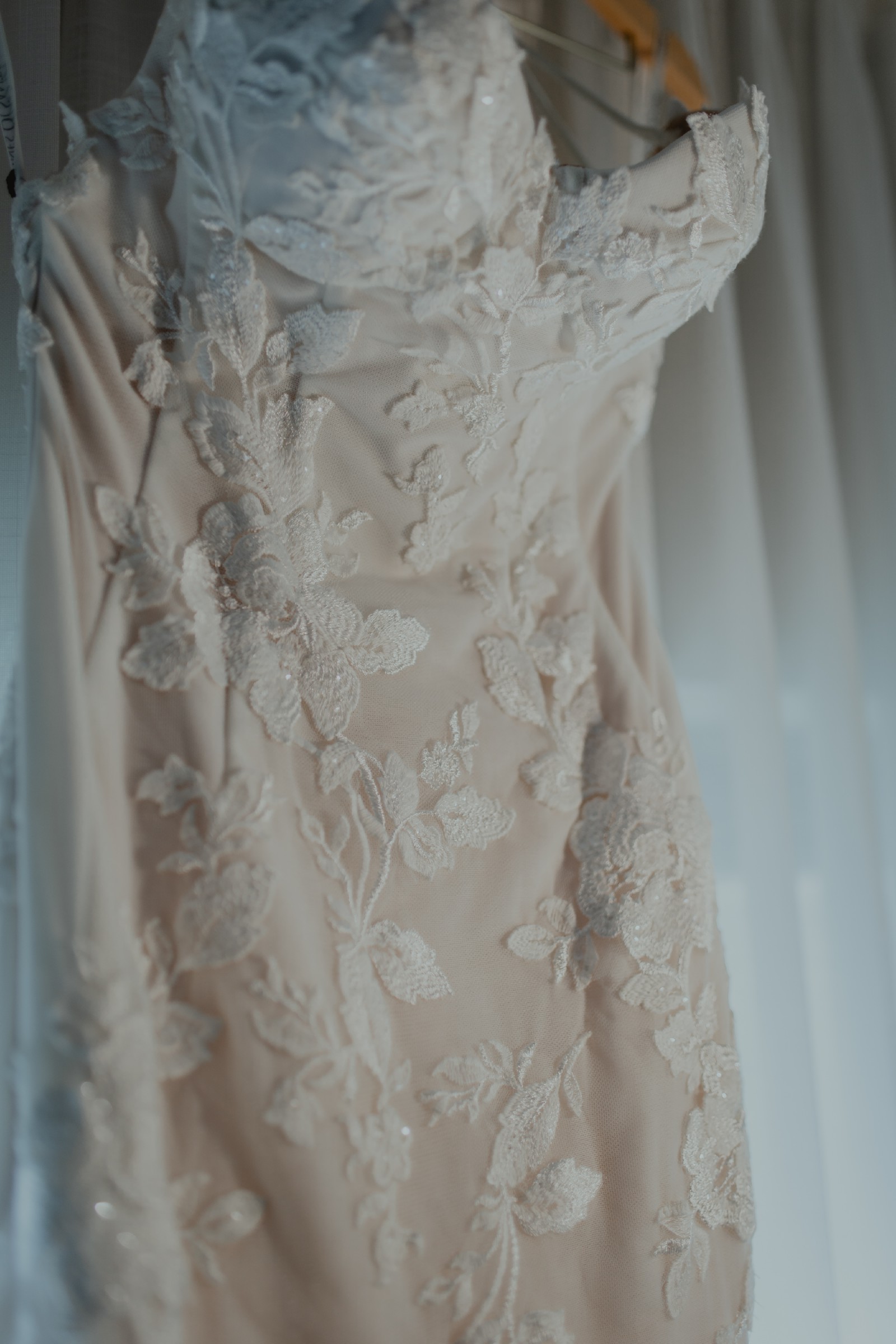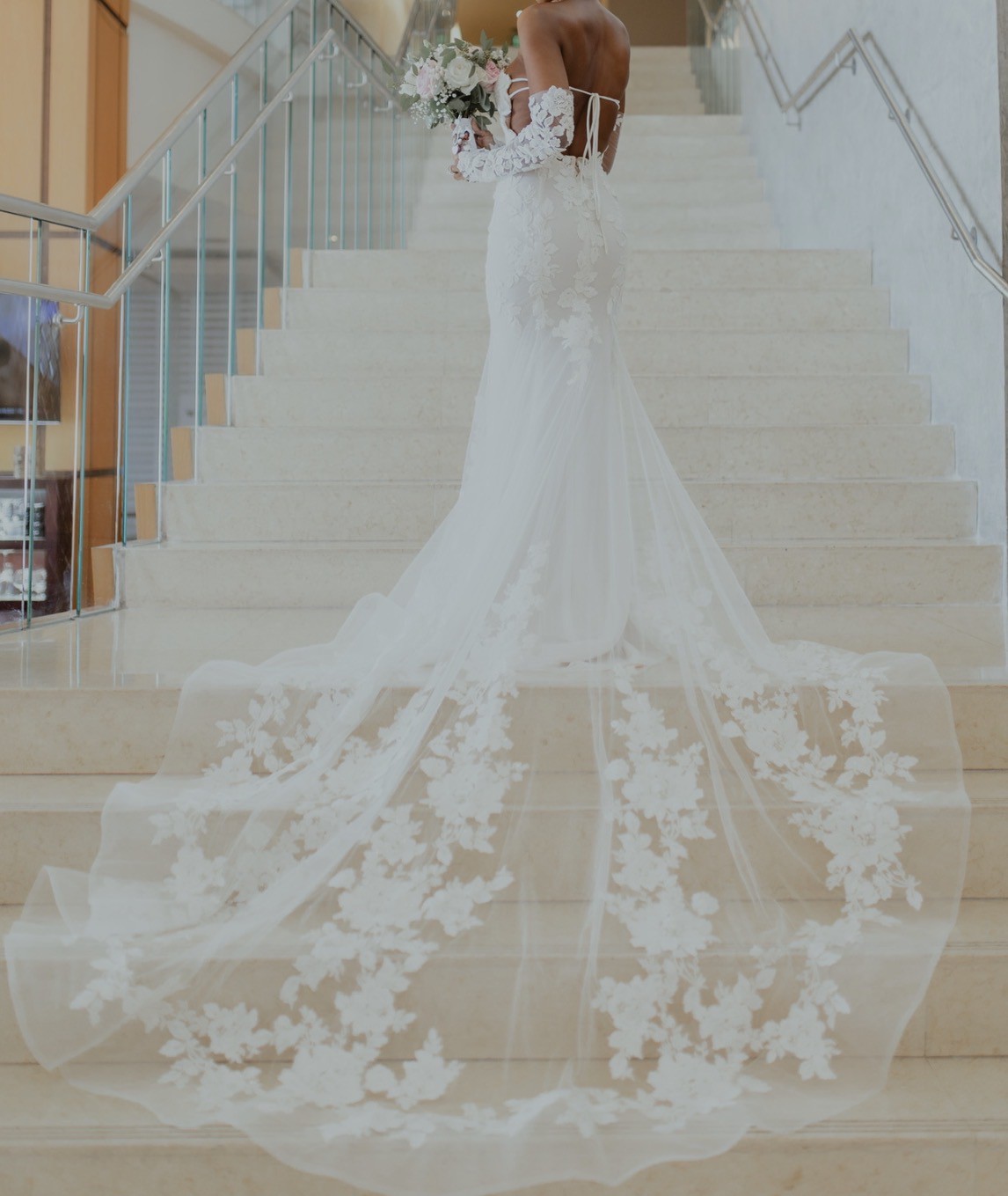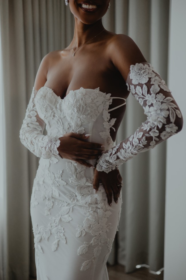The gown originally came with a sheer overlay, which I chose to have removed to create a clean, strapless look. Minor alterations were done to ensure it stays perfectly in place. If you love the sheer look, it can easily be recreated by your own seamstress.