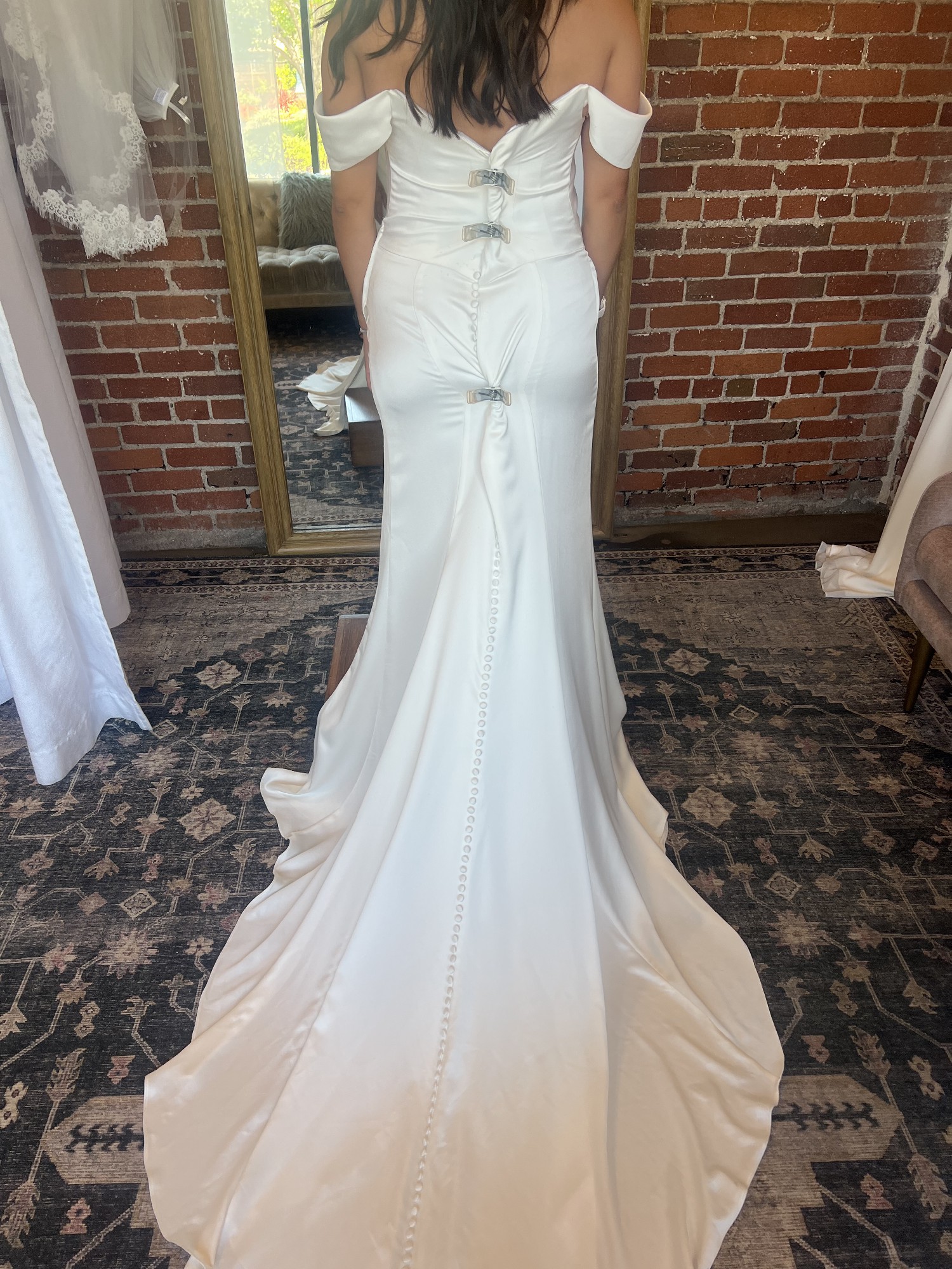 Dress is new, no alterations. Only worn once during dress pickup fitting but no longer needed. Dress is super comfortable and timeless. It is elegant and hope to bless a bride with this dress.
