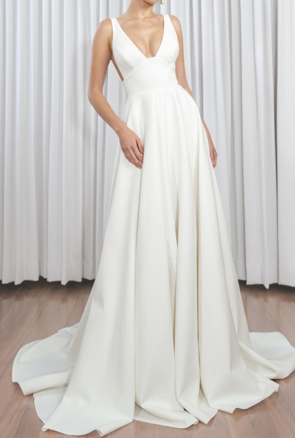 “The epitome of timeless elegance with a modern twist, the Phoenix gown is a figure-flattering, easy to wear silhouette featuring a wide plunge V-neckline, a cinched in waist, and a full skirt with pockets. Made of bonded crepe georgette fabric and designed to be flattering in any size