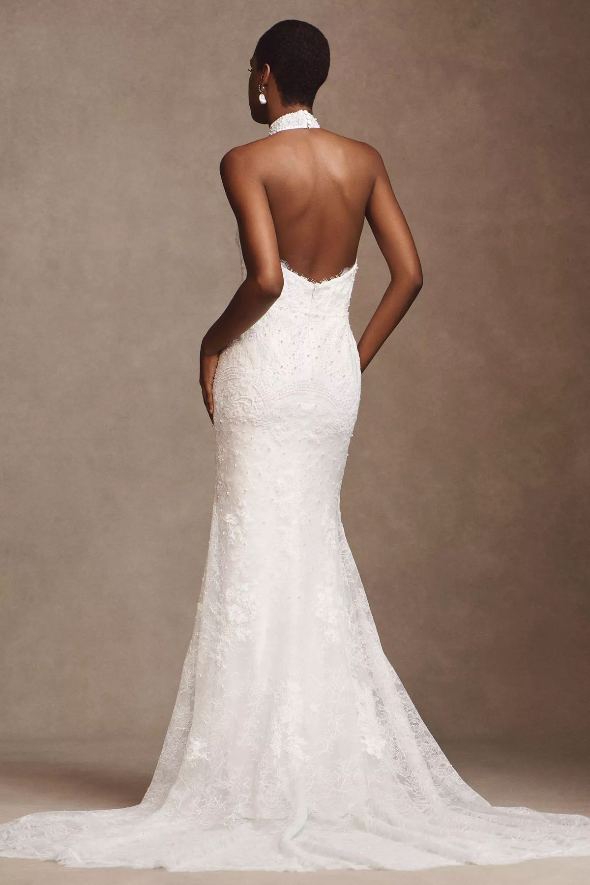 Featuring an elegant halter neckline with scalloped details, the Belle Gown is a classic beauty ideal for your big day. Its silhouette, fitted to perfection, waltzes elegantly with all-over lace embellishments, creating a symphony of patterns that are equal parts intricate and captivating.
