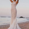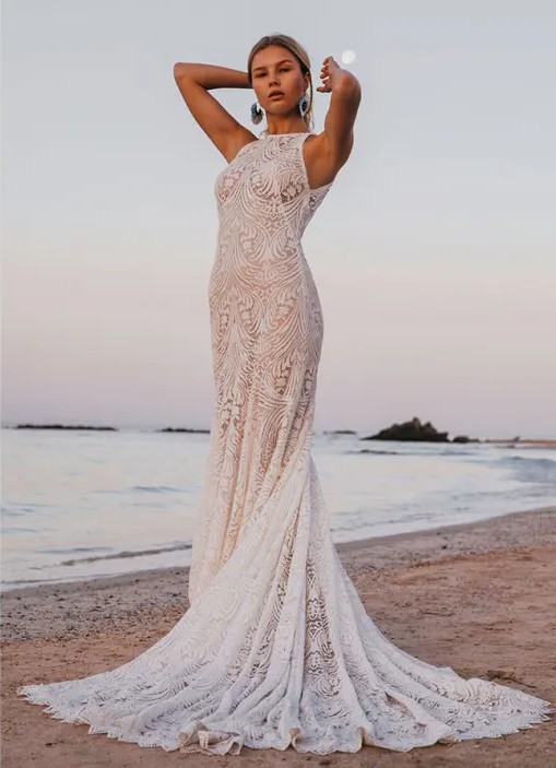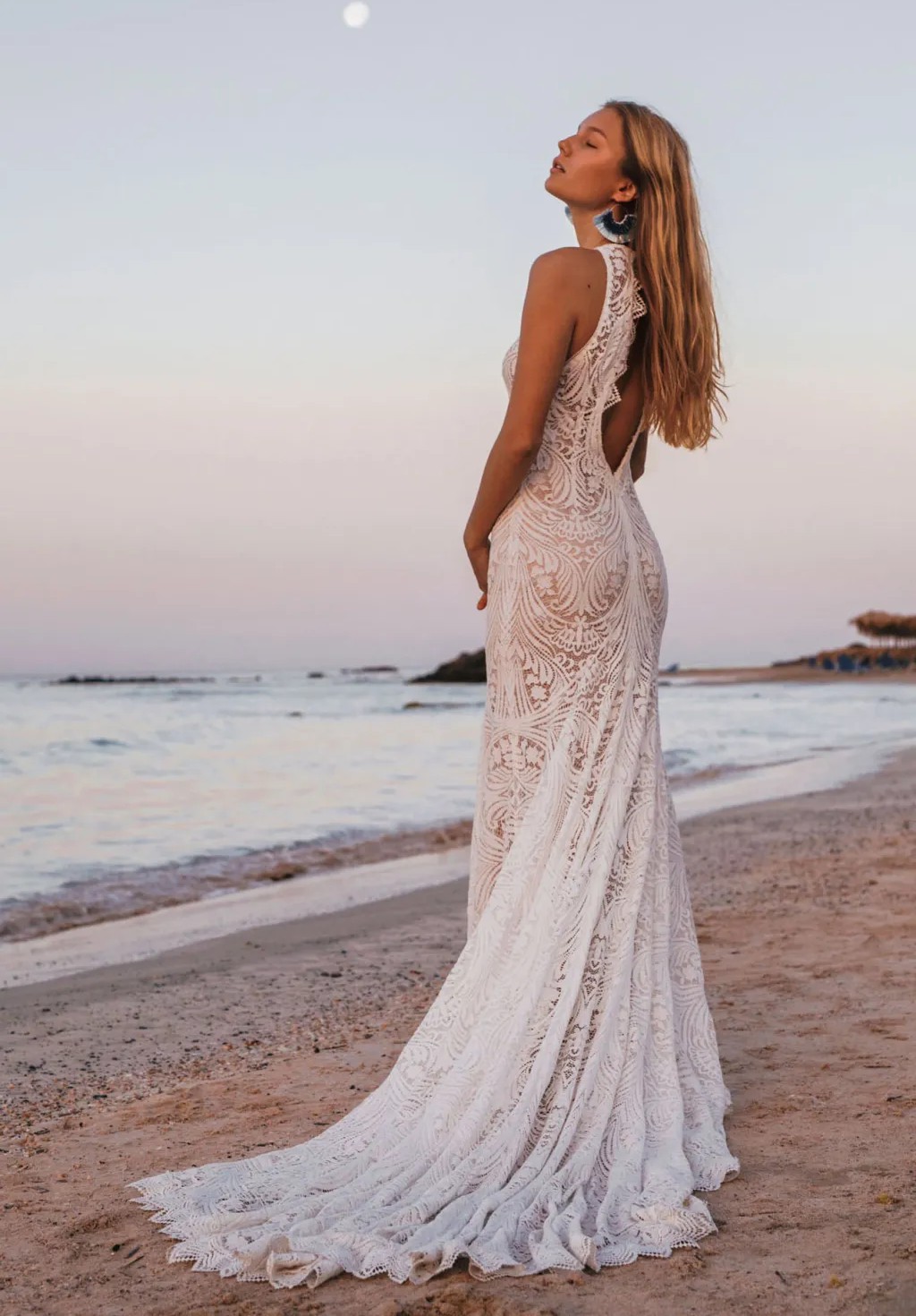 The Lovers Society Phoenix gown is an ode to free-spirited romance, crafted from delicate, lightweight lace that glides over the body and falls into an unforgettable train. A high halter neckline, scalloped lace detailing, and a keyhole back create a silhouette that feels both ethereal and boldly feminine. Paired with a soft nude slip, Phoenix is made for sun-drenched vows, wild hearts, and beautifully untamed celebrations.