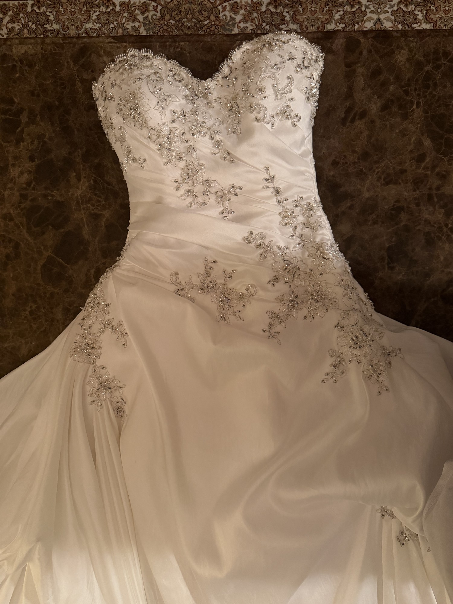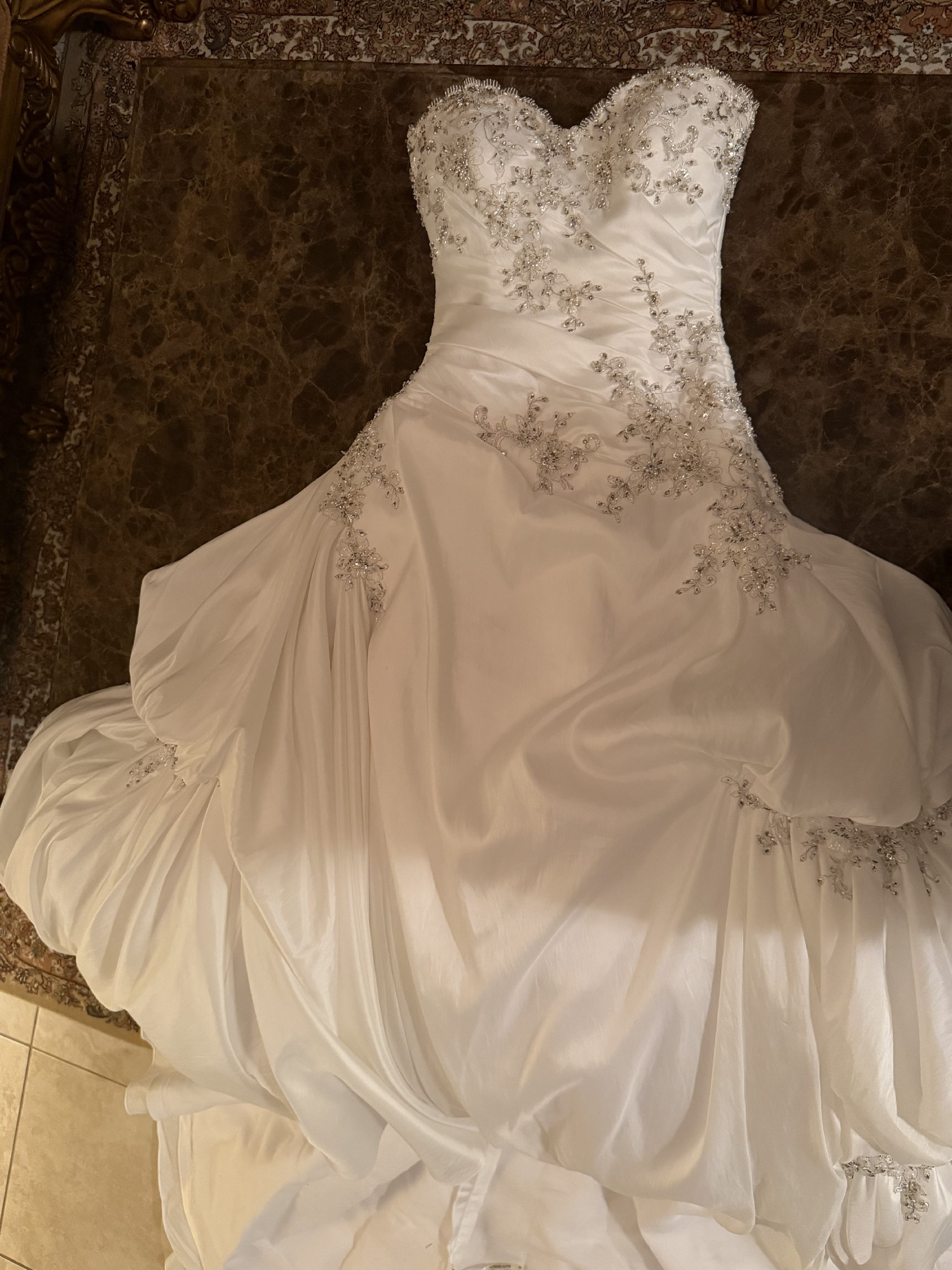 The train is very long and the pic doesn't really show it at all it is approximately 3-5ft long and can then be bustled up for dancing etc Come with Authentic Maggie Sottero