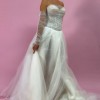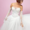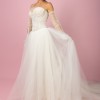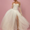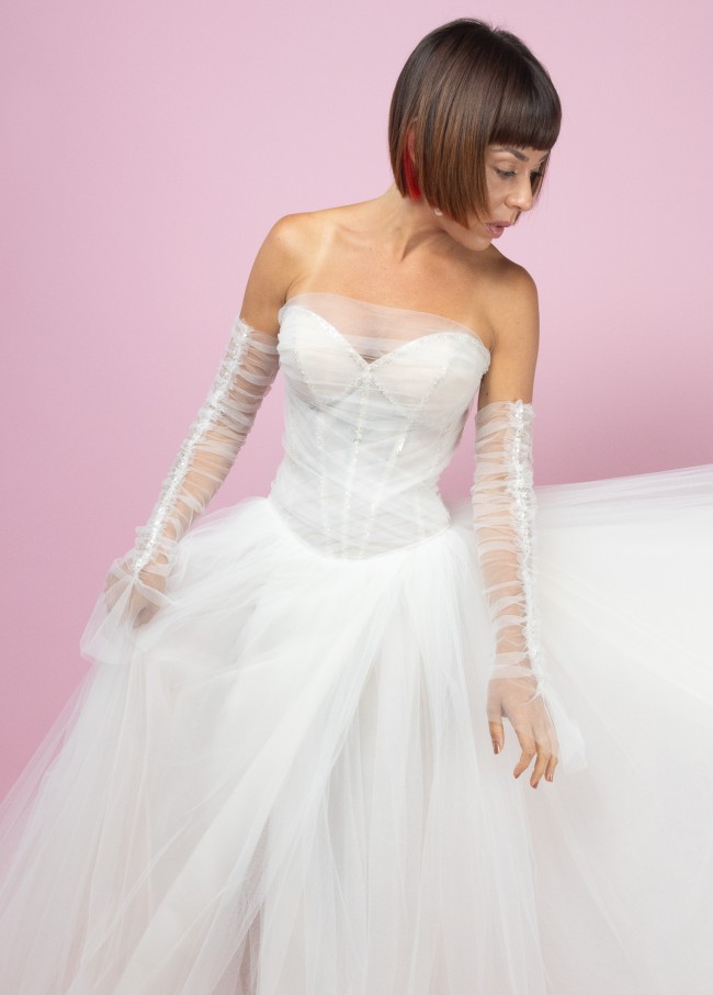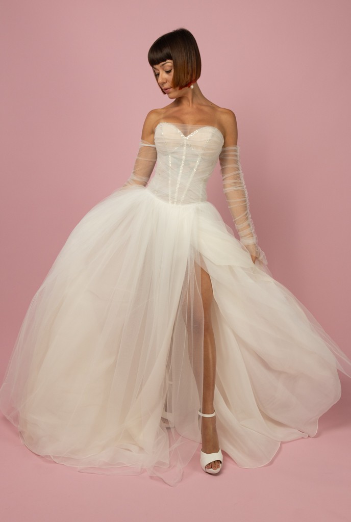 A breathtaking princess ballgown perfectly blends modern appeal and timeless elegance. Made of semi-sheer lightweight fabrics, this gown features a bustier corset with a heart-shaped neckline and lowered waist, beautifully adorned with beaded trim. The dress is enveloped in a delicate cloud of soft tulle and fastens with a back zip and an internal belt for a perfect fit. Lininig Poly Organza.