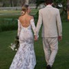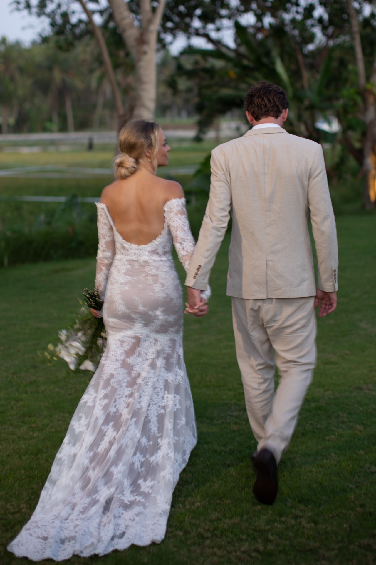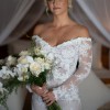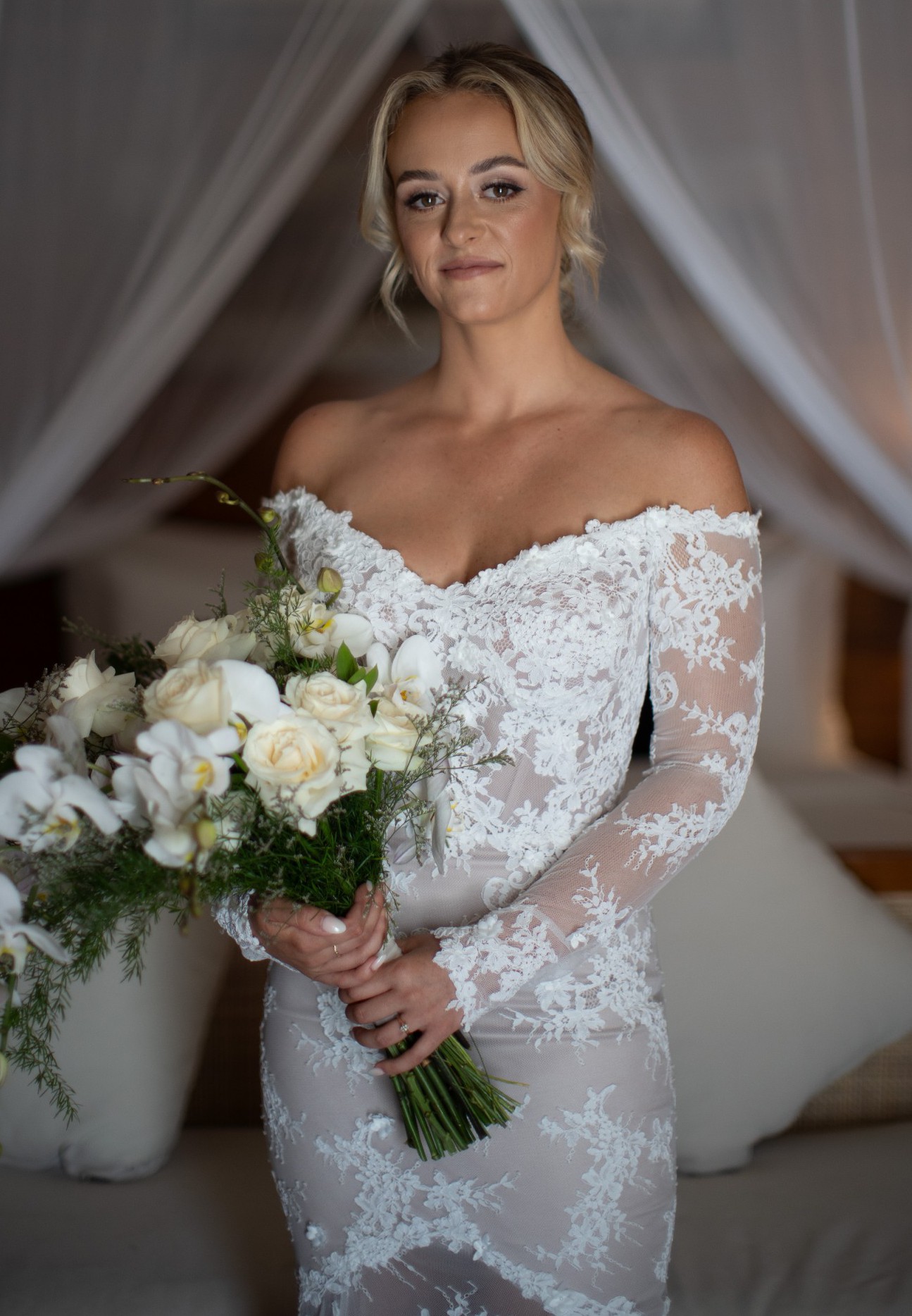 The Azalea gown by Alena Leena combines heartfelt passion with the utmost grace in a modern Chantilly lace silhouette. A masterfully constructed bustier ensures a comfortable fit that enhances details like the low open back, off-the-shoulder long sleeves and structured cups. The Azalea is finished with individually sewn, handmade silk flowers for extra romance.