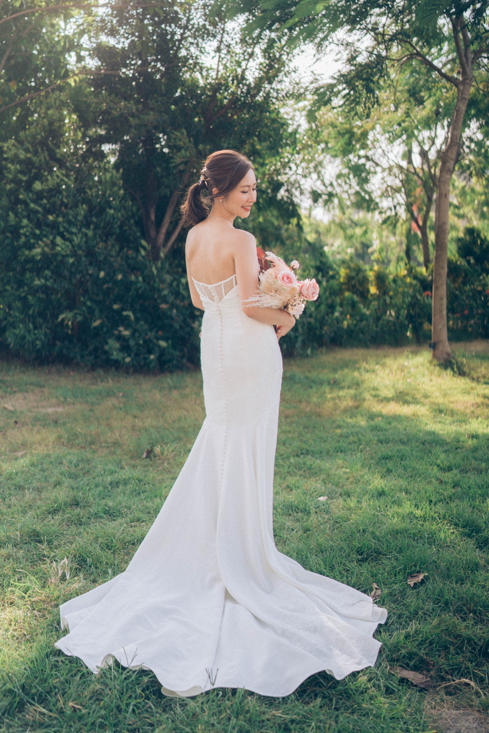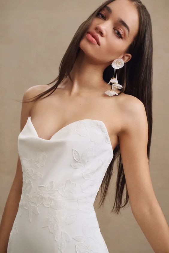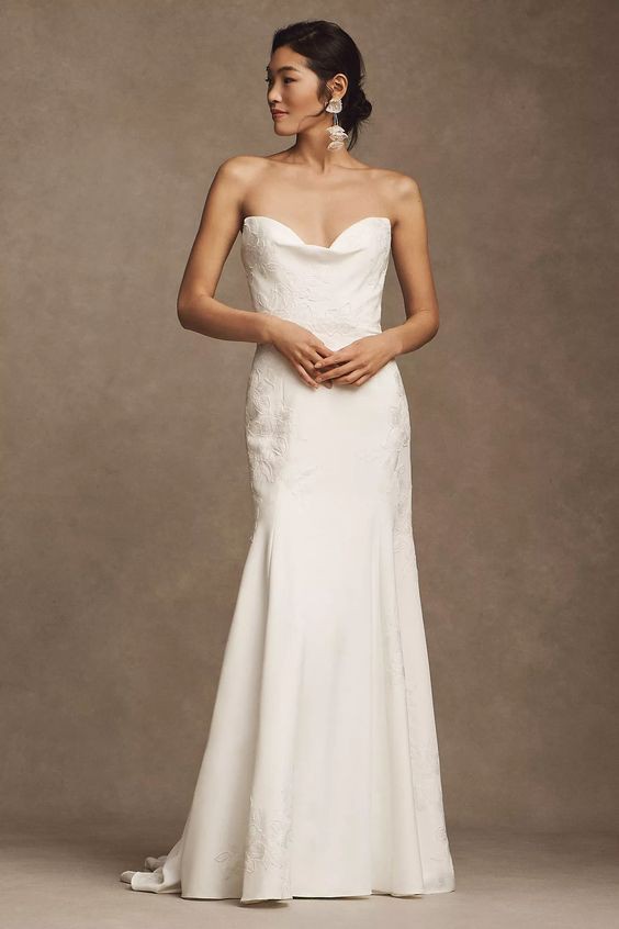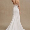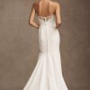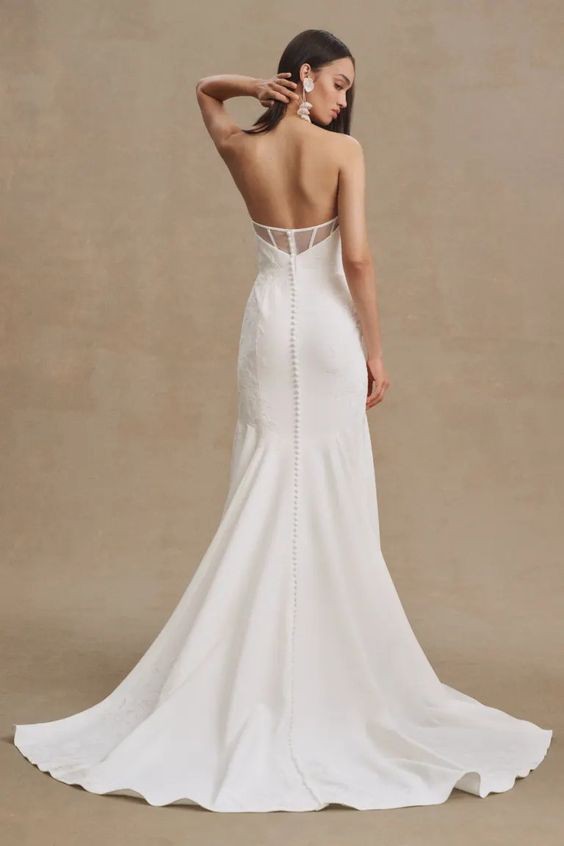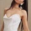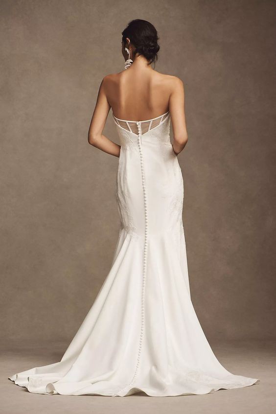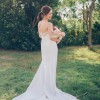 Abound with romantic details, the Jenny Yoo Naomi Wedding Gown makes a show-stopping style for your wedding day. The strapless silhouette dips slightly in the front, moving down into a trumpet silhouette. The piece is complete with back button detailing, lace applique, and a slightly sweeping chapel train.