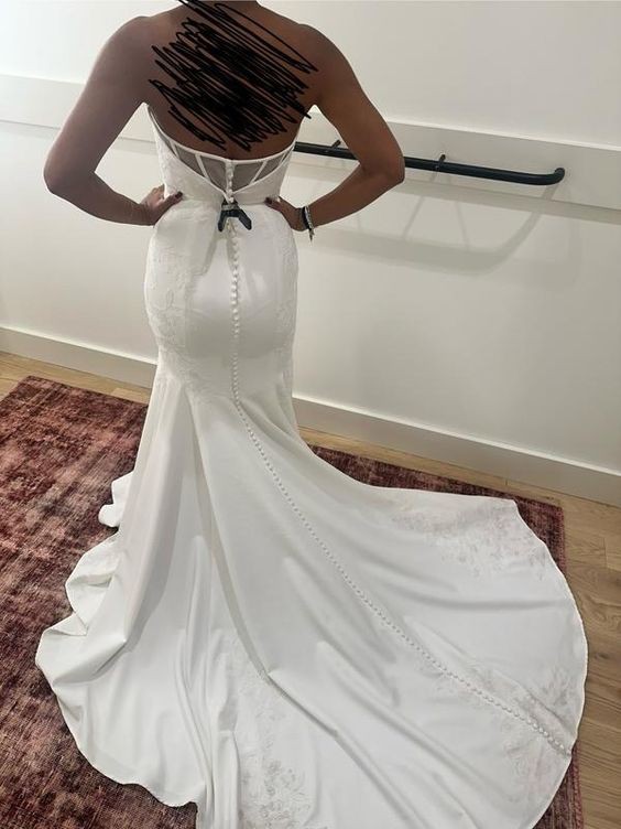 Size 4. Has been tried on in store and has very minor dust along the hemline. Overall the gown appears to be in excellent condition. Retail price: $1,495.