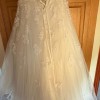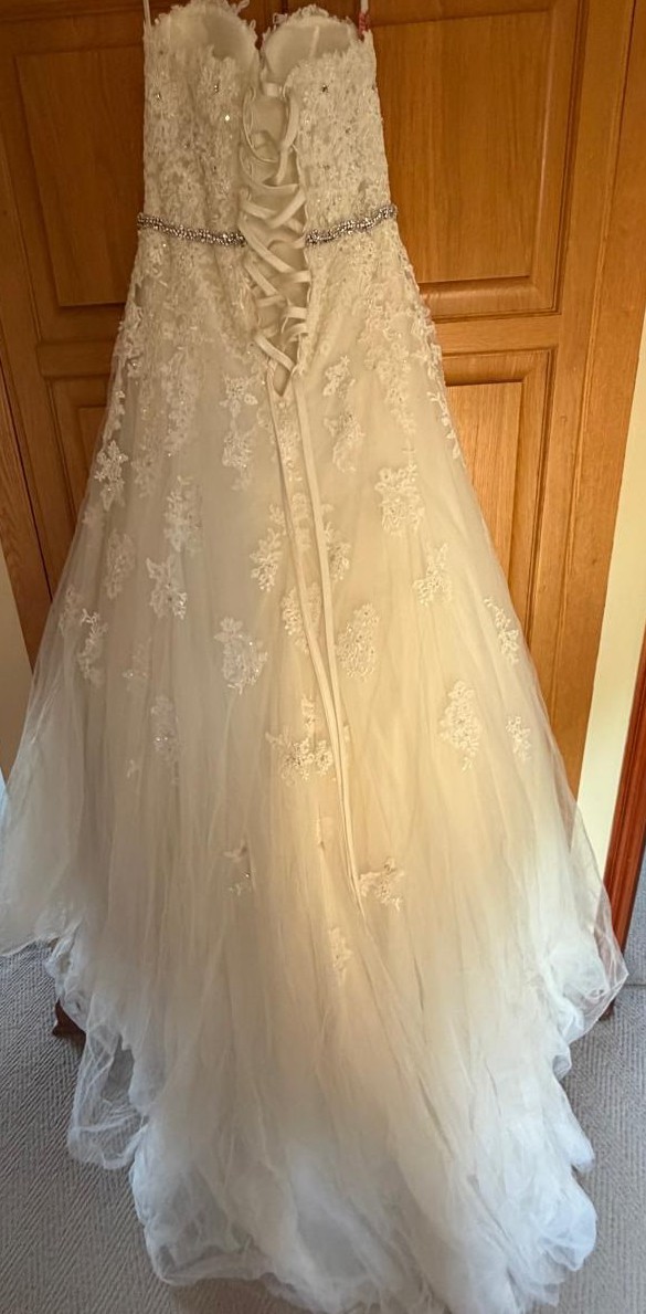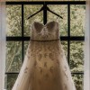 Classic Sweetheart Lace A-Line Wedding Dress: An A-line wedding gown crafted from misty tulle featuring layers of decadent hand-beaded lace appliqués that trim the strapless sweetheart neckline and adorn a flattering bodice. A dazzling crystal hand-beaded belt emphasizes the waist and adds a classy touch of sparkle. Completing this stunner is a back corset and chapel length train.