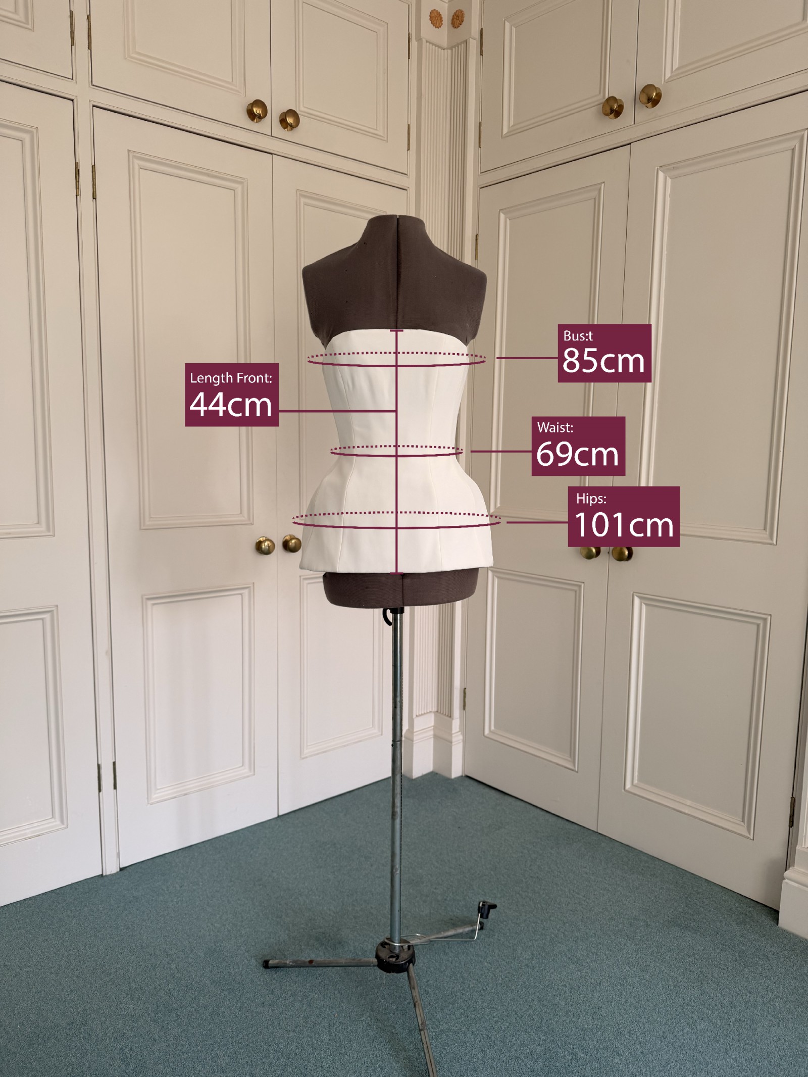 I am a standard UK size 8, altered slightly smaller to approximately UK 6–8 for the day.