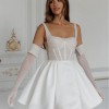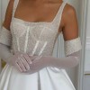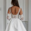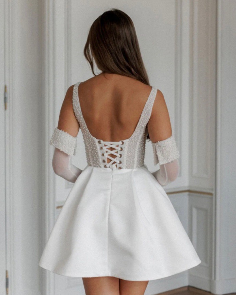 Introducing *Lottie*, the perfect blend of glamour and sophistication in a chic bridal mini dress. This stunning design features a full satin skirt, complete with hidden pockets for a touch of modern convenience. The bodice is adorned with intricate pearl and shimmering beadwork, adding a radiant sparkle to the look. Complementing the dress are elegant tulle gloves, finished with matching beaded cuffs for an extra touch of refinement. *Lottie* is the ideal choice for the fashion-forward bride who wants to make a statement with elegance and style.