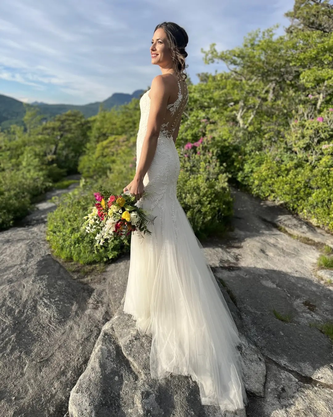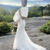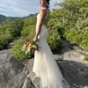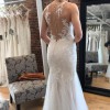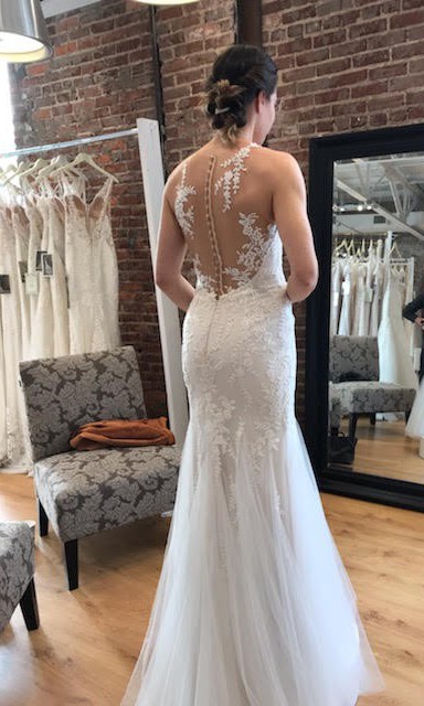 A delicate illusion sweetheart neckline with embroidered lace. Full-length, mermaid style gown with tulle layers and stretch lace, combined with an illusion V-back with covered buttons.
