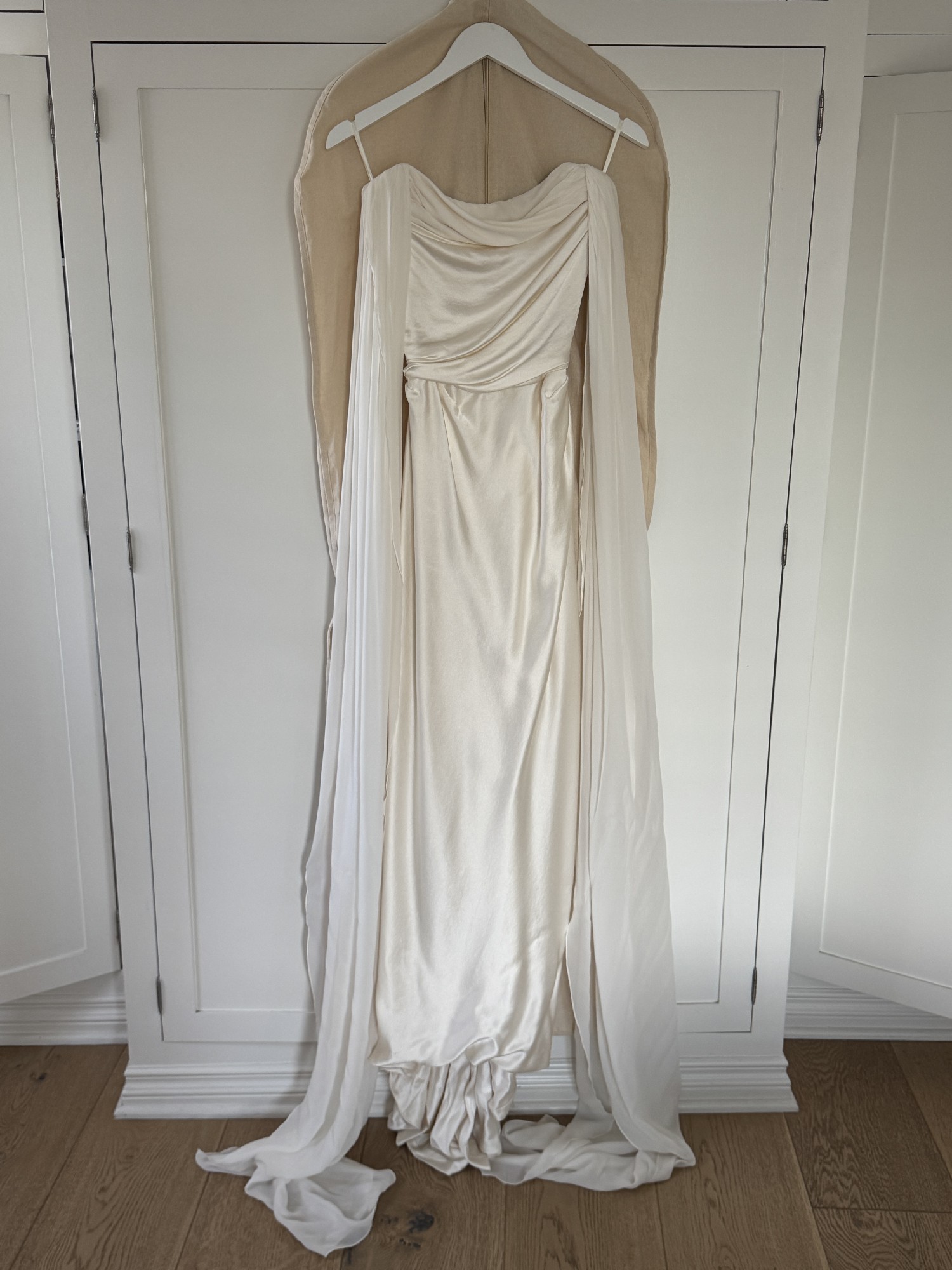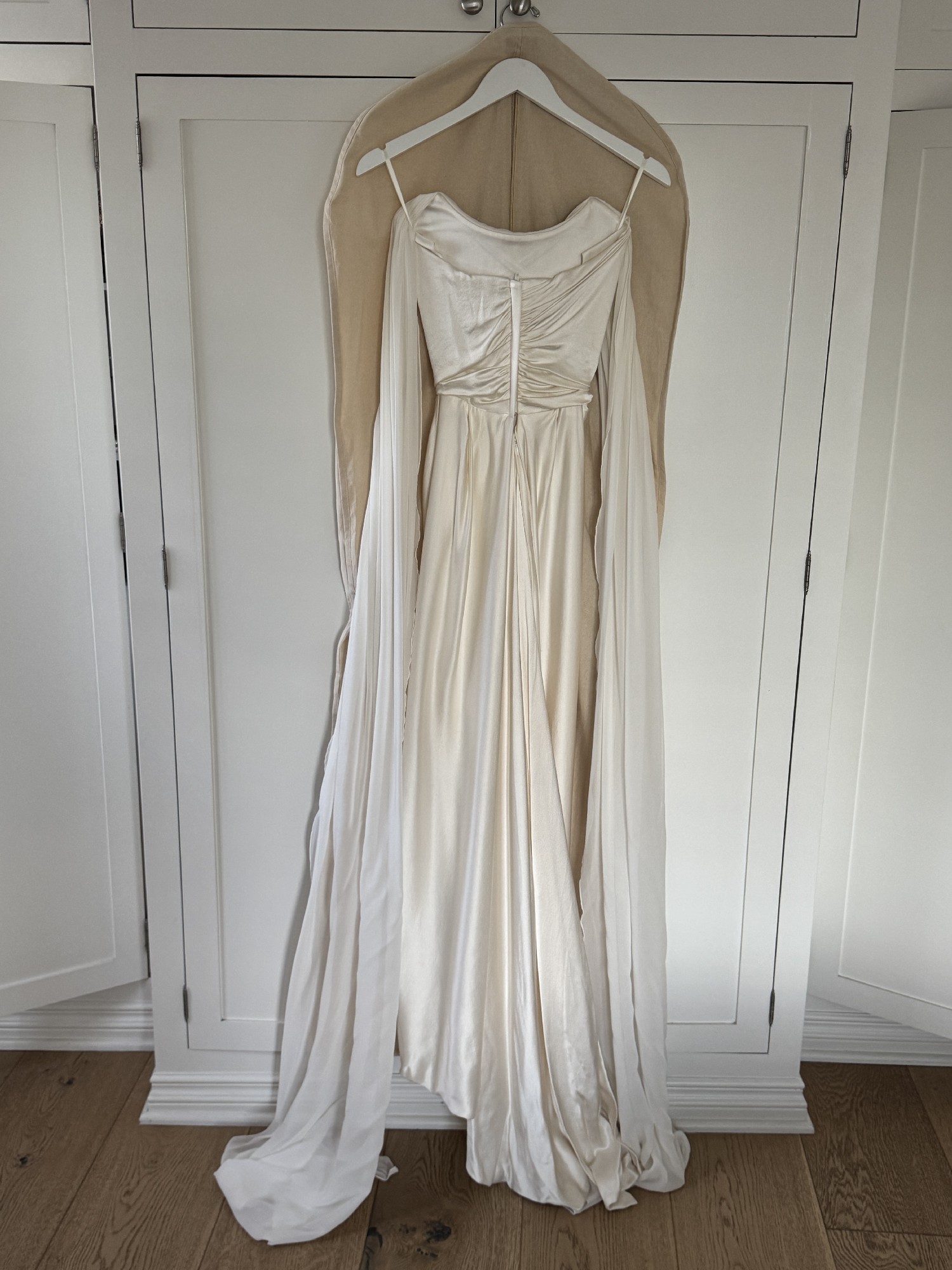 Purchased in August 2023. The dress is in excellent condition and has only been worn once. It has been slightly hemmed for height — I am 5'4" (164 cm), and the front hem just touches the floor when worn.