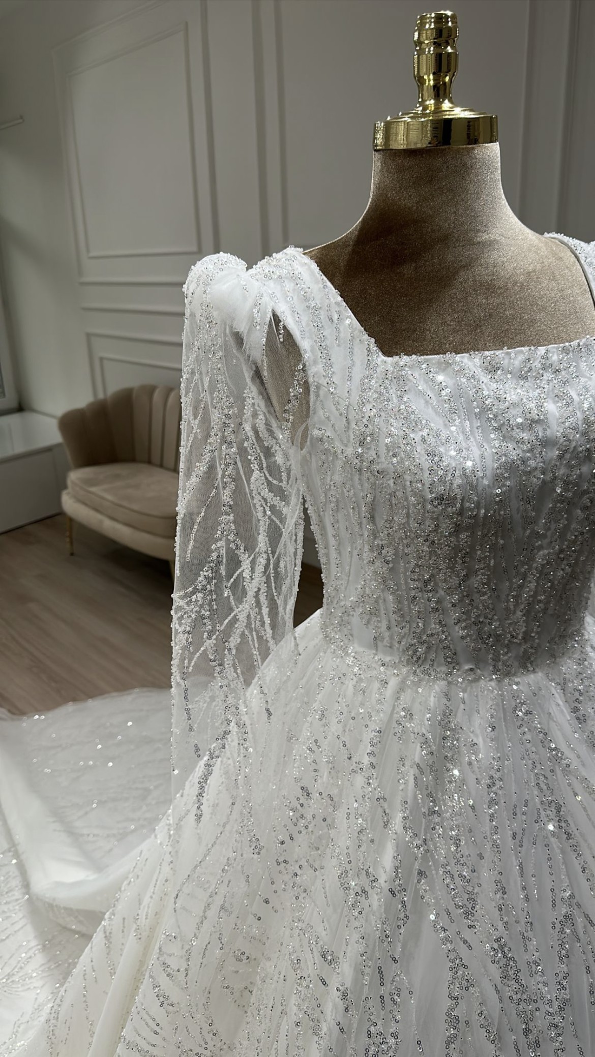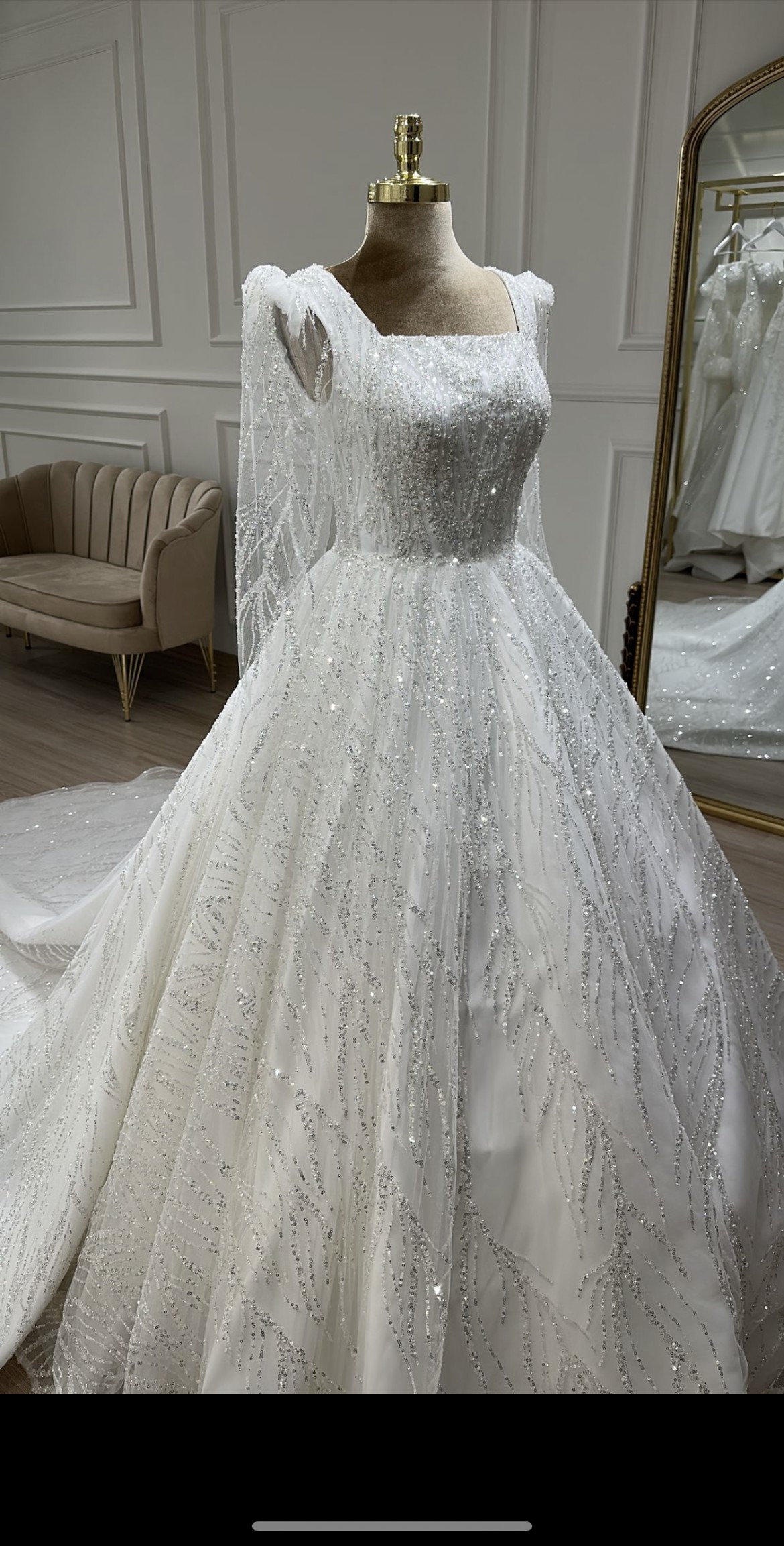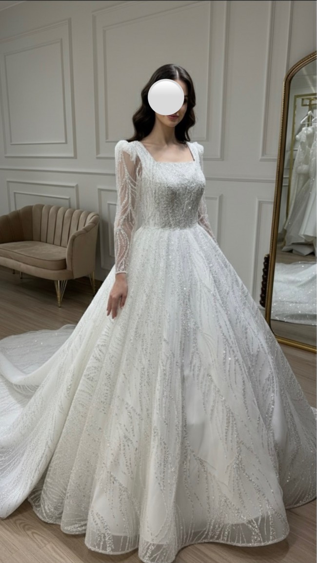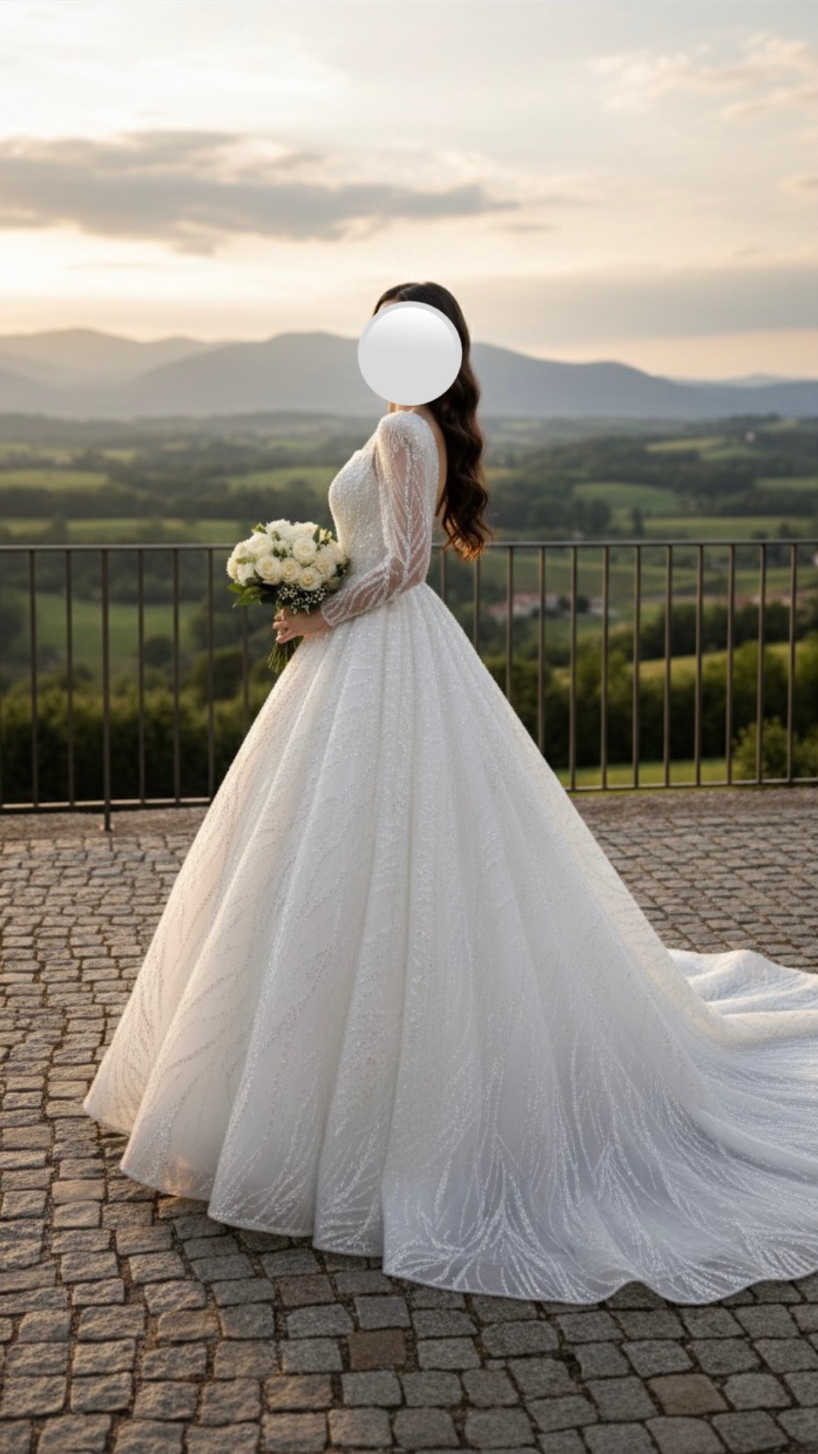 This enchanting ballgown is everything I dreamed of for my special day. The moment I slipped into this size 36 dress, I felt like a true princess. Its stunning square neckline frames the décolletage beautifully, and the long puff sleeves add a touch of timeless elegance while keeping the look effortlessly romantic.