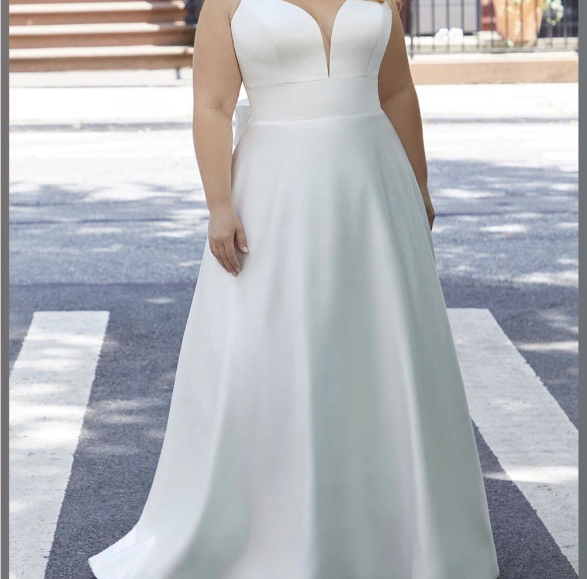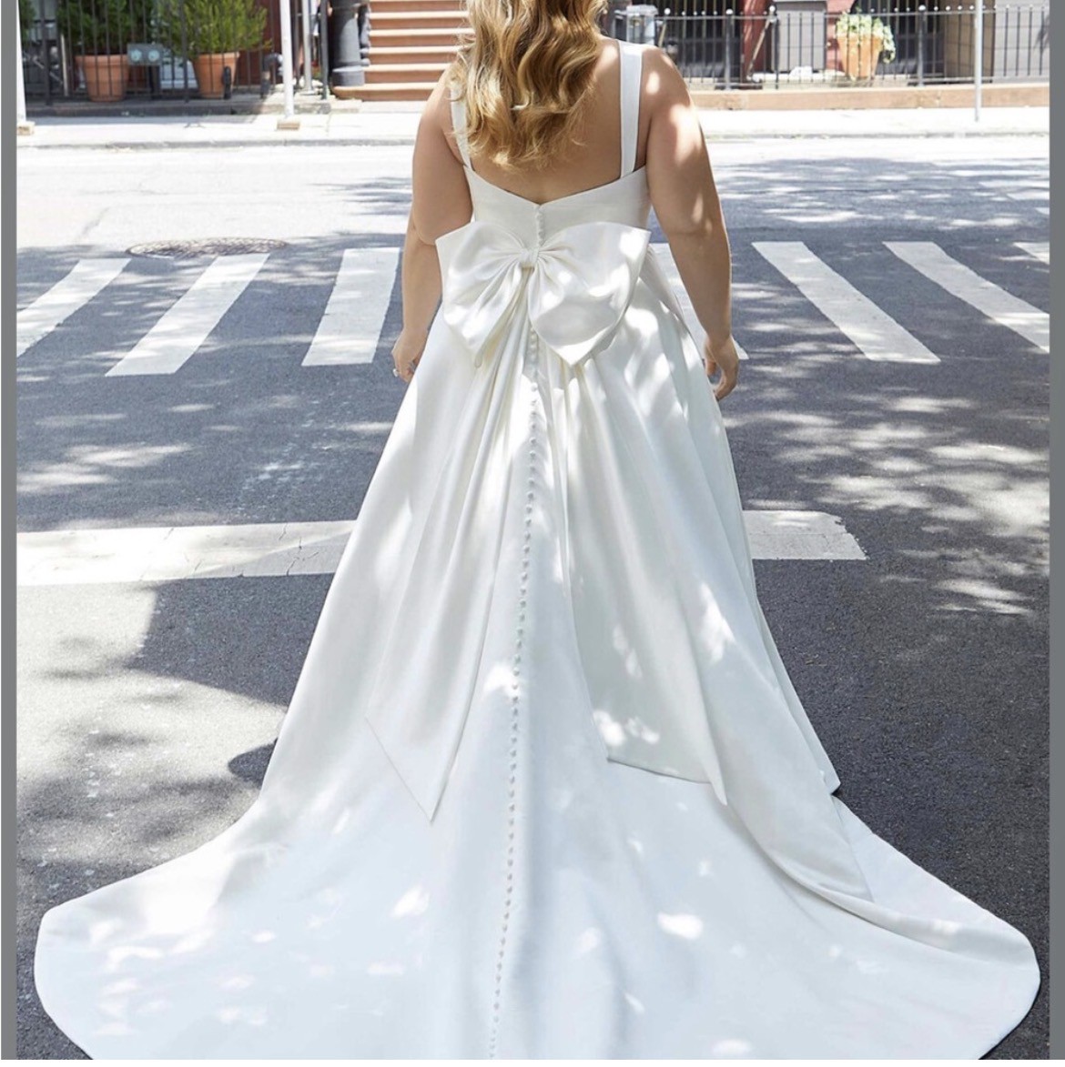 Worn once for ceremony only. Has been professionally cleaned. No stains or rips! Buttons and zipper work perfect. Only alterations were to shorten the length of the dress (I’m [removed] size 28W. Will come in a fabric bag from the bridal shop I purchased from. Has a bustle also.