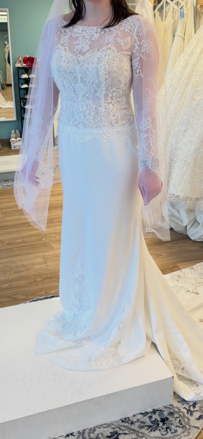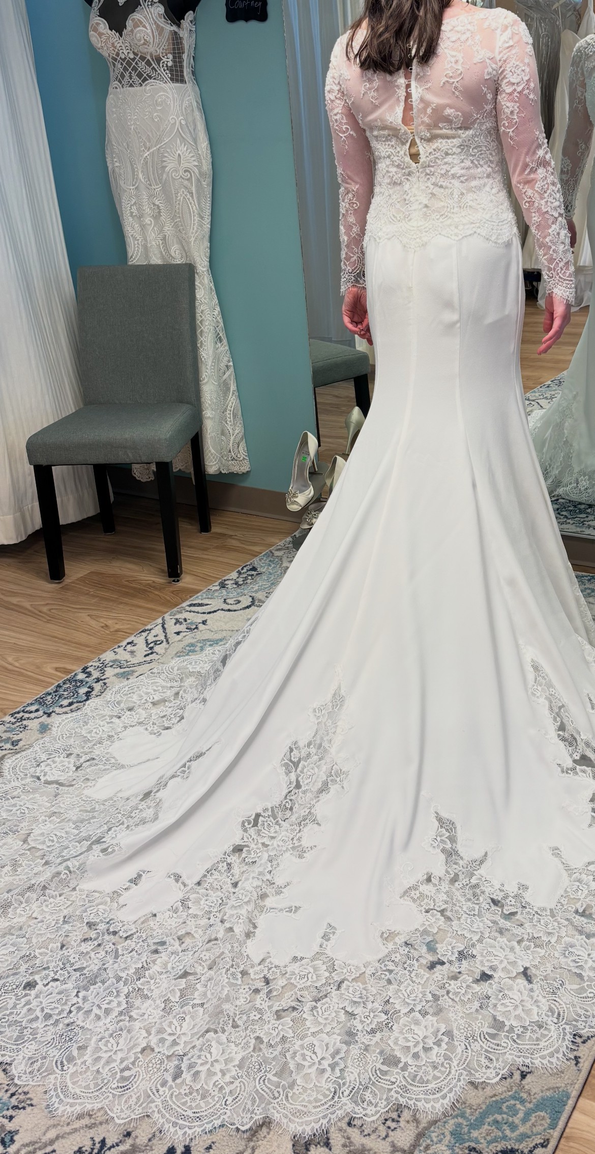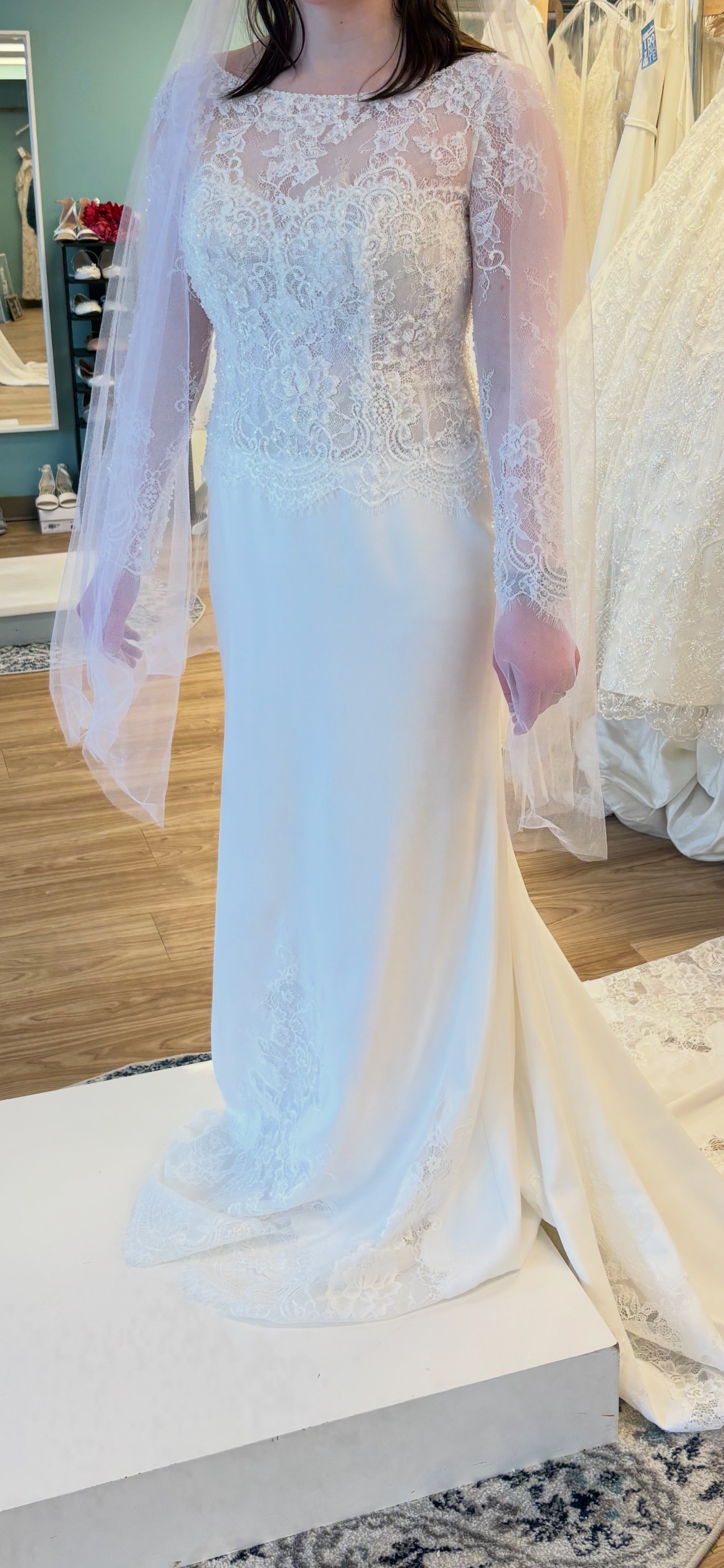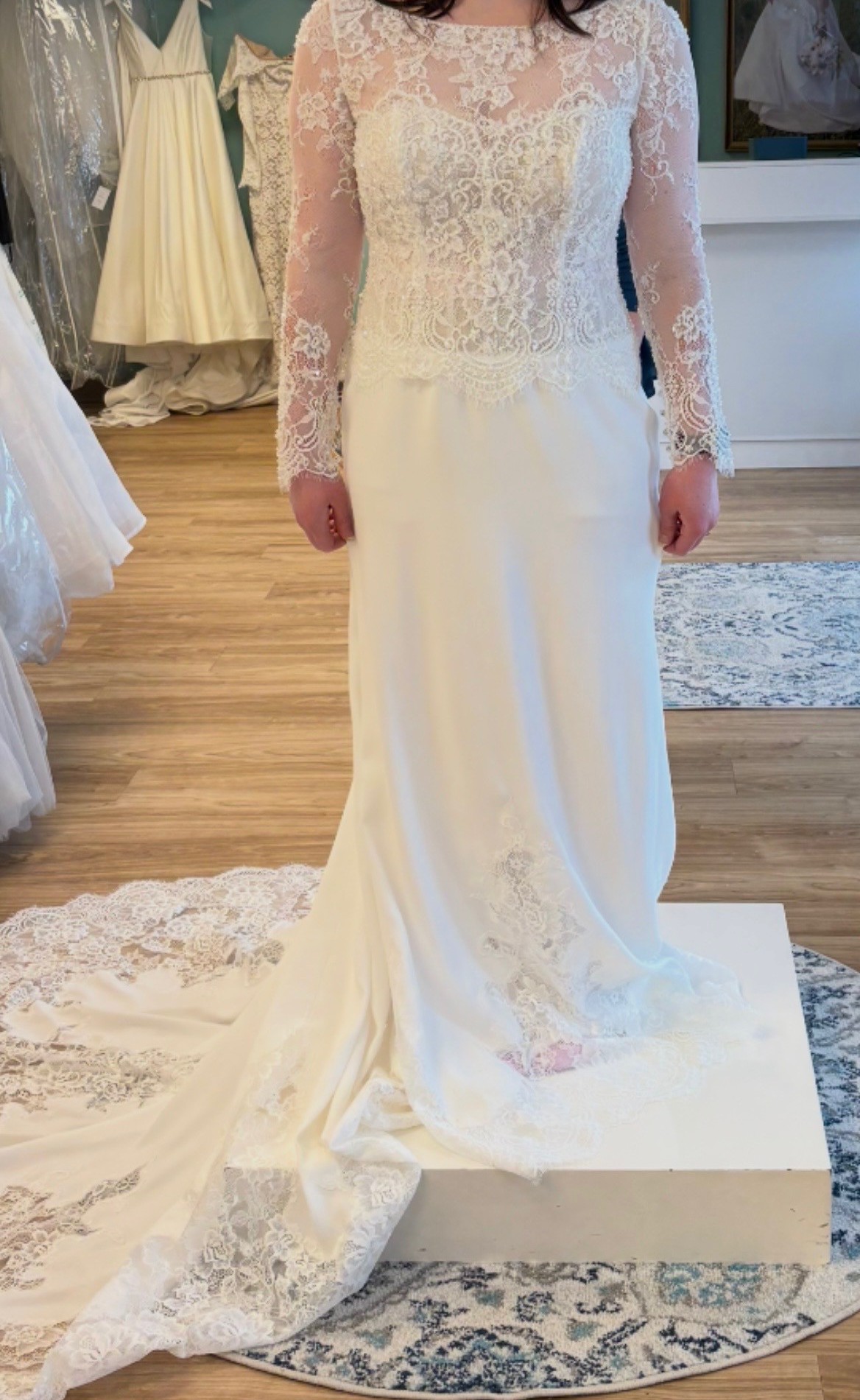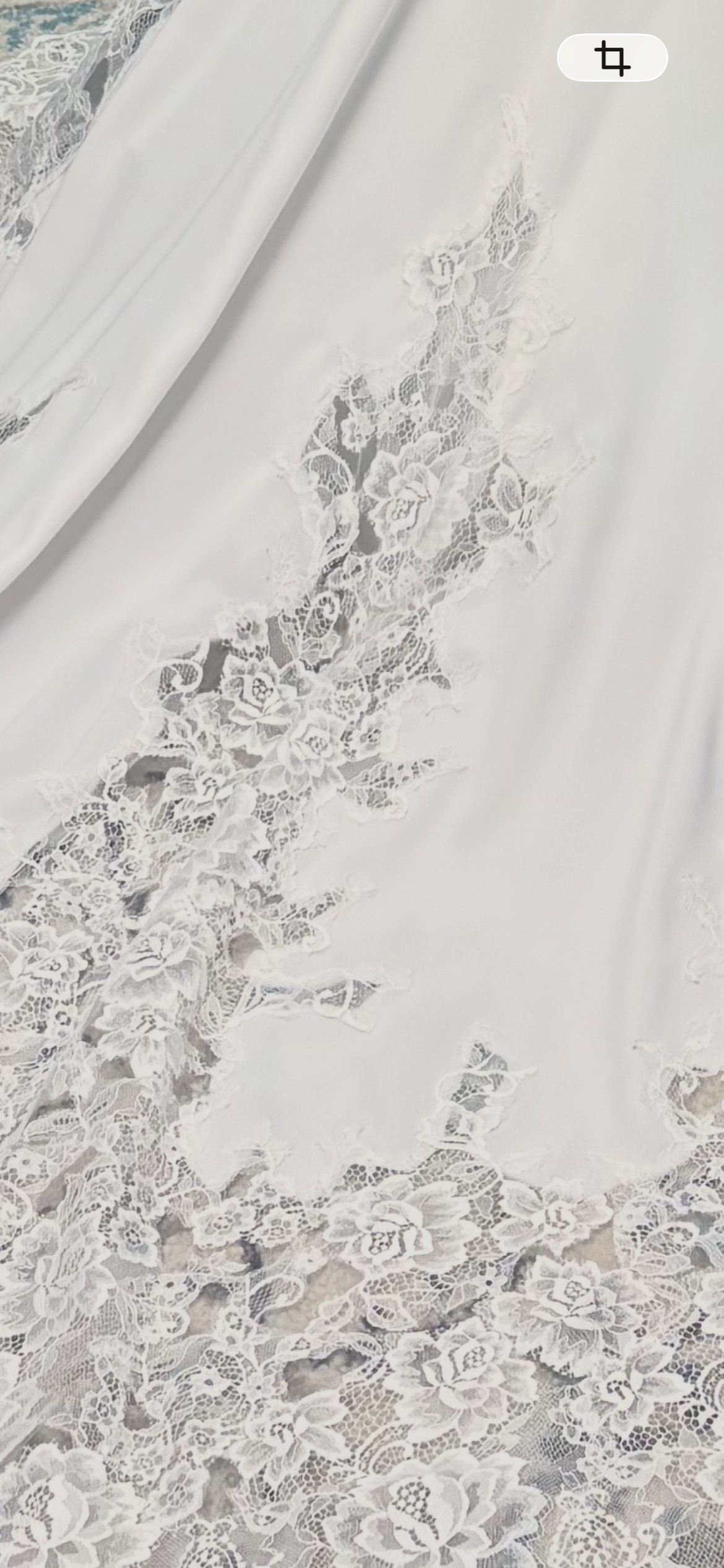 Train: Long crepe train with heavy lace applique at hem