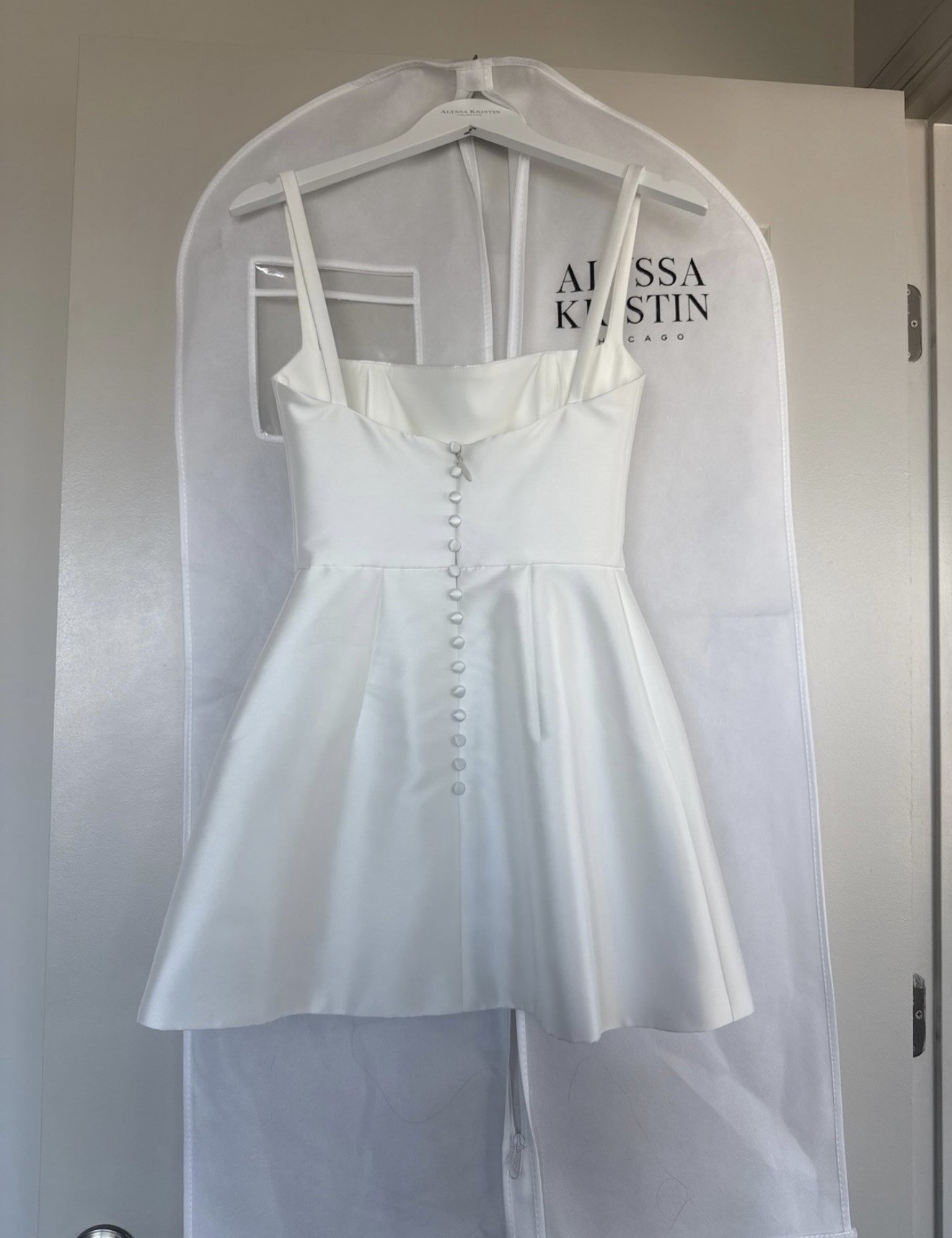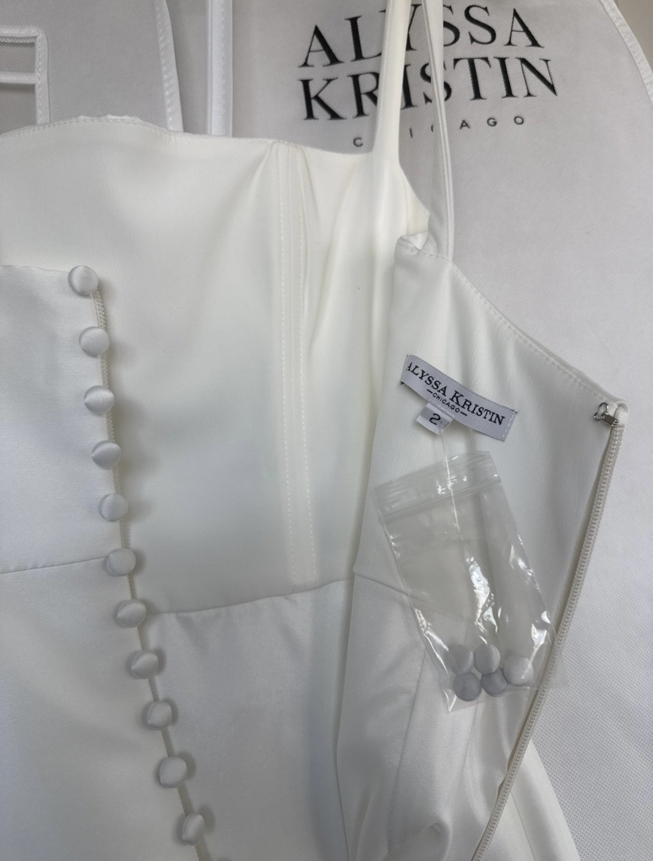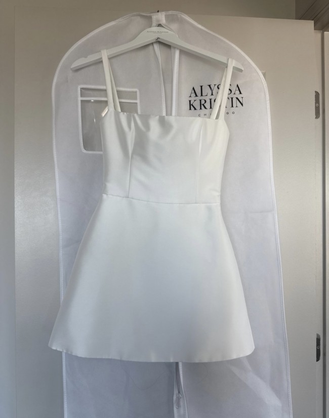 NWT Alyssa Kristin Chicago Designer little white dress - Gemma Mini customized with buttons down the zipper (additional $100 cost). I decided not to use it, so my loss is your gain. It is a size 2 street wear. Comes with dress cover. Feel free to message me with any questions! Total cost was $1,345.00. Description - For the bride who craves refined sophistication, Gemma Mini delivers. Made in our lustrous Spanish Mikado, the square neckline, square backline and thin straps create a sleek silhouette, while a fully boned bodice cinches and supports to perfection. Fit: Fully boned bodice is fitted through the waist. Mini skirt is fitted at the waist and gently flares out. Size: The fabric has no stretch and is intended to be quite fitted. If between sizes on the size chart or you prefer a more relaxed fit, size up and tailor dress. The skirt can accommodate hips up to 3 sizes larger. Skirt Length: Approximately 16" from waist seam to hem Color: Bright Ivory Fabric: Spanish Mikado