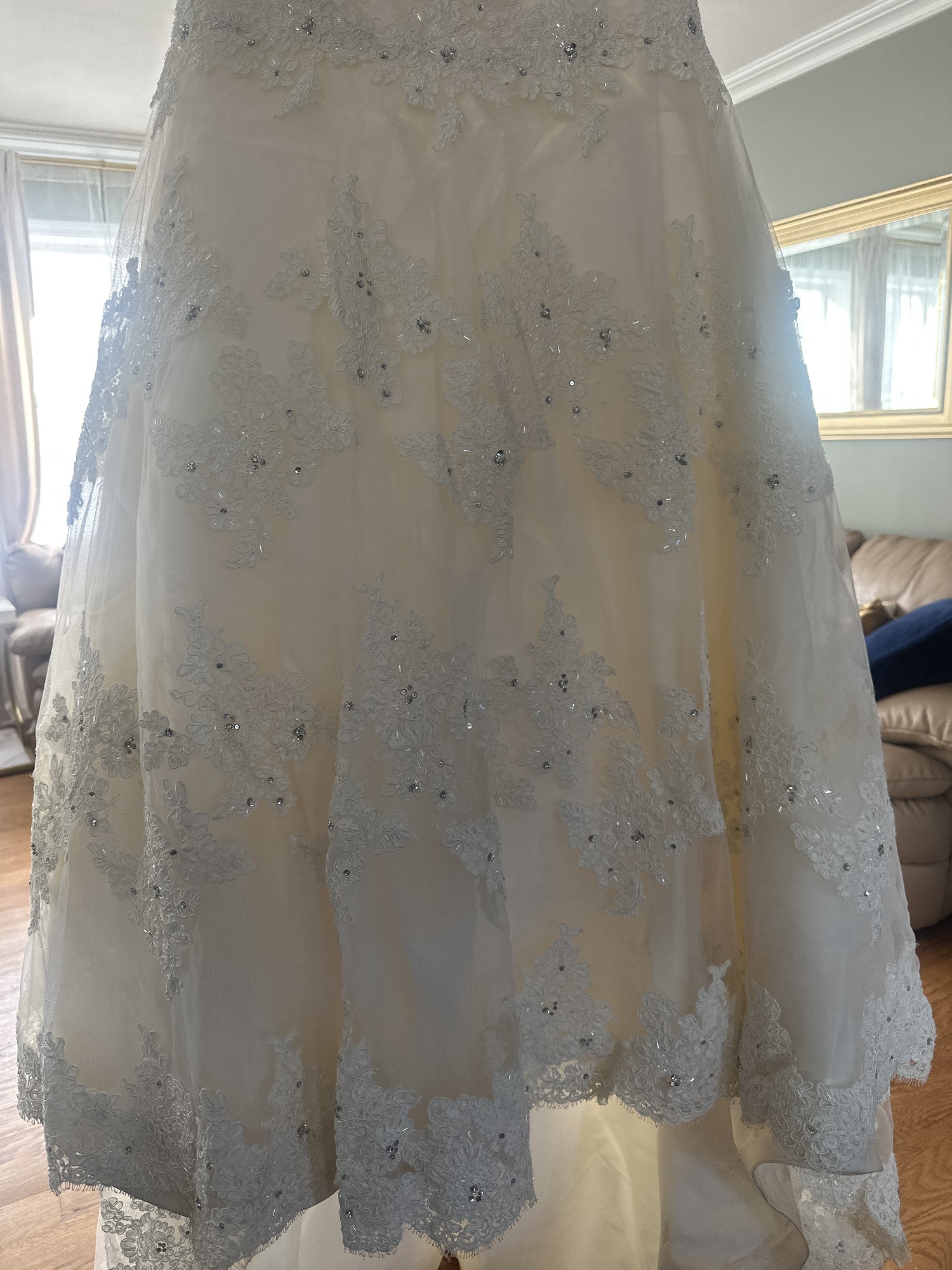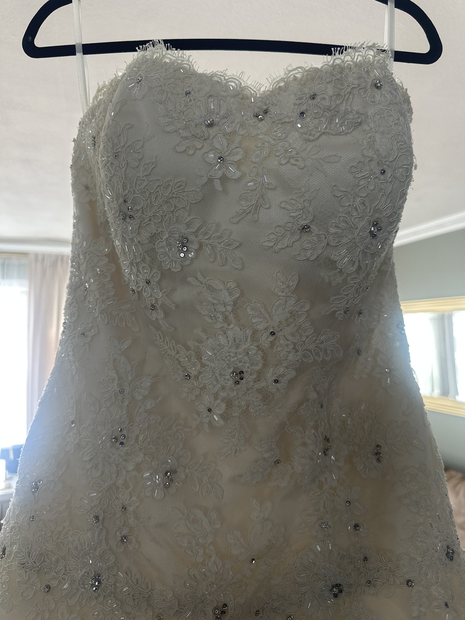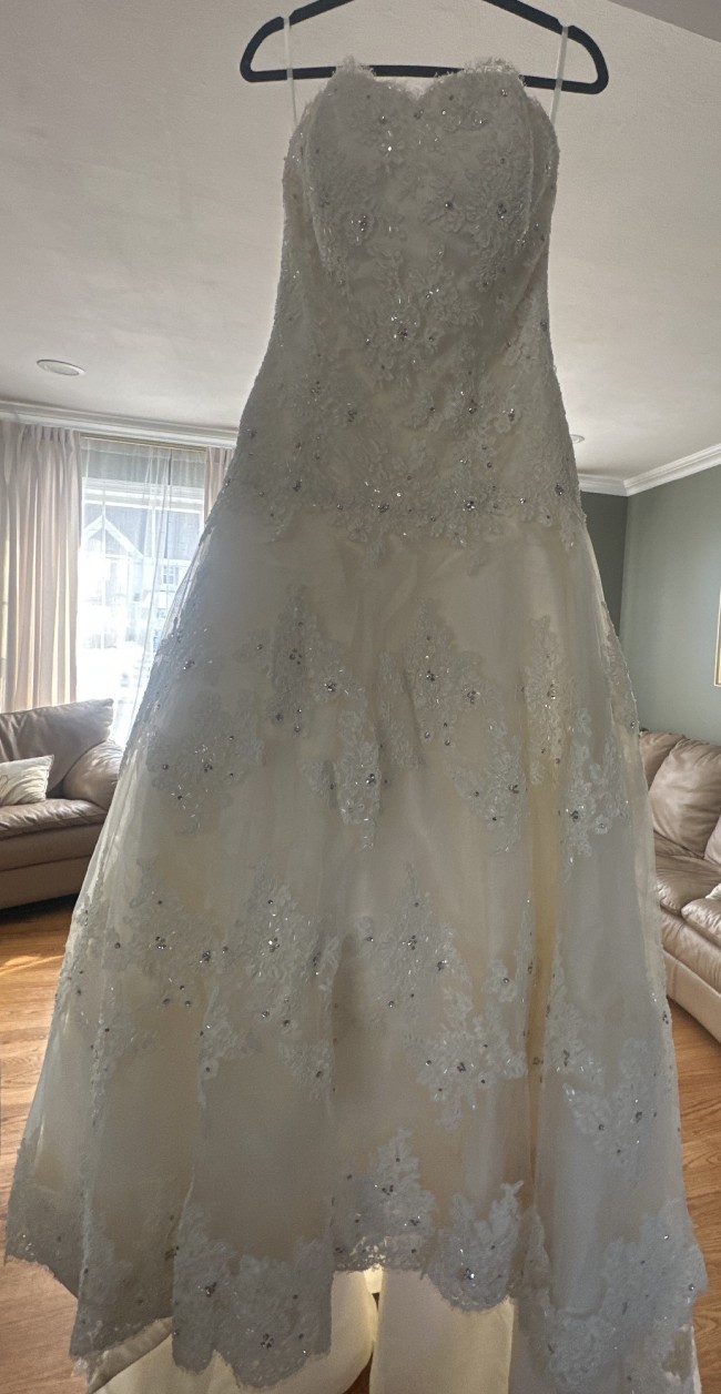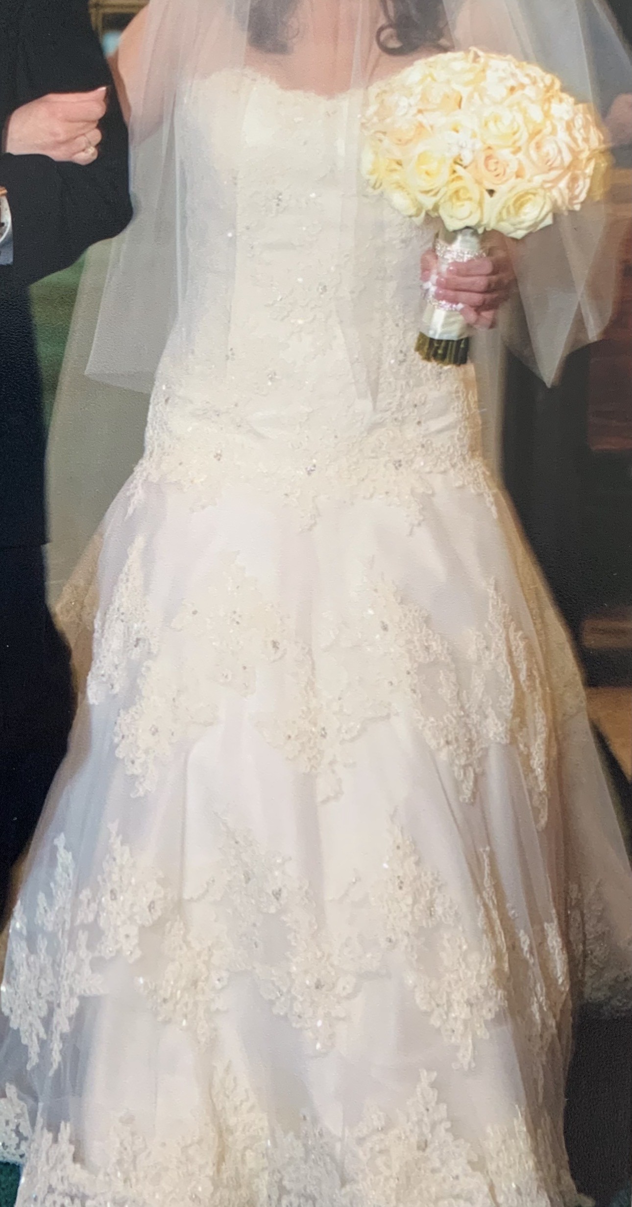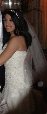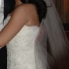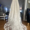 Beautiful EVE OF MILADY lace, embroidered sequin dropped wait gown with train. Comes with cathedral veil sprayed with Swarovski crystals. Cleaned and preserved since worn.
