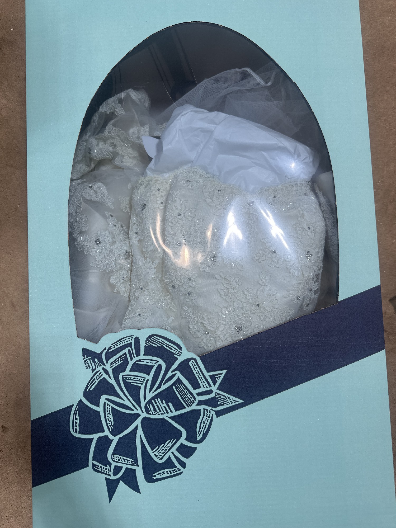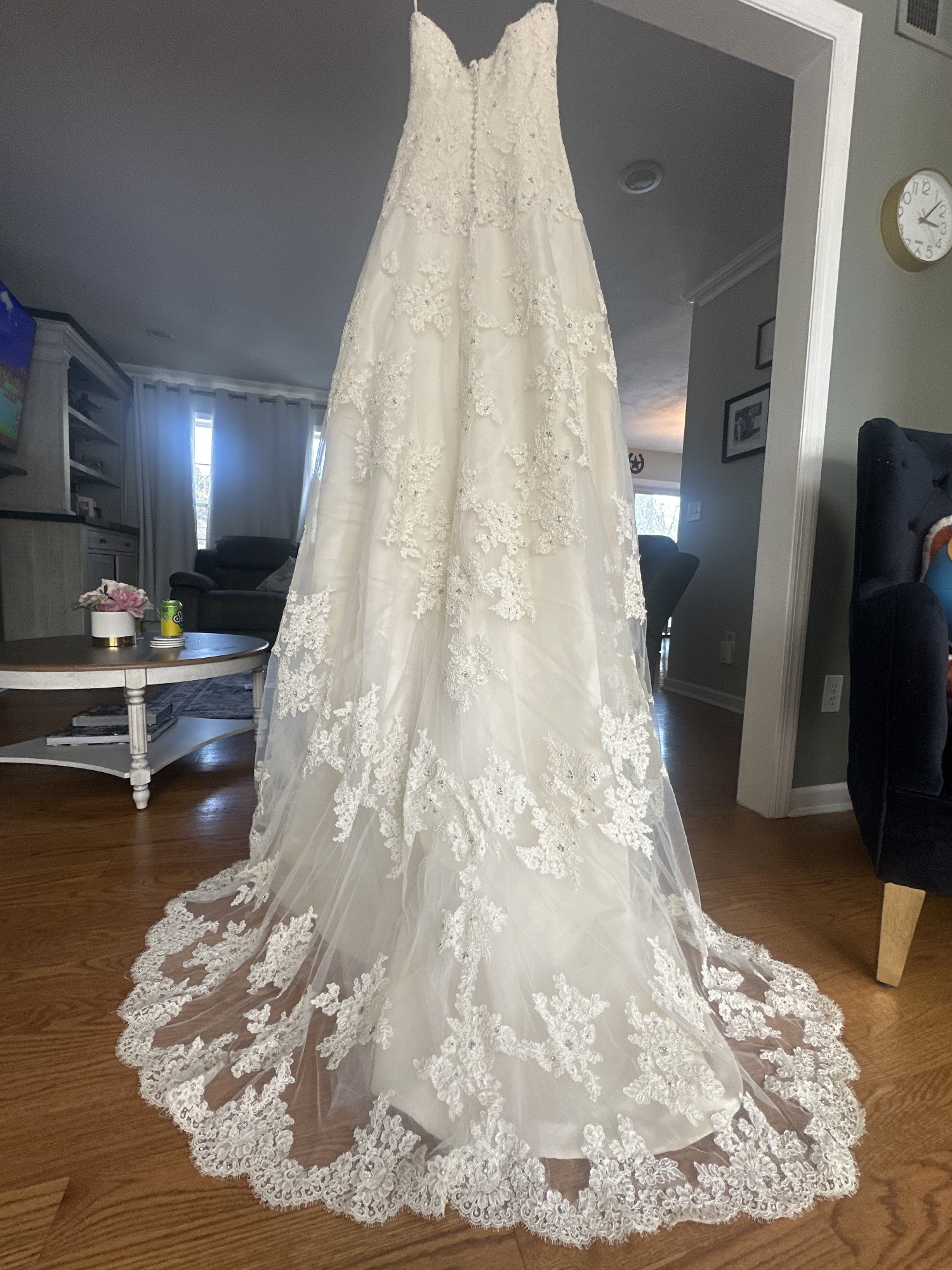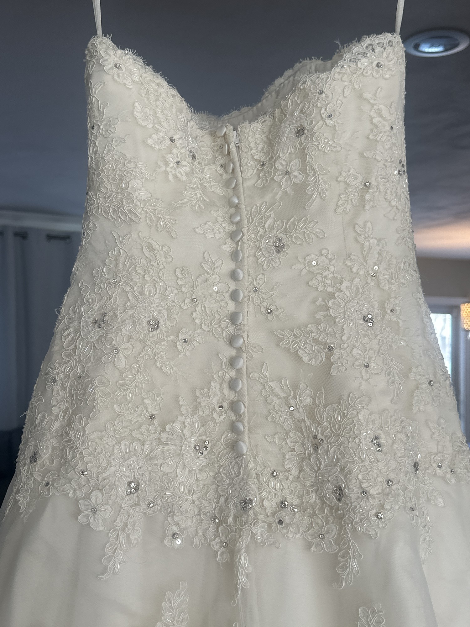 Beautiful EVE OF MILADY lace, embroidered sequin dropped wait gown with train. Comes with cathedral veil sprayed with Swarovski crystals. Cleaned and preserved since worn.